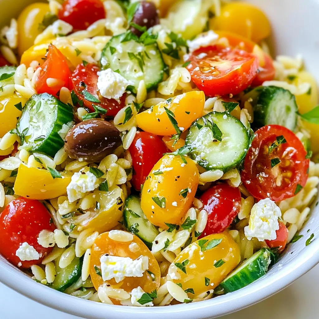 Each ingredient plays a role in making this dish bright and delicious. The orzo offers a soft base, while the veggies add crunch. Feta cheese brings a creamy taste, and olives offer a salty kick.