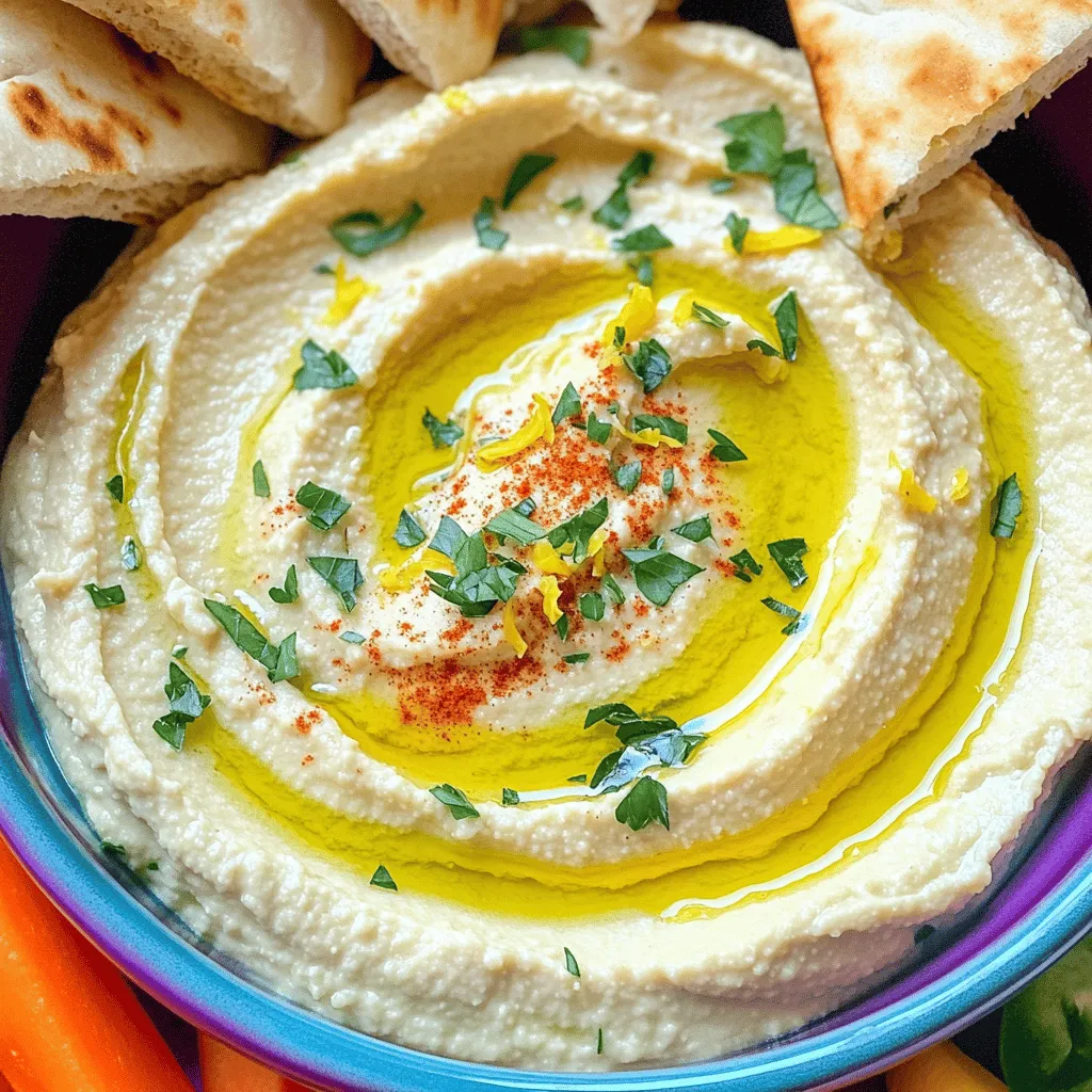 Store leftover hummus in an airtight container. It stays fresh in the fridge for about a week. To serve, drizzle olive oil on top for a nice look. Sprinkle paprika and fresh parsley for color. Hummus pairs well with pita bread or veggie sticks. You can also use it as a spread in sandwiches. Enjoy it with friends or at gatherings!