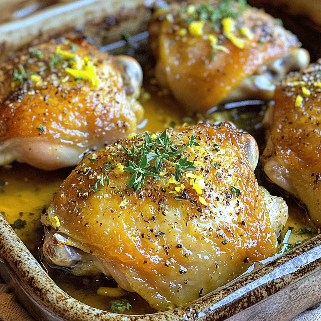 ![- 4 chicken thighs, bone-in and skin-on Using bone-in and skin-on chicken thighs gives you flavor and moisture. The bone adds depth, while the skin crisps up nicely during roasting. This combination makes the meat juicy and tender. - 4 cloves garlic, finely minced - 2 lemons (zest and juice) - 3 tablespoons extra virgin olive oil - 2 teaspoons fresh thyme leaves, picked - 1 teaspoon smoked paprika - Salt and pepper, to taste The marinade is simple yet packed with flavor. Garlic gives a punch, while lemons add brightness. Olive oil keeps everything moist and helps the skin crisp. Fresh thyme brings a lovely aroma, and smoked paprika adds warmth. Don’t forget salt and pepper; they enhance all the flavors. - Fresh parsley, chopped A sprinkle of fresh parsley adds a burst of color and a fresh taste. It’s a great way to finish your dish and make it look beautiful. For the full recipe, you can refer to the entire cooking process for more detailed steps. Start by preheating your oven to 425°F (220°C). This temperature is perfect for roasting chicken thighs. A hot oven helps the skin get crispy while keeping the meat juicy. Next, let’s make the marinade. In a small bowl, mix together: - 4 cloves garlic, finely minced - Zest from 2 lemons - Juice from 2 lemons - 3 tablespoons extra virgin olive oil - 2 teaspoons fresh thyme leaves - 1 teaspoon smoked paprika - Salt and pepper, to taste Stir this mixture well. The smell will be amazing! For the best flavor, let the chicken marinate. You can leave it at room temperature for 30 minutes or in the fridge for up to 2 hours. Now, let's roast the chicken. Place the marinated thighs in a baking dish, skin-side up. This way, the skin will get crispy as it cooks. Put the dish in your preheated oven. Roast the chicken for 35-40 minutes. Use a meat thermometer to check for doneness. The internal temperature should reach 165°F (74°C) in the thickest part of the thigh. For extra crispiness, broil the chicken for the last 2-3 minutes. Just keep a close watch to avoid burning. Once cooked, take the chicken out of the oven and let it rest for 5-10 minutes. This step helps make the chicken tender and juicy. Garnish your dish with fresh parsley and drizzle the pan juices over the top. Enjoy the full recipe for Lemon Garlic Roasted Chicken Thighs! For the best flavor, marinate your chicken thighs for at least 30 minutes. If you have time, refrigerate them for up to 2 hours. This longer marination will help the chicken soak up the bright lemon and bold garlic flavors. To achieve crispy skin, start with high heat. Preheat your oven to 425°F (220°C). Place the chicken thighs skin-side up in the baking dish. This position allows the skin to crisp up nicely while cooking. You can even broil the chicken for the last few minutes to add extra crunch. Using a meat thermometer is key. Check the thickest part of the thigh. The internal temperature should reach 165°F (74°C). This ensures your chicken is safe to eat and juicy. Always trust your thermometer for perfect results. For the complete recipe, check the [Full Recipe]. {{image_4}} You can change the flavor by using different herbs. Thyme works well, but rosemary adds a nice twist. Simply swap thyme for fresh rosemary in the recipe for a more earthy taste. You may also try oregano or basil for a Mediterranean flair. Mixing herbs can make your dish unique. You don’t have to roast in the oven. An air fryer gives you crispy skin and juicy meat in less time. Set the air fryer to 380°F (193°C) and cook for about 20-25 minutes. You can also grill the chicken for a smoky flavor. Just cook over medium heat, turning until they reach 165°F (74°C). Pair this dish with roasted vegetables or a light salad. The bright lemon flavor works well with greens like arugula or spinach. You might also serve it with a creamy garlic sauce or a zesty chimichurri. Each bite will be a burst of flavor. For a full experience, check the Full Recipe for more ideas. To keep your Lemon Garlic Roasted Chicken Thighs fresh, store them in an airtight container. Place the chicken in the fridge within two hours of cooking. Always cover it well to prevent drying out. The chicken lasts up to four days in the fridge. For best results, keep the skin on until serving to retain moisture and crispiness. If you want to save leftovers, freezing is a great option. Wrap each chicken thigh tightly in plastic wrap, then place them in a freezer bag. Remove as much air as possible. Label the bag with the date. Frozen chicken thighs can last up to three months. When you’re ready to eat, thaw them in the fridge overnight for best texture. To reheat, the oven is your best friend. Preheat your oven to 350°F (175°C). Place the chicken thighs on a baking sheet. Cover them with foil to keep moisture in. Heat for about 20-25 minutes or until warm. You can also microwave them, but this may make the skin less crispy. For the best flavor and texture, stick to the oven method. Enjoy your Lemon Garlic Roasted Chicken Thighs even after the first meal! For the full recipe, check out the [Full Recipe]. You can pair this dish with many sides. Some great options are: - Roasted vegetables like carrots and potatoes. - A fresh green salad with light dressing. - Steamed broccoli or green beans for crunch. - Garlic bread to soak up the tasty juices. These sides balance the flavors of the chicken. They also add color to your plate. Yes, you can use boneless chicken thighs. They cook faster than bone-in thighs. - Expect to reduce your cooking time by about 10-15 minutes. - Boneless thighs may not get as crispy as those with skin. - They can be just as juicy and flavorful if cooked right. Check a few signs to know your chicken is ready: - The skin should be golden brown and crisp. - Juices should run clear when you cut into the meat. - Use a meat thermometer to check the internal temperature. It should be at least 165°F (74°C). These signs ensure your chicken is safe and tas