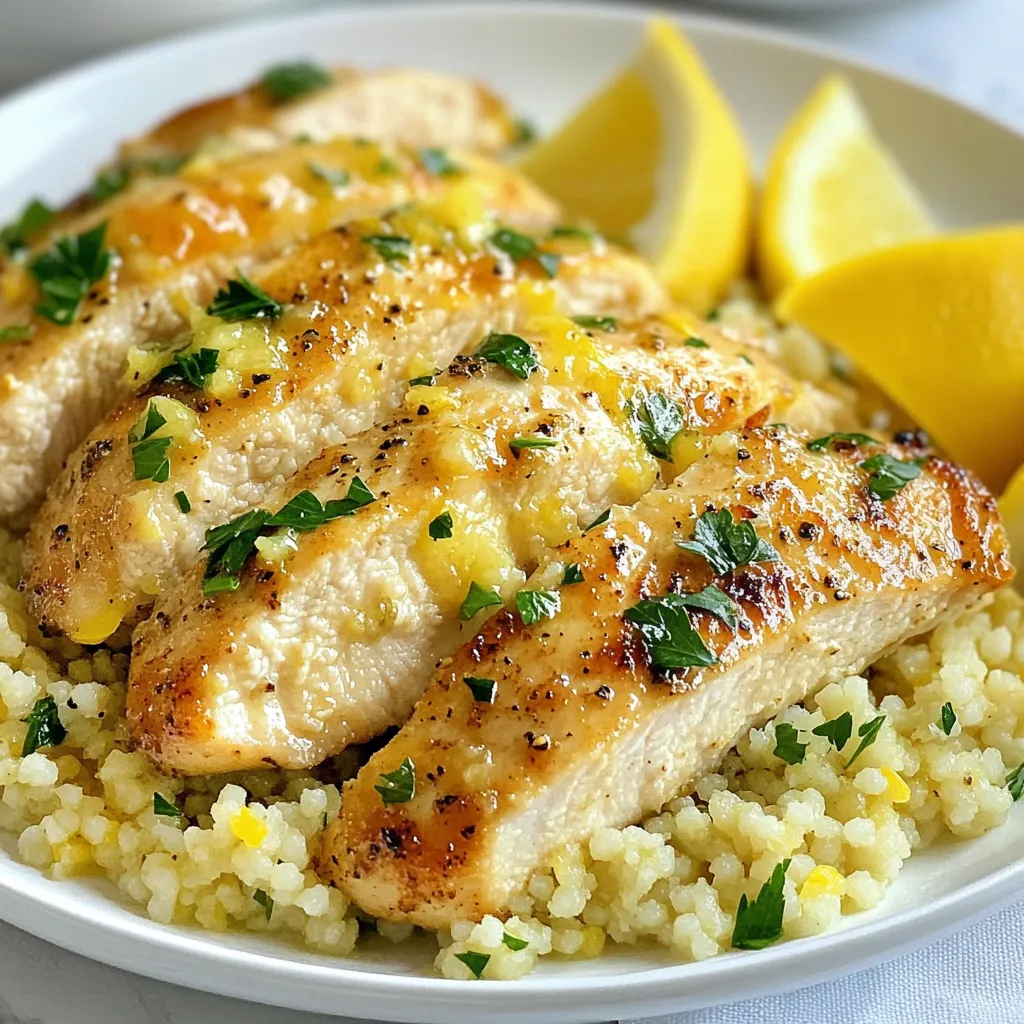 • Layer the sliced chicken on top of a generous bed of lemon herb couscous. Garnish with extra chopped parsley and lemon wedges for a burst of freshness and color. Serve immediately for a delightful, bright presentation.