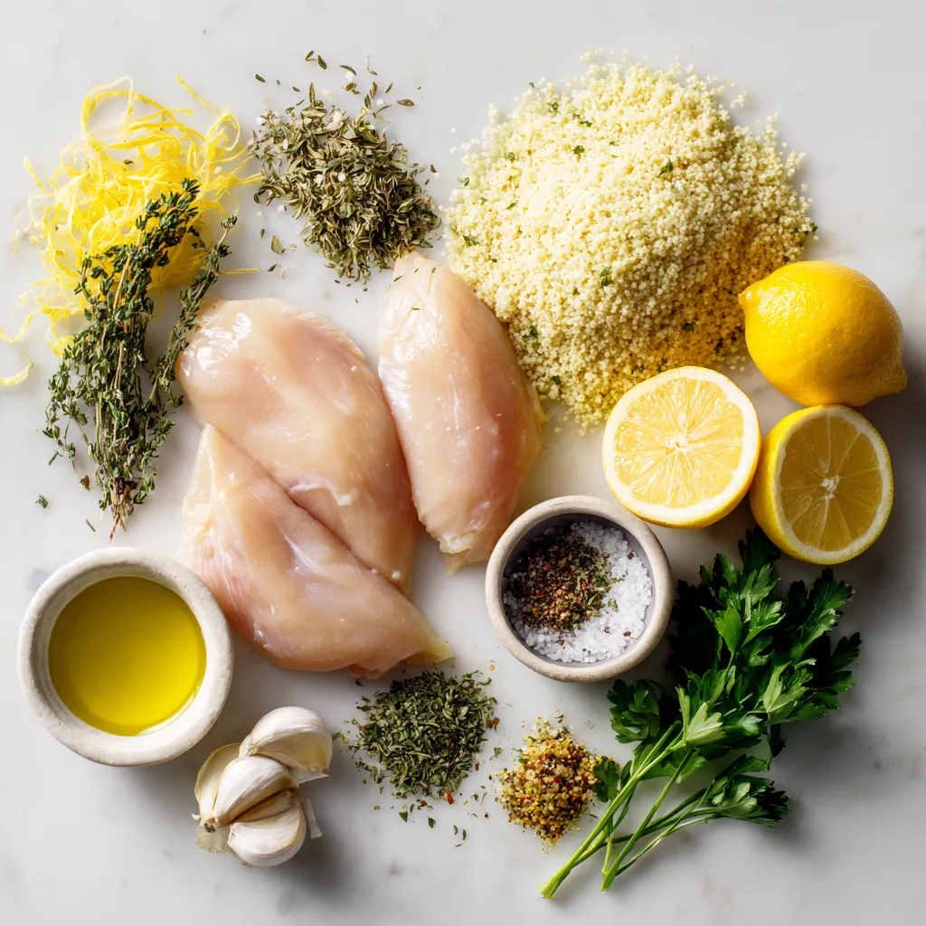 The main ingredients in this dish create a bright and zesty flavor. The chicken provides protein, while couscous adds a nice texture. Lemon zest and juice give it a refreshing kick. Garlic, herbs, and spices enhance the overall taste.