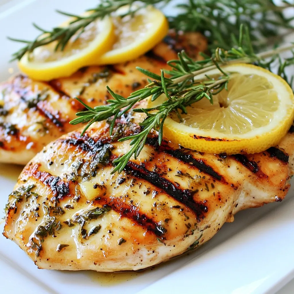 To make Lemon Herb Grilled Chicken, you need these main ingredients: - 4 boneless, skinless chicken breasts - 1/4 cup freshly squeezed lemon juice - 1/4 cup extra virgin olive oil - 3 cloves garlic, finely minced - 2 tablespoons fresh rosemary, finely chopped - 2 tablespoons fresh thyme, finely chopped - 1 teaspoon sea salt - 1/2 teaspoon freshly ground black pepper - Zest of 1 lemon These ingredients bring a bright and fresh taste to your chicken. The lemon juice adds tang, while the herbs give a lovely aroma. You will need some basic tools to prepare this dish: - A spacious mixing bowl - A whisk for mixing the marinade - A resealable plastic bag or shallow dish for marinating - A grill for cooking the chicken - A meat thermometer to check the chicken's doneness Having these tools ready makes the cooking process smooth and easy. You can also try these optional ingredients for extra flavor: - A pinch of red pepper flakes for heat - Honey for a touch of sweetness - Fresh parsley for garnish These additions can enhance the taste and look of your Lemon Herb Grilled Chicken. Experiment and find what you like best! {{ingredient_image_2}} To start, gather your ingredients. You need fresh lemon juice, olive oil, garlic, rosemary, thyme, sea salt, black pepper, and lemon zest. In a large bowl, mix these ingredients. Whisk them well until combined. This marinade will bring great flavor to your chicken. Next, take your chicken breasts and place them in a resealable bag or a shallow dish. Pour the marinade over the chicken. Make sure each piece is covered well. Seal the bag or cover your dish. Now, let it sit in the fridge for at least 30 minutes. For even better taste, marinate for up to 4 hours. This step helps the chicken soak up all the delicious flavors. When you are ready to grill, heat your grill to medium-high. Remove the chicken from the marinade. Let any extra marinade drip off before placing it on the grill. Discard the leftover marinade to keep things safe. Grill the chicken for about 6-7 minutes on each side. You want it to reach an internal temperature of 165°F (75°C). Once done, take it off the grill and let it rest for 5 minutes. This helps keep the chicken juicy. Serve it warm, garnished with lemon slices and fresh herbs. Enjoy your flavorful and juicy meal! To grill chicken perfectly, preheat your grill to medium-high heat. This step is vital. A hot grill gives you nice grill marks and a great sear. Place the chicken on the grill and avoid moving it too much. Let it cook for 6-7 minutes on each side. This ensures even cooking and keeps the juices inside. Always check the internal temperature. It should reach 165°F to be safe to eat. To get the best flavor, use fresh herbs and lemon juice. Fresh rosemary and thyme add a nice touch. Don’t skip the lemon zest; it boosts the citrus taste. Marinate the chicken for at least 30 minutes, but 4 hours is even better. This time allows the flavors to soak in deeply. Always discard any leftover marinade to stay safe. To keep the chicken juicy, let it rest after grilling. Rest the chicken for 5 minutes before cutting it. This time allows the juices to settle back into the meat. Cutting too soon can let the juices run out. If you follow these tips, you will enjoy a flavorful and juicy meal. Pro Tips Marinate Longer for Flavor: The longer you marinate the chicken, the more flavorful it will be. Aim for at least 2 hours for the best results. Check the Grill Temperature: Ensure your grill is preheated properly to avoid sticking and to achieve perfect grill marks. Let it Rest: Allowing the chicken to rest after grilling helps retain its juices, making it more tender and flavorful. Use a Meat Thermometer: To ensure food safety, use a meat thermometer to check that the internal temperature reaches 165°F (75°C). {{image_4}} You can mix and match herbs to change the flavor. Try using fresh basil or parsley instead of rosemary. Oregano also adds a nice twist. Each herb brings its own taste. Feel free to use dried herbs if fresh ones are hard to find. Just remember, dried herbs are stronger, so use less. Switching up the marinade can lead to new flavors. Instead of lemon juice, try lime juice for a zesty kick. You can also add honey for a sweet touch. For a spicy option, mix in some red pepper flakes. Experimenting with different oils, like sesame oil, can also change the taste. Grilling is great, but there are other ways to cook the chicken. You can bake it in the oven at 375°F (190°C) for about 25-30 minutes. This keeps the chicken juicy and tender. Another option is pan-searing in a skillet with a little oil. This method gives a nice crust while keeping the inside moist. You can even use an air fryer for a quick and healthier option, cooking at 360°F (180°C) for 15-18 minutes. To store leftover Lemon Herb Grilled Chicken, let it cool to room temperature. Place the chicken in an airtight container. Keep it in the fridge for up to three days. Make sure it’s sealed well to avoid drying out. When you are ready to eat, you can reheat the chicken. Use a microwave for quick warming. Heat it in short bursts, about 30 seconds at a time. You can also use an oven. Set it to 350°F (175°C) and warm the chicken for about 10-15 minutes. Cover it with foil to keep it moist. If you want to keep the chicken longer, freeze it. Wrap each piece tightly in plastic wrap. Then place them in a freezer bag. Squeeze out as much air as possible. The chicken can stay in the freezer for up to three months. When ready to eat, thaw it in the fridge overnight before reheating. Yes, you can use bone-in chicken. Bone-in chicken adds more flavor and moisture. Adjust the grilling time to ensure it's cooked through. Aim for an internal temperature of 165°F (75°C) to stay safe. The bone can help keep the meat juicy during cooking. Just be aware that bone-in cuts may take longer to cook. Lemon Herb Grilled Chicken pairs well with many dishes. Here are some great sides: - Gri