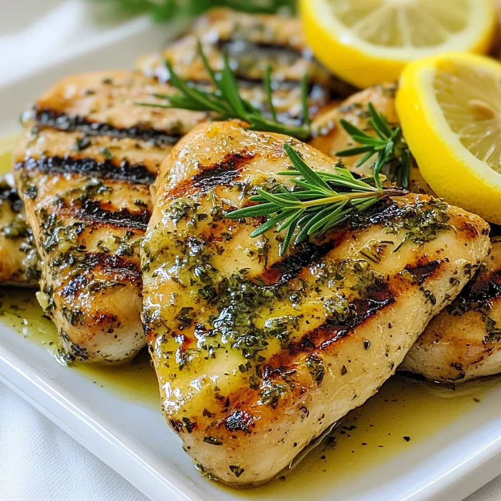 - 4 boneless, skinless chicken breasts - 3 tablespoons extra virgin olive oil - Zest from 2 vibrant lemons - 1/4 cup freshly squeezed lemon juice - 3 cloves of garlic, finely minced - 1 tablespoon fresh rosemary, finely chopped - 1 tablespoon fresh thyme, finely chopped - 1 tablespoon fresh parsley, finely chopped - Sea salt and freshly cracked black pepper, to taste - Lemon slices, for an elegant garnish To make Lemon Herb Grilled Chicken, gather these ingredients. You need four boneless, skinless chicken breasts. They are easy to grill and stay juicy. You will also need three tablespoons of olive oil and the zest from two bright lemons. This zest adds a fresh kick. Next, juice those lemons to get 1/4 cup of lemon juice. This juice will help tenderize the chicken. You want three cloves of garlic, finely minced, for flavor. Fresh herbs are key too! Grab a tablespoon each of rosemary, thyme, and parsley. These herbs add a great aroma and taste. Lastly, don’t forget sea salt and black pepper. These seasonings will enhance all the flavors. Lemon slices make a nice touch for garnish. With all these items, you are set for a delicious grilled chicken dish! {{ingredient_image_2}} Start by gathering your ingredients. You will need olive oil, lemon zest, lemon juice, minced garlic, and fresh herbs. In a spacious mixing bowl, whisk together the olive oil, lemon zest, lemon juice, minced garlic, chopped rosemary, thyme, parsley, sea salt, and black pepper. This will create a bright and aromatic marinade that infuses the chicken with flavor. Marinating time is key. I recommend letting the chicken soak for at least 30 minutes. If you have more time, marinate for up to 2 hours. This allows the chicken to absorb all the wonderful flavors. Now, gently place the chicken breasts into the marinade. Make sure each piece is thoroughly coated. This is where the magic happens! Cover the bowl with plastic wrap and place it in the refrigerator. The cold makes the chicken tender and juicy as it soaks in all those flavors. Before grilling, preheat your grill to a medium-high setting, aiming for about 400°F (200°C). This temperature helps achieve that perfect char. After marinating, remove the chicken from the bowl. Let any excess marinade drip off. Discard the leftover marinade to stay safe from germs. Place the chicken breasts on the grill. Cook each side for approximately 6-7 minutes. You know it’s done when the internal temperature hits 165°F (75°C) and you see those nice grill marks. Once grilled, transfer the chicken to a plate and let it rest for 5 minutes. This is an important step. It helps keep the chicken juicy. Serve it with fresh lemon slices and a sprinkle of herbs for a beautiful finish! To keep your chicken juicy, let it rest after grilling. This step is key. When you rest the chicken, the juices settle back inside. If you skip this, the juices run out when you cut it. Always check the internal temperature. Use a meat thermometer for accuracy. You want the chicken to reach 165°F (75°C). This temperature ensures safety and keeps your chicken moist. To achieve those eye-catching grill marks, preheat your grill well. A hot grill helps create those beautiful lines. Remember to oil the grill grates lightly before placing the chicken on it. Timing each side is crucial. Grill each piece for about 6-7 minutes. Avoid flipping too often. Let the chicken sear before turning. For a lovely finish, garnish your grilled chicken with fresh lemon and herbs. This adds color and flavor. Place lemon slices on top or around the chicken for a bright look. Serve your chicken with a side of grilled veggies or quinoa. This makes a balanced meal. You can also pair it with a fresh salad for a light option. Pro Tips Marinate Longer for Deeper Flavor: Allow the chicken to marinate for up to 2 hours for a more robust flavor, allowing the herbs and lemon to truly penetrate the meat. Let the Chicken Rest: After grilling, let the chicken rest for 5 minutes before slicing. This helps the juices redistribute, ensuring moist, tender chicken. Check Internal Temperature: Use a meat thermometer to ensure the chicken reaches an internal temperature of 165°F (75°C) for safe consumption and optimal juiciness. Experiment with Herbs: Feel free to mix and match different fresh herbs based on your preference, such as basil or oregano, to create a unique flavor profile. {{image_4}} You can change up the marinade for lemon herb grilled chicken easily. One great option is to use other citrus fruits. Think about oranges or limes. They can add a unique twist to the flavor. Just swap the lemon juice and zest for the other fruit. Another fun idea is to add spice blends. Try using paprika or cumin. These spices can give your chicken a warm kick. You can even mix in some chili powder for more heat. If you want to cook the chicken differently, try oven-baking. Preheat your oven to 400°F (200°C). Place the marinated chicken on a baking sheet. Bake for about 25-30 minutes. This method keeps the chicken juicy and tender. You can also skewer the chicken for kabobs. Cut the chicken into cubes and thread them onto skewers. Grill them for a fun, easy-to-eat meal. This is perfect for parties or summer cookouts. Now, let’s think about side dishes. A fresh vegetable salad pairs well with grilled chicken. You can use mixed greens, cherry tomatoes, and cucumber. Drizzle with olive oil and lemon juice for a light dressing. For grains, consider serving rice or quinoa. Both are great options that complement the chicken’s flavors. You can even add herbs to the grains for more taste. Give your meal a colorful and healthy boost! After enjoying your lemon herb grilled chicken, store any leftovers properly. Place the chicken in an airtight container. It will keep well in the fridge for up to four days. To help maintain moisture, seal it tightly. When you reheat, do so gently to avoid drying it out. You can use the microwave or a skillet on low heat to warm