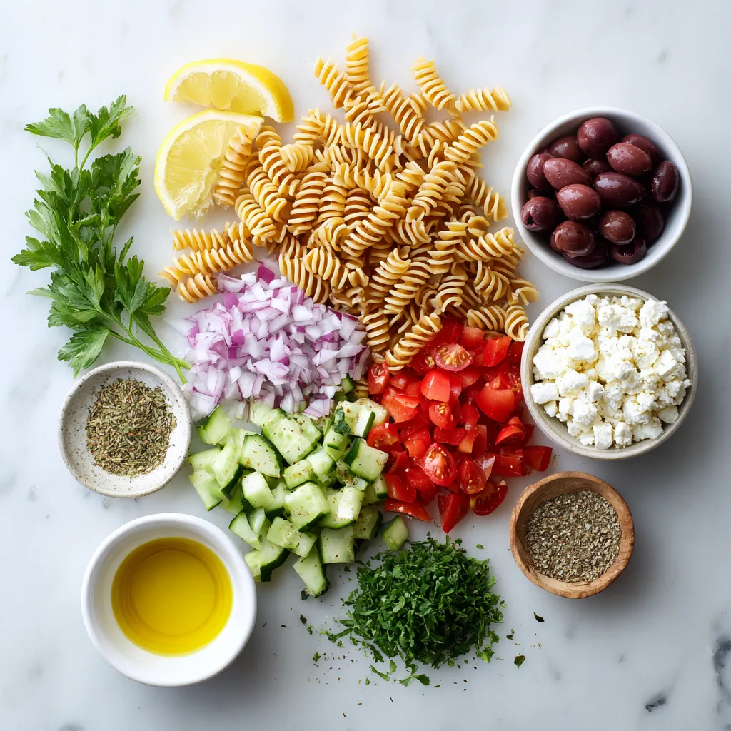 To make Lemony Greek Pasta Salad, gather these simple ingredients: