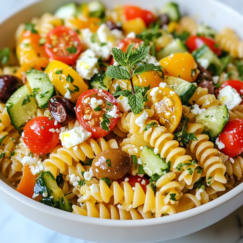 A refreshing and vibrant pasta salad featuring whole wheat pasta, fresh vegetables, Kalamata olives, and feta cheese, all tossed in a zesty lemon dressing.