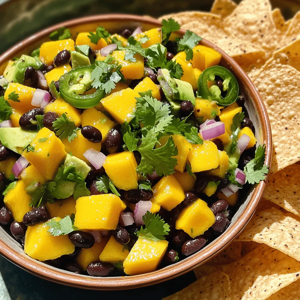 - 1 ripe mango, expertly diced into small cubes - 1 ripe avocado, diced with care to maintain its shape - 1 cup canned black beans, thoroughly rinsed and drained - 1/2 medium red onion, finely chopped for a burst of flavor - 1 jalapeño, deseeded and minced for a kick of heat - 1/4 cup fresh cilantro, chopped to add freshness - Juice of 2 limes, freshly squeezed for brightness - 1 tablespoon extra virgin olive oil to enhance richness - Salt and freshly cracked pepper to taste Fresh ingredients make this salsa shine. The ripe mango adds sweetness, while the avocado brings creaminess. Each component plays a role in flavor and texture. Fresh cilantro adds a burst of green. Fresh lime juice brightens every bite. Using canned black beans keeps prep simple but tasty. When you choose fresh, you boost flavor and nutrition. This salsa packs a nutritional punch. Mangoes are rich in vitamins A and C. Avocados provide healthy fats and fiber. Black beans add protein and iron. One serving offers a good blend of nutrients. This dish is colorful and healthy. It fits well into many diets. Enjoying it means fueling your body with good stuff. First, gather all your ingredients. You need a ripe mango, a ripe avocado, canned black beans, a red onion, a jalapeño, fresh cilantro, limes, olive oil, salt, and pepper. Dice the mango and avocado into small cubes. Be gentle with the avocado; you want it to stay intact. Rinse the black beans well and drain them. Chop the red onion finely and mince the jalapeño after removing the seeds. In a large mixing bowl, add the diced mango and avocado. Next, toss in the black beans, chopped red onion, and minced jalapeño. Make sure everything is mixed evenly. Then, gently fold in the chopped cilantro for a fresh taste. In a small bowl, whisk together the lime juice and olive oil. Pour this mixture over the salsa. Season it with salt and cracked pepper to your liking. Stir gently to mix all the flavors without mashing the fruits. Cover the bowl with plastic wrap or a lid. Let the salsa sit at room temperature for about 10 minutes. This rest time allows the flavors to blend nicely. The lime juice will also help to bring out the taste of each ingredient. After resting, give it a quick stir and taste it again. Adjust seasonings if needed. This step is crucial for a well-balanced salsa. When choosing mangoes, look for ones that feel slightly soft. They should not be mushy. A ripe mango has a sweet smell near the stem. For avocados, press gently. They should yield to your touch but not feel overly soft. Color matters too; a darker green avocado is often ripe. Check for any dark spots as they may mean the fruit is overripe. Mixing is a key step in making salsa. You want flavors to blend well but keep textures. Start by adding your diced mango and avocado to a large bowl. Use a gentle folding motion to combine. This keeps the fruit intact. Add black beans and onion, folding them in carefully. Lastly, mix in cilantro and your dressing. Avoid stirring too hard; this way, the salsa stays fresh and appealing. Spice level is all about balance. If you like heat, use more jalapeño. For a milder taste, reduce the amount or remove seeds. Another option is to add a pinch of cayenne pepper. Taste your salsa after mixing. If it needs more spice, adjust slowly. Remember, you can always add more, but it’s hard to take away. Enjoy experimenting until you find your perfect flavor! {{image_4}} You can change up the ingredients to suit your taste. If you want a sweeter salsa, try adding pineapple. It adds a nice twist. For a creamier texture, mix in a dollop of Greek yogurt. You can also swap the black beans for chickpeas for a different flavor. If you like more heat, add more jalapeño or even some diced serrano peppers. You can use lime zest as a fun touch, too. Serve your salsa in fun ways to impress guests. Use half of a hollowed-out avocado or mango as a bowl. This makes a perfect presentation. You can also layer the salsa in a glass with tortilla chips. This way, it looks fancy and is easy to grab. For a cool treat, try serving it with grilled fish or chicken. The freshness of the salsa adds a great contrast. This salsa pairs well with many dishes. It’s great with tortilla chips for a crunchy snack. You can also enjoy it on top of tacos or burritos for added flavor. If you like salads, try it as a topping. It adds color and taste to any green salad. The combination of flavors makes each bite special. To keep your Mango Avocado Black Bean Salsa fresh, store it in an airtight container. This helps prevent air from getting in and keeps flavors intact. If you have leftovers, eat them within a day or two for the best taste. Always check for any browning on the avocado before enjoying it again. If the salsa begins to change color, it may not taste as fresh. Avocados turn brown quickly after being cut. To slow this down, add lime juice to the exposed flesh. The acid in lime helps keep the color bright and fresh. You can also store cut avocado in water. Just place the half in a bowl and cover it with water. This method keeps it green for a bit longer. Always cover any unused salsa tightly to help keep the avocado from browning. Mango Avocado Black Bean Salsa can last in the fridge for up to three days. After that, it may lose its flavor and texture. If you notice any off smell or color, it's best to toss it out. For longer storage, consider freezing the salsa without avocado. When you are ready to eat it, thaw and add fresh avocado later for the best taste. Yes, you can make this salsa ahead of time. I suggest preparing it a few hours before serving. This allows the flavors to mix well. Just keep it in the fridge until you're ready to eat. However, add the avocado close to serving time to keep it fresh. If you need a substitute for black beans, try pinto beans or chickpeas. Both options work great. They add similar textures and flavors. You can also use corn for a sweeter taste, but it will chang