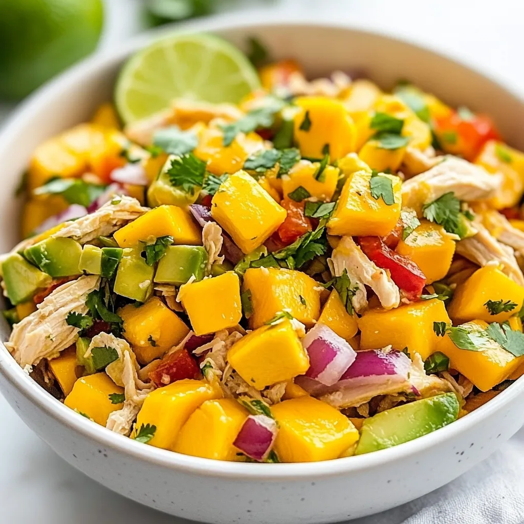 A refreshing salad combining shredded chicken, ripe mango, and creamy avocado, dressed with lime and olive oil.