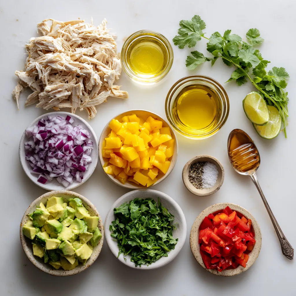 Gather these fresh ingredients before you start. The chicken gives protein, while mango and avocado add creaminess. The red bell pepper and onion bring crunch and flavor. The lime juice and olive oil make a bright dressing.