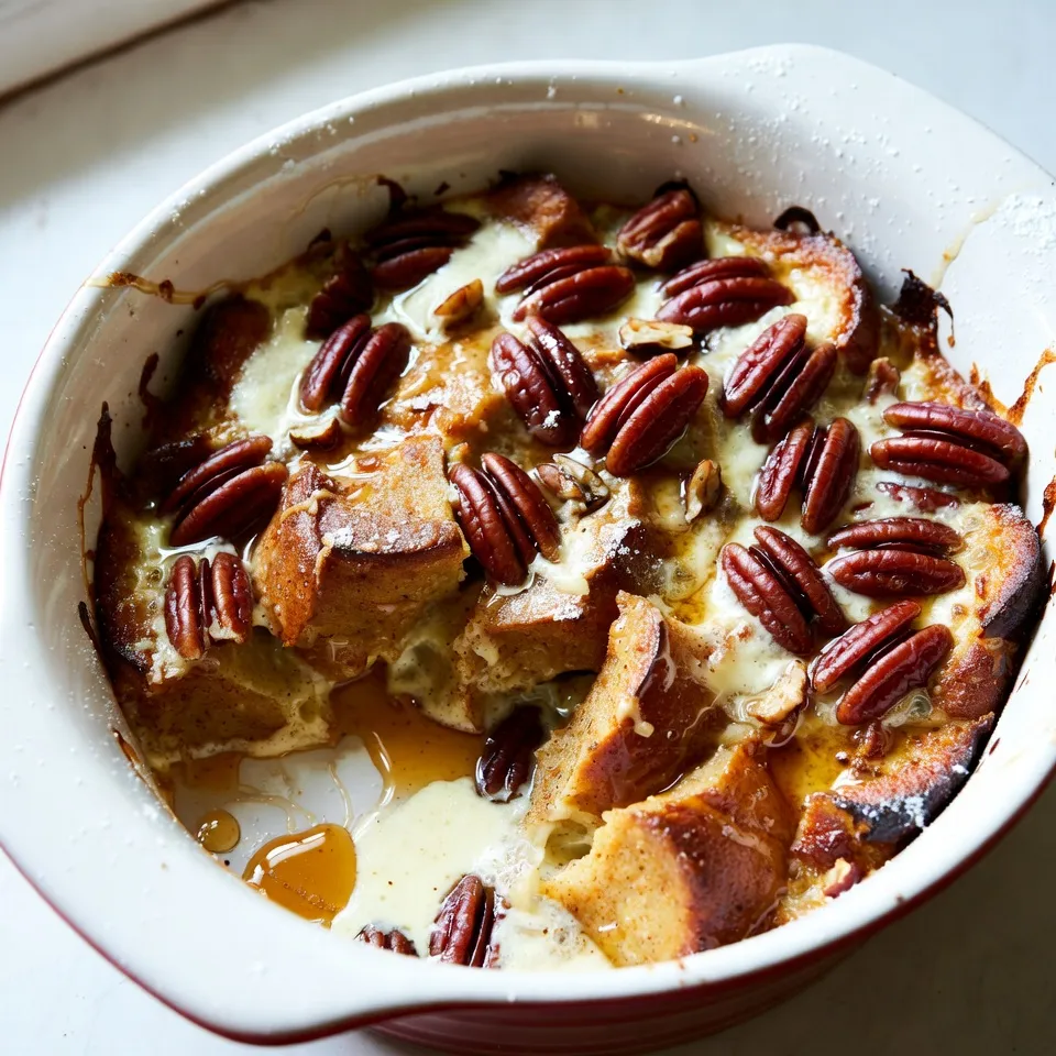A delicious and comforting casserole made with brioche or challah bread, eggs, milk, and topped with maple syrup and pecans.