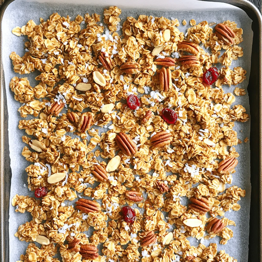 ![To make the best Maple Pecan Granola, you need the right ingredients. Each one plays a key role in flavor and texture. Here’s what you’ll need: - 2 cups old-fashioned rolled oats - 1 cup pecans, roughly chopped - ½ cup almond slices - ½ cup unsweetened shredded coconut - ½ teaspoon ground cinnamon - ½ teaspoon sea salt - ½ cup pure maple syrup - ¼ cup coconut oil, melted - ½ cup dried cranberries or raisins (optional) Each ingredient adds its charm to the mix. Old-fashioned rolled oats give that crunchy base. Pecan nuts bring a rich, buttery taste. Almond slices add a nice crunch, while shredded coconut offers a sweet hint. Ground cinnamon and sea salt balance the flavors perfectly. The pure maple syrup and melted coconut oil work together to coat everything nicely. You can also toss in dried cranberries or raisins for a sweet touch. This granola is not just a snack; it’s a delightful treat. You can find the full recipe above. Enjoy making this tasty Maple Pecan Granola! 1. Preheat oven and prepare baking sheet Start by preheating your oven to 300°F (150°C). Line a large baking sheet with parchment paper. This helps prevent sticking and makes cleanup easy. 2. Mix dry ingredients in a large bowl In a large bowl, combine 2 cups of rolled oats, 1 cup of chopped pecans, ½ cup of almond slices, and ½ cup of shredded coconut. Add ½ teaspoon of ground cinnamon and ½ teaspoon of sea salt. Stir them well to mix. 3. Combine maple syrup and coconut oil In a small bowl, whisk together ½ cup of pure maple syrup and ¼ cup of melted coconut oil. This mix adds a rich sweetness to your granola. 4. Coat dry ingredients with wet mixture Pour the maple syrup and coconut oil mix over the dry ingredients. Use a spatula to stir until all the dry ingredients are coated. This step is key for flavor. 5. Spread and press granola on the baking sheet Spread the granola mixture evenly on the prepared baking sheet. Press it down gently to form clumps. This helps create the crunchy clusters we all love. 6. Bake and stir granola halfway through Bake the granola for 25-30 minutes. Make sure to stir it halfway through. This ensures even browning and crispiness. 7. Cool and fold in dried fruits After baking, remove the granola from the oven. Let it cool completely on the baking sheet. As it cools, it will get crisp. If you want, fold in ½ cup of dried cranberries or raisins for added sweetness. 8. Store granola in an airtight container Once cooled, transfer the granola to an airtight container. Store it at room temperature. It stays fresh for up to two weeks. Enjoy it at breakfast or as a snack. For the complete recipe, check the [Full Recipe]. To get crunchy clusters in your granola, press the mix down on the baking sheet. This helps it bake into clusters, which are fun to eat. Stir the granola halfway through baking to ensure even cooking. If you want to switch up sweeteners, you can use honey or agave syrup. Both add a nice taste without changing the texture. You can also mix maple syrup with brown sugar for a richer flavor. For flavor variations, try adding spices. A touch of nutmeg or ginger can spice things up. You can also play with the amount of cinnamon for a sweeter or spicier taste. Each adjustment can change the whole profile of your granola. Using these tips, you can master your Maple Pecan Granola. Check out the Full Recipe for more details! {{image_4}} You can easily change this recipe to fit your taste. Start by adding more nuts and seeds. Try walnuts, sunflower seeds, or pumpkin seeds. Each nut gives a unique flavor and texture. Mix and match to find your favorite combo. Next, think about different dried fruits. You can use raisins, apricots, or even mango. Each fruit adds a nice sweetness. You can also add chocolate chips for a treat! Flavoring your granola is also fun. Adding a splash of vanilla or almond extract boosts the taste. Just a little goes a long way. You can experiment with spices, too. Nutmeg or ginger can give your granola a warm touch. Feel free to check the Full Recipe to find the base you can build on. To keep your maple pecan granola fresh, store it in an airtight container. This helps prevent moisture and keeps it crunchy. I like to use glass jars or plastic containers with tight lids. Homemade granola lasts about two weeks at room temperature. If you want it to stay fresh longer, try freezing it. Just place the granola in a freezer-safe bag or container. It can last up to three months in the freezer. When you're ready to eat it, just take out what you need and let it thaw. This way, you always have a tasty snack on hand. For the full recipe, check out the earlier section. Enjoy your granola! Yes, you can make granola without nuts. Just swap nuts for seeds like pumpkin or sunflower seeds. You can also add more oats or coconut for texture. I love serving Maple Pecan Granola with yogurt or milk. You can also enjoy it as a snack on its own. Add some fresh fruit for a tasty breakfast. To modify for dietary needs, use gluten-free oats if you're gluten-free. For a vegan option, replace honey with maple syrup. You can also skip the coconut oil for a nut-free version. You can use quick oats, but the texture will change. Quick oats will make a softer granola, while rolled oats create a crunchier texture. I recommend sticking with rolled oats for the best results. Yes, Maple Pecan Granola can be healthy. It has whole grains from oats and healthy fats from nuts. It’s also low in added sugars if you control the maple syrup amount. Enjoy it in moderation as part of a balanced diet. You can find the full recipe for Maple Pecan Granola above. Making your own Maple Pecan Granola is simple and fun. We covered ingredients to get you started, like oats, nuts, and maple syrup. The step-by-step instructions show how to mix and bake it. Use tips to get crunchy clusters and try different flavor options. Store it properly for freshness, and don’t forget the ways to customize it. You