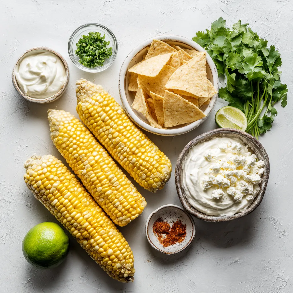 To make Mexican Street Corn Dip, gather your ingredients first. You need fresh corn, cream cheese, sour cream, and mayonnaise. Also, get feta cheese, cilantro, lime, chili powder, cumin, salt, and pepper. Don’t forget the tortilla chips for dipping!