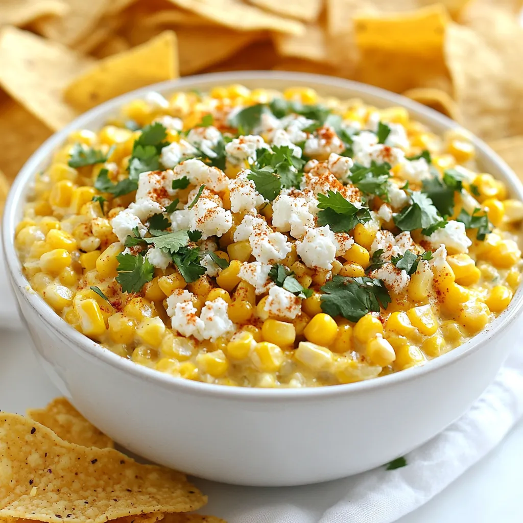 To make Mexican street corn dip, you will need the following ingredients: - 4 fresh corn cobs, husked and grilled - 1 cup cream cheese, softened - 1/2 cup sour cream - 1/2 cup mayonnaise - 1 cup crumbled feta cheese - 1/2 cup fresh cilantro, finely chopped - 1 lime, juiced - 1 teaspoon chili powder - 1/2 teaspoon cumin - Salt and pepper to taste - Tortilla chips for serving You can easily swap some ingredients if needed: - Cream Cheese: Use goat cheese or Greek yogurt for a tangy twist. - Feta Cheese: Try cotija cheese for a more authentic flavor. - Sour Cream: Plain yogurt works well as a substitute. - Mayonnaise: Use a vegan mayo if you prefer a plant-based option. - Cilantro: Parsley can replace cilantro if you're not a fan. For the best taste, I recommend these brands: - Cream Cheese: Philadelphia is always a favorite for its creaminess. - Feta Cheese: Dodoni offers a great crumbly texture and flavor. - Mayonnaise: Hellmann’s is known for its rich taste. - Chili Powder: McCormick provides a balanced blend of spices. This list makes it easy to gather everything you need for the dip. Each ingredient adds to the delicious, creamy, and zesty flavors that make this dip a crowd-pleaser. Enjoy making it! {{ingredient_image_2}} To make Mexican Street Corn Dip, gather your ingredients first. You need fresh corn, cream cheese, sour cream, and mayonnaise. Also, get feta cheese, cilantro, lime, chili powder, cumin, salt, and pepper. Don't forget the tortilla chips for dipping! 1. Grill the Corn: Start by grilling four fresh corn cobs. Set your grill to medium-high heat. Grill for 10 to 15 minutes. Turn the corn often until it gets light brown. 2. Cut the Corn: Once the corn cools, use a sharp knife. Carefully cut the kernels off the cob. Place all the kernels in a large bowl. 3. Mix the Creamy Base: In another bowl, mix one cup of soft cream cheese, half a cup of sour cream, and half a cup of mayonnaise. Stir until it’s smooth and creamy. 4. Combine Ingredients: Add the grilled corn, one cup of crumbled feta, half a cup of chopped cilantro, the juice of one lime, one teaspoon of chili powder, and half a teaspoon of cumin into the creamy mix. Season with salt and pepper. Stir everything well until it’s fully combined. 5. Taste and Adjust: Try your dip. If you want, add more lime juice or spices to suit your taste. 6. Chill the Dip: Transfer the dip to a serving bowl. Cover it and chill in the fridge for at least 30 minutes. This helps the flavors blend together. 7. Serve and Enjoy: Serve the dip chilled with tortilla chips. Dive in and enjoy every bite! - Grill the corn while you prepare the creamy mix. This saves time. - Make sure to chill the dip for at least 30 minutes. This step is key for flavor. - Use fresh corn for the best taste. It makes a big difference! - For a fun look, serve the dip in a colorful bowl. Garnish with extra cilantro and lime slices. To boost the taste of your Mexican street corn dip, consider these tips: - Use fresh ingredients: Fresh corn adds sweetness and crunch. Grilling enhances its flavor. - Add more lime juice: A splash of lime juice brightens up the dip. It gives a nice zing. - Experiment with spices: Try adding garlic powder or smoked paprika for depth. Just a pinch can transform the dip. - Mix in jalapeños: If you like heat, chop fresh jalapeños into the mix. They add spice and flavor. Serve your dip cold for the best taste. Here are some fun presentation ideas: - Colorful bowls: Use a bright bowl to make the dip pop. It draws attention and makes it fun. - Garnish creatively: Top with extra cilantro and lime wedges. This adds freshness and looks great. - Use tortilla chips: Serve with crispy tortilla chips. They are perfect for dipping and add crunch. You can easily make this dip ahead of time. Here’s how: - Chill before serving: After mixing, let it sit in the fridge for at least 30 minutes. This helps the flavors blend. - Store properly: Place the dip in an airtight container. This keeps it fresh and tasty. - Lasting flavor: The dip lasts up to three days in the fridge. Just give it a stir before serving again. Pro Tips Fresh Corn is Best: For the most flavorful dip, use fresh corn on the cob. Grilling enhances the sweetness and adds a smoky flavor. Customize Your Spice Level: Adjust the amount of chili powder to suit your taste. For a milder dip, start with less and add more as needed. Chill for Maximum Flavor: Allow the dip to chill in the refrigerator for at least 30 minutes before serving. This helps the flavors meld beautifully. Garnish for Presentation: Top your dip with extra fresh cilantro and lime wedges for a vibrant and appealing presentation. {{image_4}} To make a spicy version, add diced jalapeños to the mix. Start with one jalapeño, remove the seeds, and chop it finely. If you love heat, you can add more! You can also sprinkle some cayenne pepper on top for an extra kick. This dip will bring the heat and flavor that everyone loves. If you want a vegan version, swap the cream cheese, sour cream, and mayonnaise for plant-based options. Look for vegan cream cheese and sour cream at your store. You can use cashew cream as a great substitute for a creamy texture. Use nutritional yeast to add a cheesy flavor without dairy. Your dip will still taste amazing and be plant-based! Cheese can change the dip's flavor profile. If you prefer, swap feta for goat cheese or cotija cheese. These cheeses add a unique taste. You can also try using shredded cheese like Monterey Jack or mozzarella for a melt-in-your-mouth experience. Mix and match cheeses to find your favorite combination. To keep your Mexican Street Corn Dip fresh, store leftovers in an airtight container. Make sure to seal it well. This helps to keep the flavors strong and the dip safe to eat. Your dip will last about 3 to 5 days in the fridge. Always check for any signs of spoilage before you enjoy it again. If it smells off or looks strange, it's best to toss it. You can freeze this d