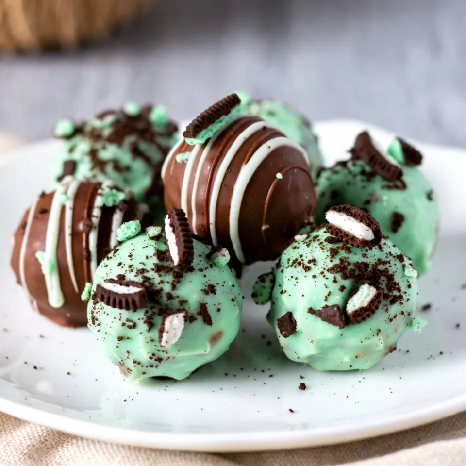 Delicious truffles made with Mint Oreo cookies, cream cheese, and chocolate.