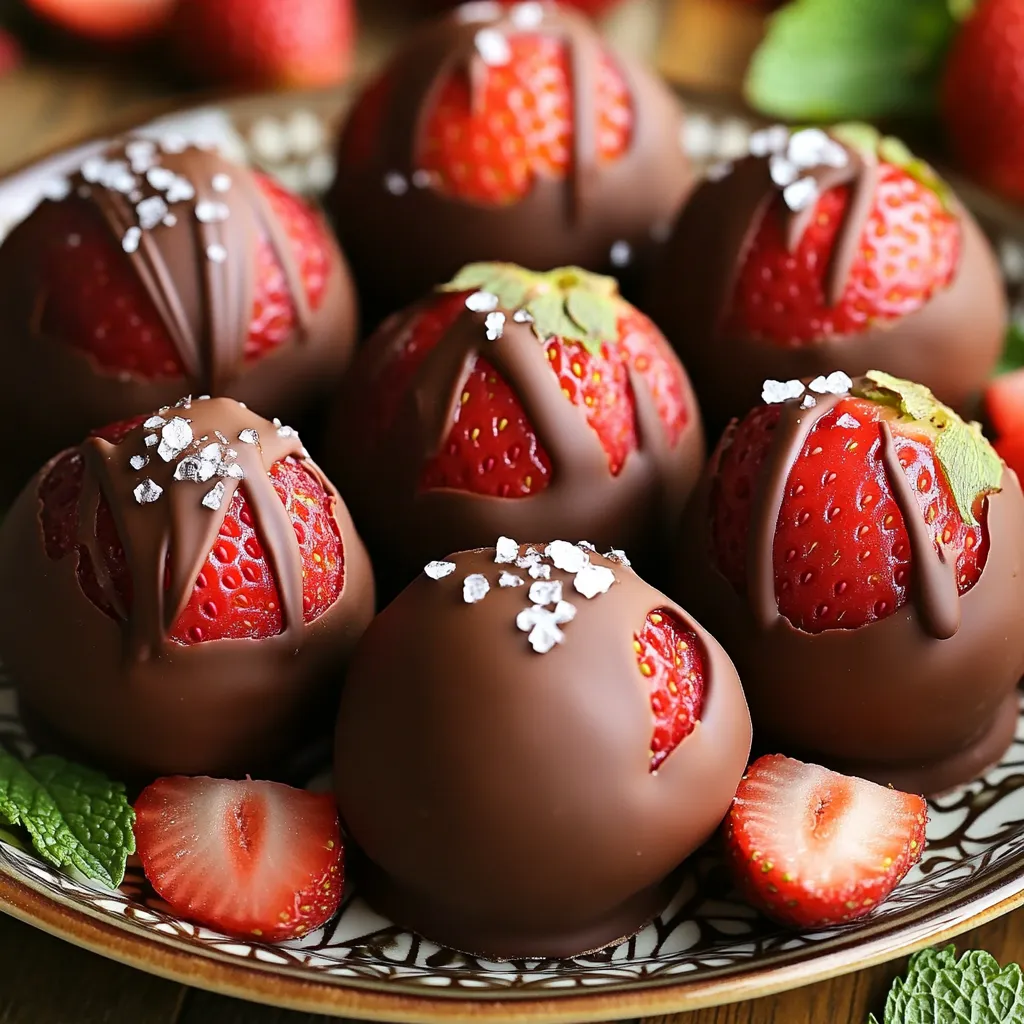 - 1 cup fresh strawberries, hulled and finely chopped - 1 cup graham cracker crumbs - 1 cup cream cheese, softened to room temperature - 1 cup powdered sugar - 1 teaspoon pure vanilla extract - 1 cup semi-sweet chocolate chips - 1 tablespoon coconut oil (optional, for a smoother chocolate coating) - Flaky sea salt, for garnish Fresh strawberries are key here. They add a bright flavor and natural sweetness. Make sure to hull them well. This means removing the green tops. Finely chop the strawberries so they blend well with the other ingredients. Graham cracker crumbs give a nice crunch. They also help bind the mixture. Use plain or cinnamon-flavored crumbs for a twist. Cream cheese softens the texture. It adds a rich and creamy feel. Always let it sit out for about 30 minutes to soften before mixing. Powdered sugar sweetens the truffles. It also helps thicken the mixture. Use pure vanilla extract for the best taste. It enhances the sweet notes of the strawberries. Semi-sweet chocolate chips are perfect for coating. They melt well and have a rich taste. If you want a smoother finish, add coconut oil when melting the chocolate. This helps the chocolate coat the truffles evenly. Flaky sea salt adds a touch of contrast. It makes the sweet truffles even better. If you can’t find fresh strawberries, use frozen ones. Just make sure to thaw and drain them well. For a nutty flavor, substitute graham cracker crumbs with crushed nuts or cookie crumbs. If you need a dairy-free option, try vegan cream cheese. It works well and keeps the texture. You can also use agave or maple syrup in place of powdered sugar. Adjust the amount to get the right sweetness. For the chocolate coating, use dark chocolate or white chocolate if you prefer. Each option gives a different taste. You can also try flavored chocolate for something unique, like orange or mint. To make the strawberry mixture, start with fresh strawberries. You need one cup, hulled and chopped finely. In a medium bowl, combine the strawberries with graham cracker crumbs, soft cream cheese, powdered sugar, and vanilla extract. Use a spatula or a hand mixer to blend them well. Aim for a thick dough that holds together nicely. If you like it smoother, a hand mixer really helps. This mixture forms the heart of your truffles. Now it’s time to roll the truffles. With clean hands, scoop out small portions of the strawberry mixture, about one inch in diameter. Roll them gently into balls. Place each ball on a baking sheet lined with parchment paper. Make sure to leave space between each truffle. This way, they won’t stick together. Once all are rolled, put the sheet in the freezer for about 30 minutes. This helps the truffles firm up and makes coating them easier. While the truffles chill, prepare the chocolate coating. In a microwave-safe bowl, combine one cup of semi-sweet chocolate chips and one tablespoon of coconut oil if you want a smooth finish. Heat this mixture in the microwave. Do it in 30-second intervals, stirring well after each. Keep going until the chocolate is fully melted and smooth. After the truffles are firm, take them out of the freezer. Dip each truffle into the melted chocolate, ensuring they are fully coated. Use a fork to lift them out. Tap the fork against the bowl's edge to remove extra chocolate. Place them back on the parchment-lined baking sheet. While the chocolate is still wet, sprinkle a tiny pinch of flaky sea salt on top of each truffle. This adds a nice touch of flavor. Finally, put the baking sheet in the fridge. Let the truffles chill until the chocolate sets, which takes about 15 to 20 minutes. Enjoy your sweet creation! To get the right texture for your truffles, mix well. The cream cheese should blend with the strawberries and graham crackers. Aim for a thick dough that holds shape. If it seems too crumbly, add a bit more cream cheese. If it feels too wet, add extra graham cracker crumbs. This balance is key for a perfect bite. When melting chocolate, use a microwave-safe bowl. Heat in short bursts. Start with 30 seconds, then stir. Repeat until melted. Stirring helps keep the chocolate smooth. If you choose to add coconut oil, it makes the chocolate coating silky. This step ensures your truffles have a nice, shiny finish. To make your truffles special, think about add-ins. A pinch of cinnamon or a dash of sea salt can boost the flavor. You can also mix in a few mini chocolate chips for texture. Consider adding a splash of almond extract for a unique twist. These little changes can take your truffles to the next level. {{image_4}} You can mix up the flavors in your truffles. Try using raspberries or blueberries instead of strawberries. You can also add a splash of orange juice for a fruity twist. If you love nuts, consider adding finely chopped almonds or walnuts to the strawberry mixture. Coconut flakes can give a tropical taste too. Play around with spices like cinnamon or nutmeg for warmth. Each option adds a unique touch to your truffles. To make these truffles vegan or dairy-free, swap the cream cheese for a vegan cream cheese. You can also use coconut cream as a rich alternative. For the chocolate, choose dark chocolate that is dairy-free. Always check the labels to ensure no milk products are included. This way, you can enjoy these lovely treats while sticking to your dietary needs. You can change the chocolate type for your coating. Milk chocolate offers a sweeter taste. Dark chocolate gives a rich and bold flavor. White chocolate provides a creamy contrast to the fruity filling. If you want a unique twist, try using flavored chocolates, like mint or orange. Just remember to melt the chocolate carefully to keep its smooth texture. Each chocolate type changes the overall flavor, making your truffles special. To keep your no-bake chocolate covered strawberry truffles fresh, store them in an airtight container. This will prevent them from drying out or absorbing any unwanted smells. Line the bottom of the 