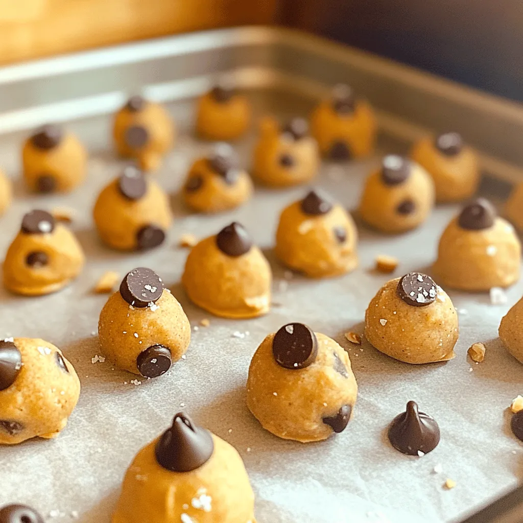 The joy of making No-Bake Cookie Dough Bites starts with gathering the right ingredients. Each one plays a key role in flavor and texture. Here’s what you need: - 1 cup almond flour - ½ cup creamy peanut butter (or nut-free alternative) - ¼ cup pure maple syrup - 1 teaspoon pure vanilla extract - ½ cup mini chocolate chips - ¼ teaspoon fine sea salt - ¼ cup chopped nuts (optional) Almond flour offers a nutty taste and a great base. Peanut butter adds creaminess and richness. Maple syrup gives natural sweetness, while vanilla enhances the flavor. Mini chocolate chips add a delightful texture and taste. Sea salt balances the sweetness, and nuts add crunch if you like. Using these simple ingredients makes this recipe easy and fun. You can substitute peanut butter with sunflower seed butter for a nut-free option. Have fun experimenting with your favorite flavors! For the full recipe, you can refer to the provided details. Enjoy the process! 1. Mix almond flour and nut butter Start by placing 1 cup of almond flour in a large mixing bowl. Add ½ cup of creamy peanut butter or almond butter. Both options work well. 2. Add maple syrup and vanilla extract Pour in ¼ cup of pure maple syrup and 1 teaspoon of pure vanilla extract. Stir these ingredients together until you have a smooth dough. 3. Fold in chocolate chips and sea salt Gently fold in ½ cup of mini chocolate chips and ¼ teaspoon of fine sea salt. For added crunch, include ¼ cup of chopped nuts if you like. 4. Knead and roll into bite-sized balls Knead the mixture lightly with your hands. Then, scoop out tablespoon-sized portions. Roll each portion into a small ball. 5. Chill before serving Place the cookie dough bites on a parchment-lined baking sheet. Space them apart, and refrigerate for at least 30 minutes. This helps them firm up. - How to present cookie dough bites Serve your cookie dough bites on a nice plate. Scatter extra chocolate chips and nuts on top for a pretty touch. Drizzle melted chocolate over them for an extra treat. - Recommended pairings and drinks These bites pair well with milk or a cup of coffee. You can also serve them with fresh fruit for a balanced snack. To get the best texture for your no-bake cookie dough bites, you want a smooth mix. Start with room-temperature peanut butter. This makes it easier to blend with the almond flour. If your mix is too thick, add a little maple syrup. When kneading the dough, use clean hands for the best control. Lightly press the dough together, but don’t overdo it. You want to combine the ingredients without making the dough tough. One common mistake is overmixing the dough. This can make the bites dry and hard. Mix just until everything is combined. Another mistake is using the wrong ingredients. Always use pure maple syrup, not pancake syrup. Pancake syrup can change the taste and texture. You can change the flavor of your cookie dough bites easily. Try using cashew butter instead of peanut butter for a different taste. Adding flavors can also enhance your bites. A pinch of cinnamon or a splash of almond extract brings new life to the dough. You can also swap chocolate chips for dried fruit or coconut flakes for added texture. For the full recipe, check out the details above. {{image_4}} You can easily change the taste of your cookie dough bites. Using different nut butters can create new flavors. Try cashew butter or sunflower seed butter for a twist. Each nut butter brings its unique taste and richness. Mix-ins and toppings can also change the game. You can add shredded coconut, dried fruit, or even spices. A pinch of cinnamon or a dash of sea salt can make your bites pop. If you like crunch, add chopped pretzels or crushed graham crackers. The options are endless! If you follow a vegan diet, swap out the maple syrup for agave nectar. Use a plant-based butter if you want a creamier texture. These bites can be gluten-free too! Simply use certified gluten-free oats or flour. For those with nut allergies, I recommend using sunbutter or soy nut butter. These options keep the bites nut-free without losing flavor. You can still enjoy the joy of cookie dough without worry. To keep your no-bake cookie dough bites fresh, store them in an airtight container. Use a glass container or a plastic one with a tight lid. This helps prevent them from drying out. You can also layer the bites with parchment paper. This keeps them from sticking together. Always make sure they are completely cool before storing. If you store the bites in the refrigerator, they last about a week. You can also freeze them for longer storage. In the freezer, they stay good for about three months. Just remember to thaw them in the fridge before eating. The cookie dough bites taste best chilled, fresh, and ready to enjoy! For the full recipe, check out the previous sections. Can I freeze cookie dough bites? Yes, you can freeze cookie dough bites. Place them in a single layer in a freezer-safe bag. They will stay fresh for about three months. When you want to enjoy them, let them thaw in the fridge for a few hours. How long does it take for cookie dough bites to firm up? It takes about 30 minutes for cookie dough bites to firm up in the fridge. This chilling time helps them hold their shape and enhances the flavors. Caloric content per serving Each serving of cookie dough bites has about 100 calories. This can vary based on the ingredients you choose. Health benefits of the ingredients used - Almond flour is low in carbs and high in healthy fats. - Peanut butter offers protein and healthy fats. - Maple syrup provides natural sweetness with some nutrients. - Chocolate chips add a bit of joy, and dark chocolate has antioxidants. These ingredients make cookie dough bites a tasty treat that can fit into a balanced diet. In this blog post, we covered how to make delicious cookie dough bites. We listed the simple ingredients and provided clear steps for preparation. I shared tips to ensure your bites come out ju