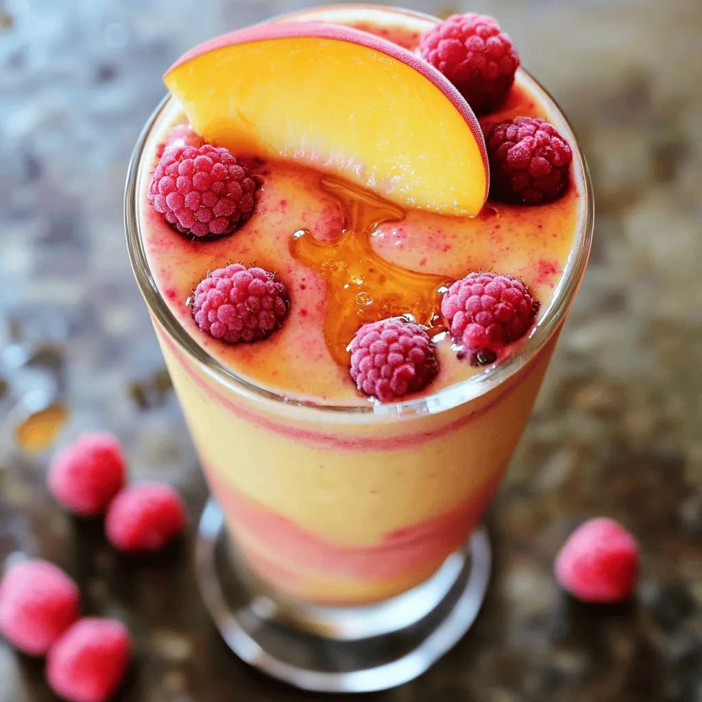 Finally, pour the smoothie into pre-chilled glasses. This keeps the drink cool and refreshing. For a fun touch, garnish with whole raspberries and a peach slice on the rim. A drizzle of honey on top adds shine and sweetness. Enjoy this creamy and refreshing treat!