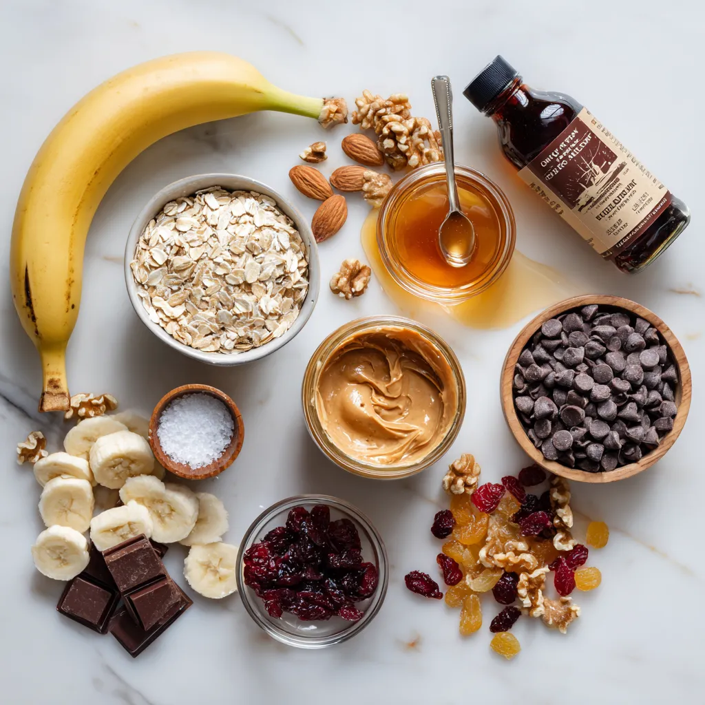 In a large bowl, combine your rolled oats and natural peanut butter. Next, add in 1/4 cup of honey or maple syrup. Then, mash one large ripe banana and mix it in. Don’t forget to add 1/2 teaspoon of vanilla extract for flavor. Stir these ingredients until they form a sticky, cohesive mixture. Now, fold in 1/4 cup of dark chocolate chips, 1/4 cup of chopped nuts, and 1/4 cup of dried fruit. Add a pinch of salt to enhance the taste.