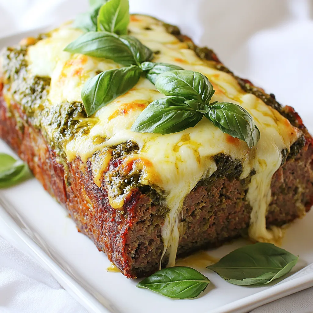 A delicious meatloaf stuffed with pesto and mozzarella cheese, perfect for a hearty meal.