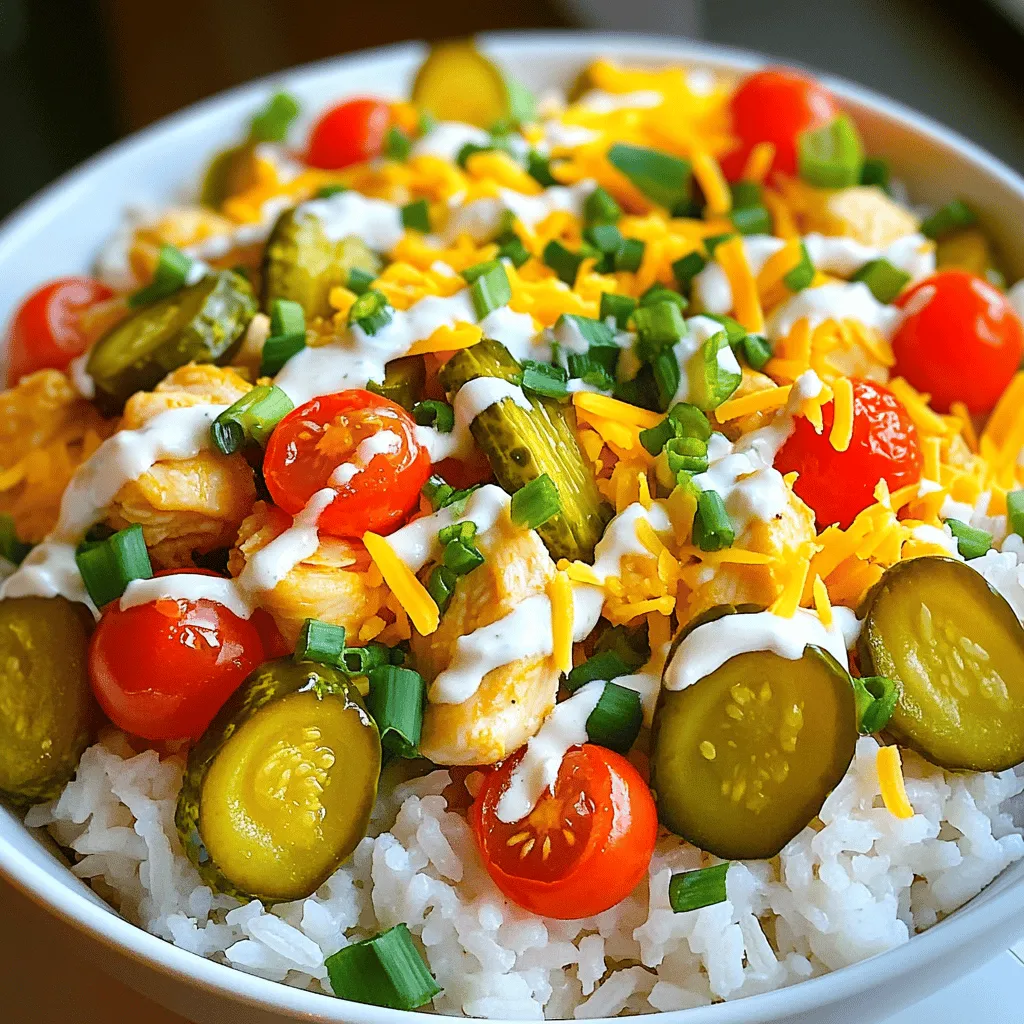 For a great meal, you need the right ingredients. Here’s what you will use: - 2 cups cooked rice (white or brown) - 2 medium chicken breasts, diced - 1/2 cup dill pickle juice - 1/2 cup ranch dressing - 1 cup dill pickles, finely chopped - 1 cup cherry tomatoes, halved - 1/2 cup shredded cheddar cheese - 1/4 cup green onions, finely chopped - Salt and pepper to taste - 2 tablespoons olive oil Each ingredient plays a role in building flavors. The chicken soaks up the tangy pickle juice. The ranch dressing brings creaminess. The pickles and tomatoes add crunch and freshness. To make this dish, gather these tools: - Large mixing bowl - Skillet - Knife and cutting board - Measuring cups and spoons - Serving bowls These tools help you prep and cook efficiently. A large skillet allows you to cook the chicken evenly. A mixing bowl is essential for marinating. You can swap ingredients based on what you have. Here are some ideas: - Use quinoa or cauliflower rice instead of regular rice for a different base. - Swap chicken for turkey or tofu for a vegetarian option. - Try Greek yogurt instead of ranch dressing for a lighter choice. - Use any pickles you like, such as bread and butter, for a sweet twist. These substitutes can give your Pickle Ranch Chicken and Rice Bowls new flavors while keeping it fun. You can find the full recipe in the previous section. To start, you need to marinate the chicken. Take your diced chicken breasts and place them in a mixing bowl. Pour in the dill pickle juice. Make sure every piece is covered. This step gives the chicken a tangy flavor. Cover the bowl with plastic wrap or a lid. Let the chicken sit in the fridge for at least 30 minutes. This allows the chicken to soak up the pickle flavor. Once your chicken has marinated, it’s time to cook it. Heat two tablespoons of olive oil in a large skillet over medium-high heat. Take the chicken out of the marinade. Discard any leftover liquid. Add the chicken pieces to the hot skillet. Season the chicken with salt and pepper. Cook the chicken for about 7 to 10 minutes. Stir occasionally. Make sure the chicken is golden brown and not pink inside. Now, let’s prepare the rice. If you haven’t cooked it yet, follow the package instructions to cook your rice. You can use white or brown rice, based on your preference. After cooking, fluff the rice with a fork. This keeps it light and airy. You want your rice to be a nice base for the chicken and toppings. For the full recipe, check out the detailed instructions. Start with a bowl of cooked rice. This is your base. Add a layer of sautéed chicken on top. Next, sprinkle the chopped dill pickles for a crunchy bite. Then, add the halved cherry tomatoes for a pop of color. Finally, top it all with shredded cheddar cheese. For a balanced bowl, use 1 cup of rice per serving. Add about 1/2 cup of chicken for protein. Use 1/4 cup of dill pickles and tomatoes each. This keeps flavors lively but not overwhelming. Adjust these ratios based on your taste. More cheese? Go for it! Serve the bowls warm. Drizzle ranch dressing over the top for extra flavor. You can place extra dressing in a small dish on the side. This way, everyone can add their own. For a beautiful look, arrange the cherry tomatoes and green onions on top. Enjoy your colorful meal! For the full recipe, refer to the earlier section. {{image_4}} When making Pickle Ranch Chicken and Rice Bowls, some common mistakes can ruin the dish. First, don't skip marinating the chicken. This step adds flavor. If you use too much olive oil, the chicken can become greasy. Always measure it. Not cooking the chicken fully is another issue. Use a meat thermometer to check for doneness; it should reach 165°F. Lastly, be careful with salt. Dill pickle juice is salty, so taste before adding more. To make your Pickle Ranch Chicken and Rice Bowls even tastier, consider adding extra ingredients. Try adding avocado for creaminess. You can also include black beans for protein and fiber. If you like heat, diced jalapeños add a kick. Fresh herbs like cilantro or parsley can brighten the dish. Don't forget to mix in corn for sweetness and texture. These additions can give your meal a fun twist. These bowls are perfect for meal prep. Cook the chicken and rice in advance. Store them in airtight containers in the fridge. You can also chop the veggies ahead of time. Keep the ranch dressing separate until you’re ready to eat. This way, the flavors stay fresh. When it’s time to eat, just assemble the bowls. This makes it easy to enjoy a quick, delicious meal on busy nights. For the full recipe, check out the details above. You can easily make this dish vegetarian. Instead of chicken, use chickpeas or tofu. Both options soak up the pickle juice flavor well. You can also use hearty veggies like zucchini or bell peppers. Sauté them in olive oil for a few minutes. Top your rice with the cooked veggies and add the same toppings from the recipe. The ranch dressing goes great with these options too. If you like heat, add spicy elements. Mix in chopped jalapeños or red pepper flakes. You can also use spicy ranch dressing instead of regular ranch. Another idea is to marinate the chicken in buffalo sauce. This gives a zesty flavor that pairs well with the pickles. Just adjust the amount of ranch dressing to balance the heat. To cut carbs, swap the rice for cauliflower rice. It has a similar texture and absorbs flavors well. You can also add more leafy greens, like spinach or kale, as a base. For added crunch, sprinkle on nuts or seeds. This keeps the dish filling while lowering the carb count. You’ll still enjoy all the great flavors of the original recipe. For the complete recipe, check the Full Recipe section. The best rice for these bowls is white or brown rice. Both types work well. White rice is fluffy and soft. Brown rice adds a nutty flavor and more fiber. I prefer brown rice for its health benefits. It makes the meal filling. You can also use jasmin