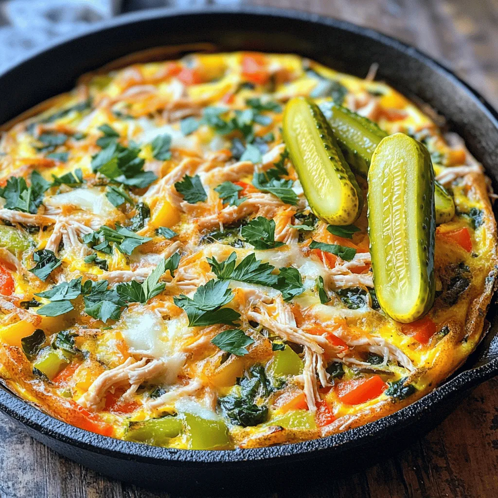 ![- 4 large eggs - 1 cup cooked chicken, shredded - 1/2 cup pickle juice - 1/2 cup shredded cheese (cheddar or your preference) - 1 small bell pepper, diced - 1/2 onion, finely chopped - 1 cup fresh spinach, chopped - 1 teaspoon ranch seasoning - 2 tablespoons olive oil - Salt and pepper, to taste When making the Pickle Ranch Chicken and Veggie Frittata, fresh ingredients matter. Use large eggs for a fluffy texture. Cooked chicken adds protein and flavor. Pickle juice gives a tangy kick that brightens the dish. Cheese adds richness; choose a type you love. Bell peppers and onions bring sweetness and crunch. Fresh spinach adds color and nutrition. Ranch seasoning blends all the flavors together. Olive oil helps sauté the veggies and keeps everything moist. Don’t forget salt and pepper for seasoning! You can mix it up with alternative proteins. Turkey or tofu works well instead of chicken. For veggies, try zucchini or mushrooms for different tastes. Cheese choices include feta or mozzarella for a twist. These swaps keep the frittata exciting and fresh! Make it your own by using what you have on hand. This flexibility makes cooking fun and easy. For the full recipe, check the details above! 1. Preheat your oven to 375°F (190°C). This heat helps cook the frittata evenly. 2. In a large bowl, crack open the four eggs. Whisk them well with the pickle juice and ranch seasoning. Add salt and pepper to taste. Mix until smooth. 1. Heat two tablespoons of olive oil in an oven-safe skillet over medium heat. 2. Once the oil is hot, add the finely chopped onion and diced bell pepper. Sauté these for 3-4 minutes. You want them to soften, not brown. 3. Next, toss in the chopped spinach. Stir for 1-2 minutes until it wilts down. 4. Now, add in the shredded chicken. Mix it well with the veggies. This ensures even flavor throughout. 5. Carefully pour the egg mixture over the chicken and veggies in the skillet. Make sure everything is covered. 6. Sprinkle the shredded cheese on top. This will melt and create a nice layer as it cooks. 7. Let the frittata cook on the stovetop for 2-3 minutes. Watch for the edges to start setting. 8. Transfer the skillet to your preheated oven. Bake for 15-20 minutes until the center is set and the top is golden. 9. When done, take the skillet out of the oven. Allow it to cool for a few minutes before slicing it into wedges. Check the [Full Recipe] for more details! Using an oven-safe skillet is key for this frittata. It allows you to start cooking on the stove and then transition to the oven. Make sure your skillet can handle high heat. This helps cook the frittata evenly. Every oven is a bit different. You may need to adjust the cook time. If your oven runs hot, check your frittata a few minutes early. Look for that golden top and firm center. A toothpick can help test doneness; it should come out clean when inserted. To boost flavor, think about adding fresh herbs or spices. Chopped chives or dill can brighten up the dish. A pinch of paprika can add warmth and depth. When serving, add a garnish for a lovely touch. A few slices of pickles on top create a nice contrast. Fresh parsley or cilantro can add a pop of color. Serve it warm for the best taste. For the full recipe, check out the complete details on creating this delicious dish! {{image_4}} You can change the taste of your frittata easily. Try adding different seasoning blends. For instance, use Italian herbs or taco seasoning. Each blend brings a new taste to the dish. You can also incorporate different pickles for fun flavors. Use spicy pickles for a kick or sweet ones for a touch of sweetness. Each choice adds a unique twist to your frittata. This frittata works well for breakfast or dinner. For breakfast, serve it warm with a side of fresh fruit. It makes a nice start to your day. For dinner, pair the frittata with a crisp side salad or crusty bread. This combo makes for a hearty meal. You can also serve it with roasted veggies for a colorful plate. For the full recipe, check out the details in the earlier section. To keep your frittata fresh, store it properly. After it cools, slice it into pieces. Place each piece in an airtight container. Use glass or plastic containers that seal well. This helps keep moisture in and prevents strong smells from other foods. You can store the frittata in the fridge for up to four days. If you need it to last longer, consider freezing it. Wrap each slice tightly in plastic wrap, then place it in a freezer bag. Make sure to label the bag with the date. When you're ready to enjoy leftovers, reheat them carefully. The best method is to use the oven. Preheat your oven to 350°F (175°C). Place the slices on a baking sheet, cover them with foil, and heat for about 10-15 minutes. This keeps the frittata moist and soft. You can also use a microwave. Place a slice on a microwave-safe plate. Cover it with a damp paper towel. Heat for 30 seconds to 1 minute, checking often. This way, you keep the frittata's great taste. Enjoy your meal! Can I make the frittata ahead of time? Yes, you can make the frittata ahead of time. Just cook it fully and let it cool. Store it in the fridge for up to three days. When ready to serve, warm it in the oven for best results. How do I know when the frittata is done baking? You know the frittata is done when the center is set and no longer jiggles. It should also have a light golden color on top. A toothpick inserted into the center should come out clean. Can I freeze the Pickle Ranch Chicken and Veggie Frittata? Yes, you can freeze the frittata. Cut it into wedges and wrap them tightly in plastic wrap. Place the wrapped slices in a freezer bag. They can last up to two months. What can I pair with the frittata for a complete meal? You can pair the frittata with a crisp side salad. Fresh fruits or a slice of whole-grain bread work well too. For a heartier meal, serve it with roasted potatoes. Check the full recipe for cooking tips! This blog post covered a