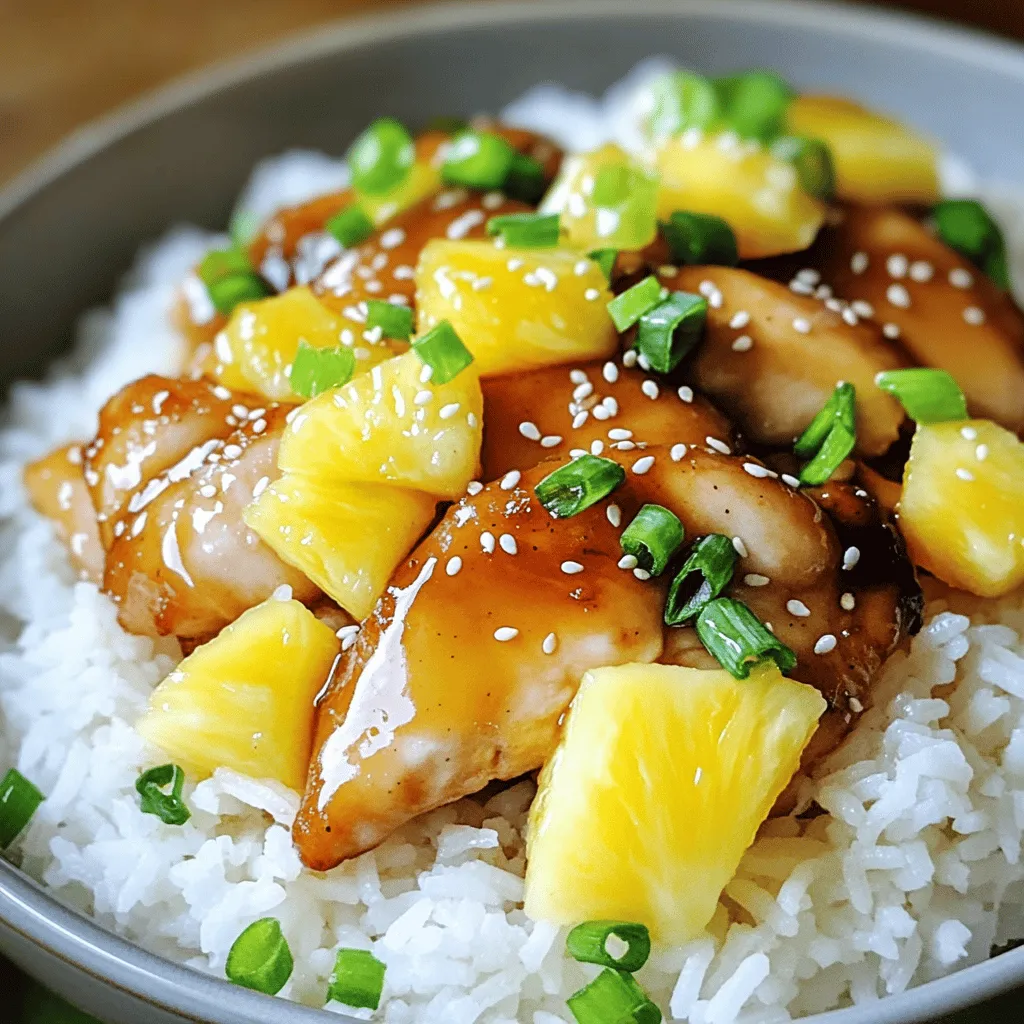 - 4 boneless, skinless chicken thighs - 1 cup fresh pineapple chunks - ½ cup teriyaki sauce For Pineapple Teriyaki Chicken, the main ingredients are essential. The chicken thighs give a juicy bite. Fresh pineapple adds a sweet twist. Teriyaki sauce brings all the flavors together. - 2 tablespoons soy sauce - 1 tablespoon honey - 1 teaspoon freshly grated ginger - 2 cloves garlic, finely minced The marinade is key to great taste. Soy sauce adds salt and umami. Honey gives a sweet touch. Fresh ginger and garlic boost flavor and aroma. Together, they create a rich blend that soaks into the chicken. - 1 green onion, thinly sliced (for garnish) - Sesame seeds (for garnish) - Cooked jasmine rice (for serving) Garnishes make the dish look fun and fresh. Sliced green onions add color and crunch. Sesame seeds give a nice nutty flavor. Serving over jasmine rice offers a fluffy base that balances the dish. Enjoy the full recipe for detailed cooking steps! To start, you need to whisk together the teriyaki sauce, soy sauce, honey, ginger, and garlic. This mix creates a sweet and savory blend. Make sure to stir well until everything combines smoothly. This marinade packs a punch and gives the chicken great flavor. Next, add the chicken thighs into the marinade. Coat each piece well. This step is key for flavor. Cover the bowl and place it in the fridge. Let it marinate for at least 30 minutes. If you have more time, let it sit overnight for deeper flavor. Heat a large skillet over medium-high heat. Add vegetable oil once the skillet is hot. You want the oil to shimmer but not smoke. Take the chicken out of the marinade and place it in the skillet. Sear the chicken for about 5-7 minutes on each side. Look for a golden brown color. Use a meat thermometer to check if it reaches 165°F (75°C). Once cooked, move the chicken to a plate and let it rest for a few minutes. In the same skillet, pour in the reserved marinade. Add your fresh pineapple chunks. Bring the mixture to a gentle simmer. Cook for about 5 minutes to let it thicken. This creates a rich sauce with juicy pineapple. Slice the rested chicken thighs into strips. Add them back into the skillet with the pineapple and sauce. Gently toss everything together for around 2 minutes. Ensure the chicken is fully coated and heated through. Serve your Pineapple Teriyaki Chicken over jasmine rice. For a nice look, use shallow bowls. Start with a layer of rice, then top it with chicken and pineapple. Add a sprinkle of sesame seeds and sliced green onions for extra flavor and a pop of color. Enjoy this dish for a fun meal! For the full recipe, check out the provided details. For the best flavor, marinate your chicken for at least 30 minutes. If you have more time, letting it sit overnight works wonders. The longer it marinates, the deeper the flavors sink in. Balance is key in your marinade. The acidity from the pineapple and soy sauce helps tenderize the chicken. Too much acidity can make it mushy, so stick to the recipe. Cook your chicken until it reaches an internal temperature of 165°F (75°C). This ensures the chicken is safe to eat and juicy. Searing the chicken in a pan gives it a nice crust. You can bake it too, but it may not get that same tasty sear. If you choose to bake, keep an eye on the time to avoid drying it out. Get creative by adding spices like red pepper flakes or a dash of smoked paprika for extra kick. You can also toss in veggies like bell peppers for color and crunch. Fresh pineapples enhance the dish more than canned ones. They offer a brighter taste and better texture. If you use canned, rinse them to remove excess syrup. This helps keep your dish light and fresh. For the full recipe, check out the [Full Recipe]. {{image_4}} You can switch up the protein in this dish. Using chicken breasts gives a leaner option. They cook quickly and stay juicy if you don’t overcook them. Chicken thighs are richer and have more flavor. They are less likely to dry out. If you want a plant-based choice, consider tofu or shrimp. Tofu absorbs flavors well. Press it first to remove excess water, then marinate. Shrimp cooks fast and brings a sweet touch. Just be careful not to overcook shrimp, or they will turn rubbery. Want to add some heat? Try jalapeños. You can chop them finely and mix them into the marinade. This will give your dish a nice kick. If you want to switch sauces, consider hoisin or soy sauce. These can change the flavor while keeping it tasty. You can also use a sweet chili sauce for a fun twist. This adds sweetness and spice all in one. Pineapple Teriyaki Chicken can be served in many ways. One fun option is to make bowls. Start with jasmine rice, then add chicken and pineapple. You can layer it all up for a colorful meal. Wraps are another great idea. Use lettuce or tortillas and fill them with chicken and fresh veggies. Skewers are perfect for grilling. Just thread the chicken and pineapple onto sticks, then grill until caramelized. Each method offers a unique dining experience. Check out the Full Recipe for more inspiration! After you enjoy your Pineapple Teriyaki Chicken, store any leftovers in an airtight container. This keeps the chicken fresh and tasty. Make sure it cools down first before sealing it. The leftovers can last for up to 3 days in the fridge. You can also label the container with the date for easy tracking. If you want to save it for later, freezing is a great option. First, cool the chicken completely. Then, place it in a freezer-safe bag or container. Try to remove as much air as possible. This helps prevent freezer burn. You can freeze it for up to 2 months. When you are ready to eat it, thaw it in the fridge overnight. This slow thawing helps keep the chicken juicy and flavorful. Reheating your Pineapple Teriyaki Chicken can be done in two main ways: the oven or the microwave. - Oven: Preheat your oven to 350°F (175°C). Place the chicken in a baking dish and cover it with foil. Heat for about 15-20 minutes