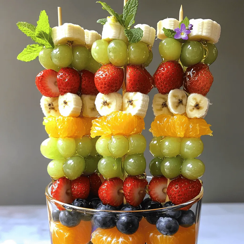 Gather these colorful fruits to make your skewers pop! Each fruit brings unique flavors and colors. Fresh strawberries are bright and sweet, while juicy oranges add a zesty kick. Ripe pineapple gives a tropical taste. Sweet green grapes provide a crisp bite. Vibrant blueberries burst with flavor, and ripe bananas add creaminess.