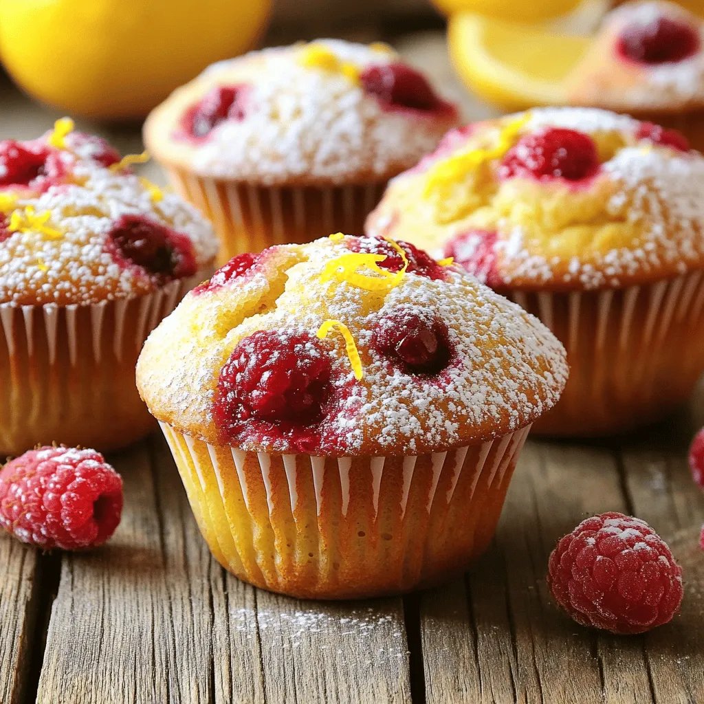 - Fresh vs. Frozen Raspberries You can use fresh or frozen raspberries for this recipe. Fresh raspberries give a bright flavor and a lovely texture. If you choose frozen, make sure to thaw and drain them well. This helps prevent a soggy muffin. Both options work well, but fresh will shine in taste. - Importance of Lemon Zest and Juice Lemon zest adds a burst of citrus aroma. It brightens the flavor of the muffins. Lemon juice adds tartness that balances the sweetness from sugar. Together, they make these muffins zesty and refreshing. Do not skip either ingredient; they are key to this recipe. - Choosing the Right Flour This recipe uses all-purpose flour and whole wheat flour. All-purpose flour gives a light texture. Whole wheat flour adds depth and nutrition. Using both helps create a perfect balance. If you want a lighter muffin, you can use only all-purpose flour. - Cups, Tablespoons, and Teaspoons Measurements are crucial in baking. For this recipe, you will need: - 1 cup fresh raspberries - 1 cup all-purpose flour - 1/2 cup whole wheat flour - 1/2 cup granulated sugar - 1 tablespoon baking powder - 1/4 teaspoon salt - 1/2 cup unsalted butter, melted - 2 large eggs - 1/2 cup milk - Zest of 1 lemon - 2 tablespoons lemon juice - 1 teaspoon vanilla extract Make sure to measure carefully for the best results. - Conversion Tips for International Ingredients If you use international measuring systems, remember: - 1 cup equals about 240 milliliters. - 1 tablespoon equals about 15 milliliters. - 1 teaspoon equals about 5 milliliters. This helps ensure your muffins turn out just right, no matter where you are. - Variations for Adding Flavor You can add other flavors to the muffins. Try adding blueberries or nuts for extra texture. A sprinkle of cinnamon can give warmth. These options let you get creative, making each batch special. - Dietary Modifications If you need dietary changes, you can make them easily. Use gluten-free flour for a gluten-free version. Substitute eggs with flaxseed meal mixed with water for a vegan option. These swaps help you share the joy of baking with everyone! For the full recipe, check out the detailed instructions to create these delightful treats. - Optimal Oven Temperature: Start by setting your oven to 375°F (190°C). This heat helps the muffins bake evenly. - Lining or Greasing the Muffin Tin: Use paper liners for easy removal or spray each cup with non-stick spray. This makes cleanup a breeze. - Correct Mixing Techniques: In a large bowl, mix the all-purpose flour, whole wheat flour, granulated sugar, baking powder, and salt. A whisk works best here. This helps break up any lumps. - Ensuring Proper Flour Distribution: Make sure all dry ingredients blend well. This ensures uniform flavor in each muffin. - Tips for Achieving Smoothness: In a separate bowl, whisk the melted butter, eggs, milk, lemon zest, lemon juice, and vanilla extract. This mix should be smooth and creamy. - Importance of Room Temperature Ingredients: Use room temperature eggs and milk. They combine better with the melted butter, giving a nice texture. - Techniques to Avoid Overmixing: Pour the wet mixture into the dry ingredients. Stir gently with a spatula until just combined. It's okay if the batter has some lumps. - Folding in Raspberries Without Breaking: Add fresh raspberries carefully. Use a spatula to fold them in gently. This keeps the muffins light and fluffy. - Signs Muffins are Done: Bake for 18-20 minutes. Check with a toothpick; it should come out clean or with a few moist crumbs. - Cooling Time Recommendations: Let the muffins cool in the tin for about 5 minutes. Then, move them to a wire rack to cool completely. If you like, dust with powdered sugar for a sweet touch. For the full recipe, refer to the detailed instructions above. Enjoy your baking! To make the best Raspberry Lemon Muffins, avoid common baking mistakes. Here are some tips: - Don’t overmix the batter: Overmixing can make the muffins tough. Stir until just combined. - Use room temperature ingredients: Cold eggs or milk can lead to uneven baking. - Measure flour correctly: Too much flour can make muffins dense. Use the spoon-and-level method. You can enhance flavor with creative twists. Try adding white chocolate chips or a hint of almond extract. These small changes make a big difference. If your muffins turn out dry or dense, check these fixes: - Add moisture: You can mix in a tablespoon of yogurt or extra milk for a softer texture. - Check baking time: Overbaking can dry them out. Always use a toothpick to check doneness. If your muffins don’t rise, it might be due to stale baking powder. Always check the expiration date before baking. Also, make sure your oven is fully preheated. For serving suggestions, arrange your muffins on a bright platter. Garnish with lemon zest or fresh raspberries. This adds color and makes them look lovely. For attractive plating tips, use a dusting of powdered sugar on top. A simple sprinkle can make your muffins look gourmet. Enjoy your creations and share them with friends! {{image_4}} You can make these muffins fit your diet. For gluten-free options, swap regular flour for a gluten-free blend. Many brands work well, so choose one that you like. If you want a vegan version, use flax eggs instead of real eggs. Mix one tablespoon of ground flaxseed with two tablespoons of water. Let it sit for a few minutes, and it will thicken. For butter, use coconut oil or a vegan butter substitute. Both keep the muffins moist and tasty. Feel free to get creative! Adding nuts can give your muffins a nice crunch. Chopped walnuts or pecans are great choices. If you love chocolate, mix in some chocolate chips. They melt beautifully and add sweetness. Spice can also change the flavor. Try adding a pinch of cinnamon or cardamom for warmth. These spices blend well with lemon and raspberries. Make your muffins shine for any season. In spring or summer, try using blueberries or strawberries instead o