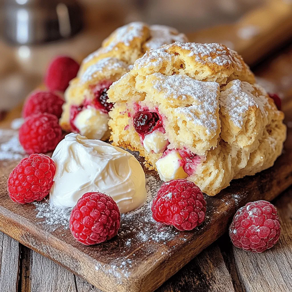 To make these delightful Raspberry White Chocolate Scones, you need a few simple ingredients. Here’s what you'll need: - 2 cups all-purpose flour - 1/4 cup granulated sugar - 1 tablespoon baking powder - 1/2 teaspoon salt - 1/4 cup cold unsalted butter, cut into cubes - 1/2 cup heavy cream - 1 large egg - 1 cup fresh raspberries (or frozen, thawed) - 1/2 cup white chocolate chips - 1 teaspoon vanilla extract - Coarse sugar, for sprinkling Each ingredient plays a key role. The all-purpose flour gives the scones structure. Granulated sugar adds sweetness, while baking powder helps them rise. Salt enhances flavor. Using cold unsalted butter makes the scones flaky. Heavy cream adds richness, and the egg binds the dough. Raspberries bring a burst of tartness, while white chocolate chips add sweetness. Vanilla extract rounds out the flavors. Coarse sugar on top gives a nice crunch. This mix creates a perfect balance of flavors and textures. You’ll love how these scones turn out! First, set your oven to 400°F (200°C). This temperature helps the scones rise well. Next, line a baking sheet with parchment paper. This keeps the scones from sticking and makes cleanup easy. In a large bowl, combine 2 cups of all-purpose flour, 1/4 cup of granulated sugar, 1 tablespoon of baking powder, and 1/2 teaspoon of salt. Whisk them together until blended. This mix forms the base of your scones. Now, take 1/4 cup of cold unsalted butter, cut into small cubes. Add this butter to your flour mixture. Use your fingertips or a pastry cutter. Work the butter into the flour until it looks like coarse crumbs. This gives the scones a flaky texture. In another bowl, whisk together 1/2 cup of heavy cream, 1 large egg, and 1 teaspoon of vanilla extract. Mix them until they are well combined. This creates a rich flavor and helps bind the dough. Pour your wet mixture into the dry ingredients. Stir gently with a spatula until just combined. Be careful not to overmix. This keeps your scones light and fluffy. Now it's time to add 1 cup of fresh raspberries and 1/2 cup of white chocolate chips. Gently fold them into the dough. Make sure they are well-distributed without breaking the raspberries too much. This adds bursts of flavor. Transfer the dough to a lightly floured surface. Knead it gently a few times to bring it together. Form the dough into a circle about 1 inch thick. This helps create even scones. Using a sharp knife or a round biscuit cutter, cut the dough into wedges or rounds. Arrange them on the prepared baking sheet, leaving space between each scone. This allows them to expand while baking. Place the baking sheet in your preheated oven. Bake for 15-20 minutes. Look for a golden brown color on top. This means your scones are perfectly baked. To make the best scones, you must avoid overmixing. This is key to keeping them light and fluffy. When you mix the wet and dry ingredients, stir just enough to combine them. A few lumps are okay! Using cold butter is also very important. Cold butter creates little pockets of air in the dough. This makes your scones rise nicely while baking. Cut the butter into small cubes before adding it to the flour. You’ll know your scones are done when they turn golden brown on top. The edges should look crisp, but the centers will still be soft. If you touch them lightly, they should spring back. Every oven cooks a bit differently. If your scones are not browning at 15 minutes, bake them for a few more minutes. Keep an eye on them to get the perfect bake. Serve your scones warm for the best taste. A dollop of clotted cream or butter on top brings out the flavors. It makes a delightful pairing! Garnish your scones with fresh raspberries. This adds a pop of color and freshness. Not only do they look great, but they also taste amazing! {{image_4}} You can change the fruit in these scones. Instead of raspberries, try blueberries, cranberries, or strawberries. Each fruit gives a new taste. For a tropical twist, add chopped pineapple or mango. Just remember to keep the amount of fruit the same. If you need gluten-free scones, use a gluten-free flour blend. Many brands work well for baking. Follow the instructions on the package for best results. For a dairy-free version, swap heavy cream with coconut cream or almond milk. Use dairy-free butter for a tasty and smooth texture. You can add spices to match the season. In fall, try cinnamon or nutmeg for warmth. In winter, a hint of ginger can brighten flavors. For spring and summer, fresh herbs like mint or basil add a refreshing twist. Feel free to get creative with the flavors you love! To store your scones at room temperature, place them in an airtight container. This keeps them fresh for up to two days. If you want to keep them from getting dry, add a piece of bread to the container. The bread helps maintain moisture. For long-term storage, freezing is best. Allow the scones to cool completely first. Wrap each scone tightly in plastic wrap. Then, place them in a freezer-safe bag. They can stay fresh for up to three months. When you’re ready to enjoy them, just take out what you need. To reheat scones, use an oven for the best results. Preheat your oven to 350°F (175°C). Place the scones on a baking sheet. Heat them for about 5 to 10 minutes. This helps restore their soft, fluffy texture. You can also use a microwave, but the oven is better for taste. Yes, you can use frozen raspberries. They work well in scones, but there are pros and cons. Pros: - Frozen raspberries are available year-round. - They often cost less than fresh berries. - They save prep time since you skip washing and picking. Cons: - They may release more juice, making the dough wetter. - You could lose some of the berry's shape when mixing. - Fresh raspberries taste brighter and more vibrant. Check for key signs to know your scones are ready. - They should be golden brown on top. - You can gently press them; they should feel firm. - A toothpick inserted in the center