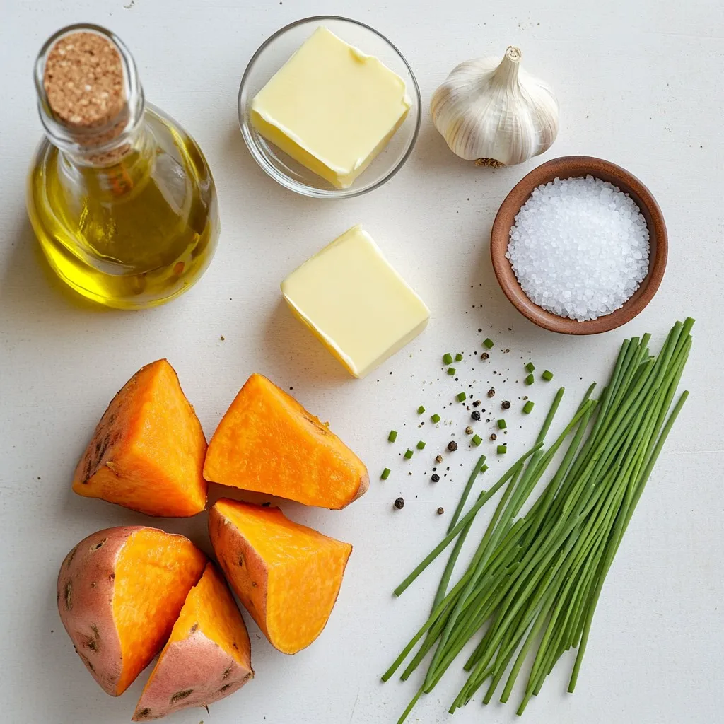 First, gather all your ingredients. You will need two large sweet potatoes, one head of garlic, olive oil, almond milk, butter, sea salt, black pepper, and fresh chives.