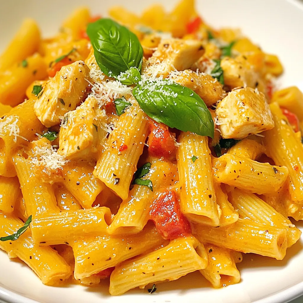 Each ingredient plays a vital role in making this dish delicious. The penne pasta brings a nice bite, while the chicken offers a hearty protein. Roasted red peppers add a sweet and smoky flavor. Garlic enhances the taste, and heavy cream gives the sauce a rich texture. Parmesan cheese adds a touch of saltiness and depth. Olive oil helps in cooking and flavoring. Italian seasoning ties all the flavors together, while salt and pepper balance the taste. Fresh basil provides a fragrant garnish that elevates the dish.