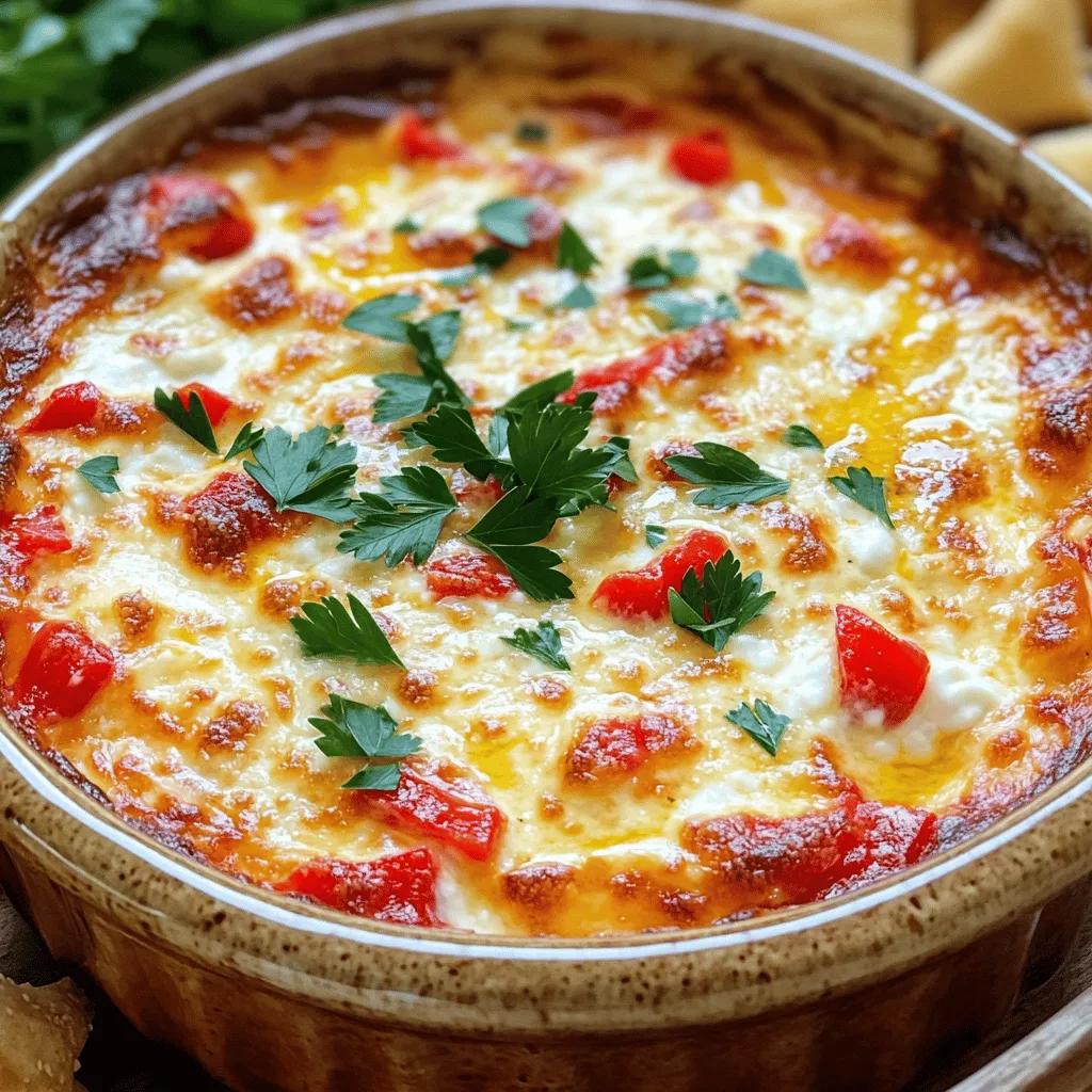 For this dip, you need 1 cup of roasted red peppers. You can use store-bought or make your own. If you opt for homemade, roast fresh red peppers until the skin blisters. This gives them a sweet, smoky flavor. The dip shines with 8 ounces of goat cheese and 2 tablespoons of cream cheese. Make sure both cheeses are softened to room temperature. This helps them blend together easily, creating a smooth texture. You’ll want to add 2 tablespoons of extra virgin olive oil for richness. Include 1 clove of finely minced garlic for a savory note. For a hint of freshness, toss in 1 teaspoon of fresh thyme leaves or ½ teaspoon of dried thyme. If you like a kick, add ¼ teaspoon of red pepper flakes. Lastly, season with salt and black pepper to taste. Top the dip with fresh parsley, finely chopped, for a pop of color. You can find the full recipe [here](#). To start, you need to prepare the roasted red peppers. You can use store-bought or make your own. If you choose jarred roasted red peppers, drain them carefully. Pat them dry with a paper towel to remove excess moisture. If you want to roast fresh peppers, place them on a baking sheet. Roast them in a preheated oven at 375°F (190°C) for about 20 minutes. Look for blistered skin. Once done, let them cool, peel off the skins, and chop them into small pieces. Now, it's time to mix the dip. In a large bowl, combine the chopped roasted red peppers, 8 oz of softened goat cheese, and 2 tablespoons of cream cheese. Add 2 tablespoons of extra virgin olive oil and 1 clove of finely minced garlic. Sprinkle in 1 teaspoon of fresh thyme leaves, or ½ teaspoon if you use dried thyme. For some heat, you can add ¼ teaspoon of red pepper flakes. Season with salt and pepper to taste. Use a fork or spatula to mash and mix until the dip is smooth and creamy. Next, spoon the creamy mix into an oven-safe dish. Spread it out evenly for even cooking. Place the dish in your preheated oven. Bake for about 20 minutes, or until the top is bubbly and lightly golden. After baking, remove the dip from the oven and let it cool for a few minutes. This helps it set. Before serving, sprinkle freshly chopped parsley on top for color. Serve it warm with crispy pita chips, toasted crostini, or fresh veggie sticks for dipping. Enjoy your Roasted Red Pepper Goat Cheese Dip! For the complete recipe, check out the Full Recipe. For a creamier dip, use full-fat cream cheese. It blends well with goat cheese. If you want a lighter dip, use low-fat cream cheese instead. If you prefer a chunkier texture, leave some roasted red pepper pieces. This adds a nice bite. To boost flavor, add herbs like basil or oregano. Fresh herbs make the dip lively. A squeeze of lemon juice brightens the taste too. You can also mix in some smoked paprika for a deeper flavor. Adjust the red pepper flakes for your spice level. Serve this dip warm for the best taste. It pairs well with crispy pita chips, toasted crostini, or colorful veggie sticks. For a fun twist, try it on a sandwich or wrap. You can find the full recipe online for detailed steps. {{image_4}} You can add heat to this dip easily. Mix in more red pepper flakes for a spicy twist. You can also use diced jalapeños for a fresh kick. Both options bring warmth and flavor. Adjust the spice to match your taste. Just remember, a little goes a long way! Herbs can enhance the flavor of your dip. Try adding fresh basil or oregano for a garden taste. You could also mix in some chives for a mild onion flavor. Each herb brings its unique touch. Feel free to experiment with your favorites. Fresh herbs can make a big difference! If you like a creamier dip, add more cream cheese or sour cream. This will make it rich and smooth. You can also blend in some Greek yogurt for a tangy twist. Adjust the consistency to your liking. A creamier dip pairs well with crunchy veggies and chips. For a thicker texture, use less olive oil. You can tweak it to suit your taste! For the full recipe, check out the Roasted Red Pepper & Goat Cheese Delight. After you make the Roasted Red Pepper Goat Cheese Dip, let it cool. Cover it with plastic wrap or a lid. Store it in the fridge for up to five days. This dip tastes great cold or warm. Just remember to check for any signs of spoilage before eating. You can freeze this dip to enjoy later. Place it in an airtight container. It will last up to three months in the freezer. When you are ready to use it, let it thaw in the fridge overnight. To reheat the dip, place it in an oven-safe dish. Preheat the oven to 350°F (175°C). Bake for about 15-20 minutes until hot. You can also microwave it for a quick option. Heat in short bursts, stirring in between, until it is warm throughout. Enjoy it fresh like the day you made it! Yes, you can use fresh red peppers. However, roasting them enhances their flavor. Roasting brings out their sweetness and adds a smoky taste. To roast, place them in the oven until their skin blisters. This process takes about 20 minutes. Once they cool, peel the skins off and chop them. This method will give your dip a richer flavor. The dip lasts about 3 to 5 days in the fridge. Make sure to store it in an airtight container. Keep it cool and covered to maintain its taste and texture. If you notice any changes in smell or color, it’s best to toss it out. Enjoy the dip fresh for the best flavor. You can serve the dip with many tasty options. Here are a few ideas: - Crispy pita chips - Toasted crostini - Fresh veggie sticks like carrots and cucumbers - Crackers or bread slices These choices pair well with the creamy dip. They add texture and a nice crunch. For a fun twist, try mixing in some herbs or spices to your dippers! Check out the Full Recipe for more serving ideas! This blog post covered how to make a tasty Roasted Red Pepper Goat Cheese Dip. We looked at key ingredients, from roasted peppers to special seasonings. I provided step-by-step instructions, tips for better texture and flavor, and served up creative 