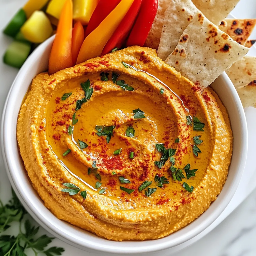 Each ingredient plays a key role in creating a creamy and tasty dip. The chickpeas provide a hearty base, while roasted red bell peppers add a sweet, smoky flavor. Tahini gives the hummus a rich, nutty taste. Fresh lemon juice brightens up the mix, and garlic brings a kick. Spices like cumin and smoked paprika add depth. Olive oil gives a silky texture, and salt ties everything together. Fresh parsley is not just for looks; it adds a fresh note. Serve with pita chips and veggie sticks for a fun, healthy snack!