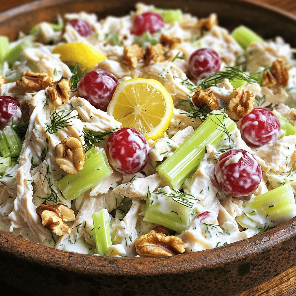 Start by gathering your ingredients. You need cooked chicken, Greek yogurt, celery, grapes, walnuts, dill, lemon juice, garlic powder, salt, and pepper.