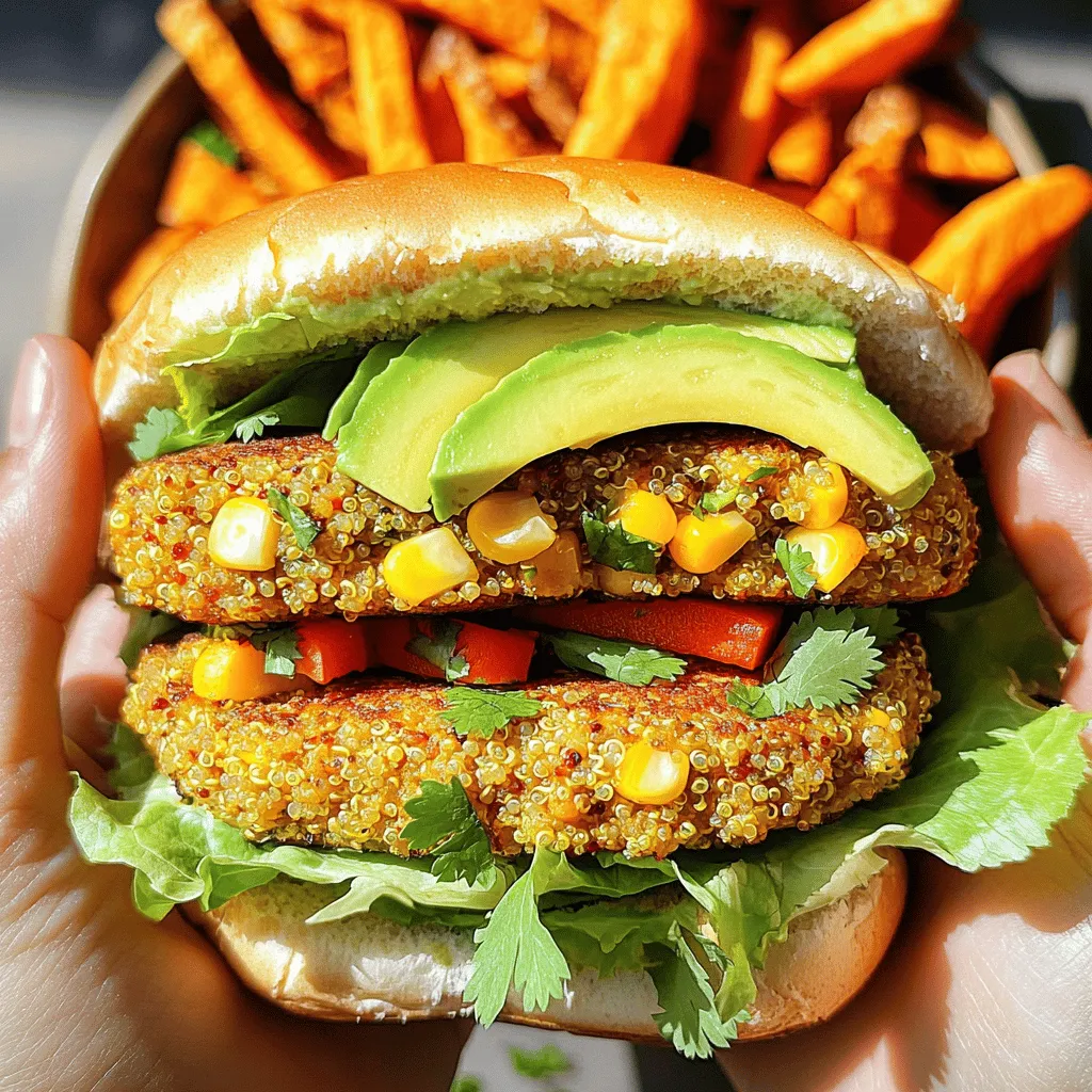 - 1 cup cooked quinoa - 1 can black beans, drained and rinsed - 1/2 cup breadcrumbs (whole wheat or gluten-free) - 1/2 cup corn kernels (fresh or frozen) - 1/4 cup red bell pepper, finely chopped - 1/4 cup onion, finely diced - 2 cloves garlic, minced - 1 teaspoon ground cumin - 1/2 teaspoon smoked paprika - 1 teaspoon salt - 1/2 teaspoon freshly ground black pepper - 1 tablespoon fresh cilantro, chopped (optional) - 1 large egg (or a flax egg for a vegan option) - Olive oil for cooking The main ingredients in these savory quinoa veggie burgers create a tasty meal. Quinoa is not only filling but also packs a protein punch. Black beans add creaminess and fiber. Breadcrumbs help bind everything together, making the patties sturdy. The corn provides a pop of sweetness. Red bell pepper and onion add crunch and flavor. Garlic offers a savory kick. For seasoning, cumin gives warmth, and smoked paprika adds depth. Salt and black pepper enhance all the flavors. You can add fresh cilantro for a hint of brightness if you like. You’ll need an egg or a flax egg to help hold the mix together. Olive oil is used for cooking, giving the patties a nice golden color. With these ingredients, you're ready to make delicious quinoa veggie burgers. Check out the Full Recipe for details! Start by gathering your ingredients. In a large mixing bowl, combine 1 cup of cooked quinoa with 1 can of black beans that you have drained and rinsed. Use a fork to gently mash the black beans. Leave some beans whole for a nice texture. This base gives the burgers a hearty feel. Next, add in the fun stuff! Mix in 1/2 cup of breadcrumbs, 1/2 cup of corn kernels, 1/4 cup of finely chopped red bell pepper, 1/4 cup of diced onion, and 2 cloves of minced garlic. Sprinkle in 1 teaspoon of ground cumin, 1/2 teaspoon of smoked paprika, 1 teaspoon of salt, and 1/2 teaspoon of black pepper. If you like, toss in 1 tablespoon of chopped cilantro for extra flavor. These ingredients bring your veggie burgers to life. If you want a vegan burger, prepare a flax egg. Mix 1 tablespoon of flaxseed meal with 3 tablespoons of water. Let it sit for 5 minutes to thicken. Now, add this flax mixture or a beaten egg to your main bowl. Stir everything well until it’s all mixed together. If the mixture feels too wet, add more breadcrumbs until you get the right consistency. Now comes the fun part! Divide the mixture into equal portions. Shape each portion into a patty, about 4 to 6 depending on your size preference. Heat a skillet over medium heat and drizzle some olive oil in. Once the oil is hot, carefully add the patties. Cook each side for about 4 to 5 minutes until they turn golden brown and crispy. After cooking, let the burgers rest on a plate for a minute before serving. For the full recipe, check out Quinoa Power Veggie Burgers. To get the best texture, use breadcrumbs. They help bind the ingredients. If the mixture feels too wet, add more breadcrumbs. This makes the patties firm. When shaping, press them gently. This helps them hold together while cooking. You can cook these burgers in two ways: skillet or oven. The skillet method gives a nice crispy edge. Heat the skillet over medium heat and add olive oil. Cook each side for 4-5 minutes. If you prefer baking, place them on a tray. Bake at 375°F for about 20 minutes. Flip halfway through for even cooking. When serving, use whole grain buns. Top with creamy avocado, crisp lettuce, and juicy tomato. A dollop of spicy aioli or hummus adds great flavor. For sides, try sweet potato fries or a light salad. These make your meal colorful and tasty. Enjoy the vibrant look and delicious taste of your quinoa veggie burgers! {{image_4}} You can make these quinoa veggie burgers even tastier! Add spices like chili powder or cumin for a kick. These spices bring warmth and depth to each bite. You can also mix in different veggies. Try grated carrots or diced zucchini for added nutrition and color. Peppers add sweetness, while spinach gives a nice green touch. If you are vegan, you can easily adapt this recipe. Use a flax egg instead of a regular egg. Just mix 1 tablespoon of flaxseed meal with 3 tablespoons of water. Let it sit for a few minutes until it thickens. For gluten-free variations, swap regular breadcrumbs for gluten-free ones. You can also use mashed sweet potatoes or ground oats as binders. Get creative with how you serve these burgers! You can make sliders for a fun party snack. Just shape smaller patties and serve them on mini buns. Another option is to serve them in bowls. Top with fresh greens, salsa, and avocado. You can enjoy these burgers in many ways, making them perfect for any meal. [Full Recipe] To keep your cooked quinoa veggie burgers fresh, store them in the fridge. Place the patties in an airtight container. They can last up to three days. When you're ready to eat, reheat them on the stove or in a microwave. For the stove, heat a skillet over medium heat. Add a little oil and cook each side for about three minutes. If using a microwave, place them on a plate and cover with a damp paper towel. Heat for about one minute. For long-term storage, freezing is a great option. You can freeze both cooked and uncooked patties. To freeze cooked patties, let them cool completely first. Then, layer parchment paper between each patty to prevent sticking. Place them in a freezer-safe bag and seal tightly. They can stay frozen for up to three months. For uncooked patties, form them as usual and freeze them in the same way. When you're ready to cook frozen patties, thaw them in the fridge overnight. This makes them easier to cook. If you're in a hurry, you can cook them straight from frozen. Just add a few extra minutes to the cooking time. Cook them until they are golden brown and warm throughout. Enjoy your tasty quinoa veggie burgers any time! [Full Recipe] How can I make these quinoa veggie burgers gluten-free? To make these quinoa veggie burgers gluten-free, use gluten-free breadcrumbs. Ch