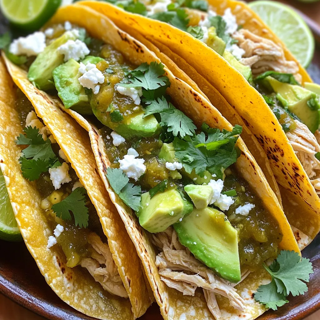 To prepare the corn tortillas, warm them in a skillet over medium heat. Cook each tortilla for about 30 seconds on each side. This makes them pliable and fragrant. Now, it’s time to assemble the tacos! Take a tortilla and add a generous portion of the shredded salsa verde chicken in the center. Top each taco with freshly chopped cilantro, a few slices of creamy avocado, and a crumble of queso fresco. Serve immediately with lime wedges on the side for a zesty touch.