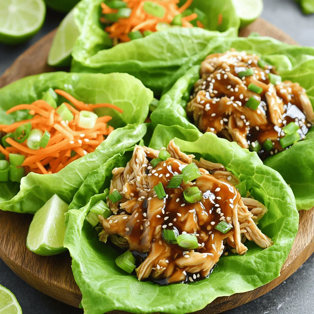 To make these tasty wraps, gather these key ingredients: - 2 lbs boneless, skinless chicken thighs - 1/2 cup low-sodium soy sauce - 1/4 cup honey - 1/4 cup rice vinegar - 2 tablespoons sesame oil - 1 tablespoon fresh ginger, finely minced - 3 garlic cloves, finely minced - 1 teaspoon red pepper flakes (optional, for a touch of heat) - 1 cup shredded carrots - 1 cup chopped green onions - 1 tablespoon cornstarch mixed with 2 tablespoons water (slurry for thickening) - 1 head of butter or iceberg lettuce, leaves carefully separated - Sesame seeds, for garnish You can customize your wraps with these extras: - Add sliced bell peppers for extra crunch. - Include chopped cilantro for a fresh taste. - Use avocado slices for creaminess. - Try different nuts for added texture, like chopped peanuts or cashews. Always pick high-quality ingredients for the best flavor. Fresh chicken thighs give a tender bite. Use low-sodium soy sauce to control salt levels. Fresh ginger and garlic add much-needed zest. Choose ripe veggies to enhance taste. Organic honey can provide a richer sweetness. Start with your chicken thighs. Lay them flat in the slow cooker. Spread them out for even cooking. This helps them cook well and stay juicy. Grab a medium bowl. In it, whisk together the soy sauce, honey, rice vinegar, and sesame oil. Add the minced ginger and garlic, then stir well. If you like heat, toss in the red pepper flakes. Make sure the honey dissolves completely. Pour the teriyaki sauce over the chicken in your slow cooker. Cover it with the lid. Set it to cook on low for 6-7 hours, or high for 3-4 hours. When it's done, the chicken will be tender. Remove the chicken and place it on a cutting board. Use two forks to shred it into bite-sized pieces. With the slow cooker still on high, mix cornstarch with water in a small bowl. Add this slurry to the sauce in the cooker. Stir it well and let it cook for 10 more minutes. This thickens the sauce nicely. Once thick, return the shredded chicken to the cooker. Gently fold it into the sauce. Add the shredded carrots and chopped green onions. Stir until everything is well mixed. To serve, take a lettuce leaf. Spoon some of the teriyaki chicken mixture onto the leaf. Sprinkle sesame seeds on top for crunch. Enjoy the fresh taste and savory flavors! To make teriyaki sauce pop, use low-sodium soy sauce. This keeps the dish balanced. Honey adds sweetness, while rice vinegar gives it a tangy kick. Fresh ginger and garlic bring depth. If you like heat, add red pepper flakes. Mix these ingredients well before pouring over the chicken. Let it marinate. This step helps the chicken soak up all the rich flavors. After cooking, the chicken should be tender. This makes shredding simple. Use two forks to pull apart the chicken. Start in the middle and work your way out. If the chicken feels tough, it may need more cooking time. Always check for tenderness before shredding. Shredded chicken works best when moist, so avoid letting it sit too long without sauce. For eye-catching wraps, use fresh, crisp lettuce. Butter or iceberg lettuce works great. Lay out the filled wraps on a colorful platter. Garnish with sesame seeds and chopped green onions for a pop of color. Adding lime wedges gives a zesty touch. This contrast brightens the dish and enhances flavors. It makes your meal look as good as it tastes! {{image_4}} You can swap chicken thighs for other proteins. Try using boneless chicken breasts for a lighter option. Pork tenderloin also works well; it becomes tender and juicy in the slow cooker. For beef lovers, flank steak can be a great choice. Just adjust the cooking time to ensure the meat becomes tender. For a vegetarian or vegan dish, replace the chicken with tofu or tempeh. Both options soak up the teriyaki sauce well. Use firm tofu for the best texture. You can also add more veggies like bell peppers and mushrooms for added flavor and nutrition. Ensure the soy sauce is vegan-friendly to keep the meal plant-based. To change the heat in your teriyaki chicken, add more or fewer red pepper flakes. If you like it spicy, try adding sriracha or chili paste. For a milder taste, simply leave out the red pepper flakes. You can also serve the wraps with hot sauce on the side for those who enjoy an extra kick. After enjoying your teriyaki chicken lettuce wraps, let the leftovers cool. Store them in an airtight container. This keeps the chicken moist and fresh. Place the container in the fridge. It will stay good for up to four days. To reheat, you can use a microwave. Place the chicken in a bowl. Cover it with a damp paper towel. Heat for one to two minutes. Stir halfway through for even warming. You can also use a skillet on low heat. This helps keep the chicken juicy. If you want to save some for later, freezing is perfect. Put the cooled chicken in a freezer-safe bag. Squeeze out any air before sealing it. Label the bag with the date. It can last in the freezer for up to three months. When you're ready to eat, thaw it in the fridge overnight. Reheat as mentioned above. Enjoy your meal again! Yes, you can use chicken breasts. They will cook faster. Chicken breasts are leaner than thighs. You may need to check for doneness sooner. They can dry out if overcooked, so monitor closely. You can use maple syrup or agave nectar. Both give a sweet flavor. Brown sugar is another option; just mix it with some water. This will help it dissolve better. Each choice will change the taste slightly. To spice it up, add more red pepper flakes. You can also use sriracha or chili paste. Start with a little, then taste. Adjust to your heat level. This way, you keep control over the spice. Yes, you can make this in an Instant Pot. Cook on high for about 15 minutes. Use the natural release method for best results. This will keep the chicken moist and tender. Adjust the sauce thickening step to finish. This blog post covered how to make slow cooker teriyaki chicken. We explored essential and optional ingre