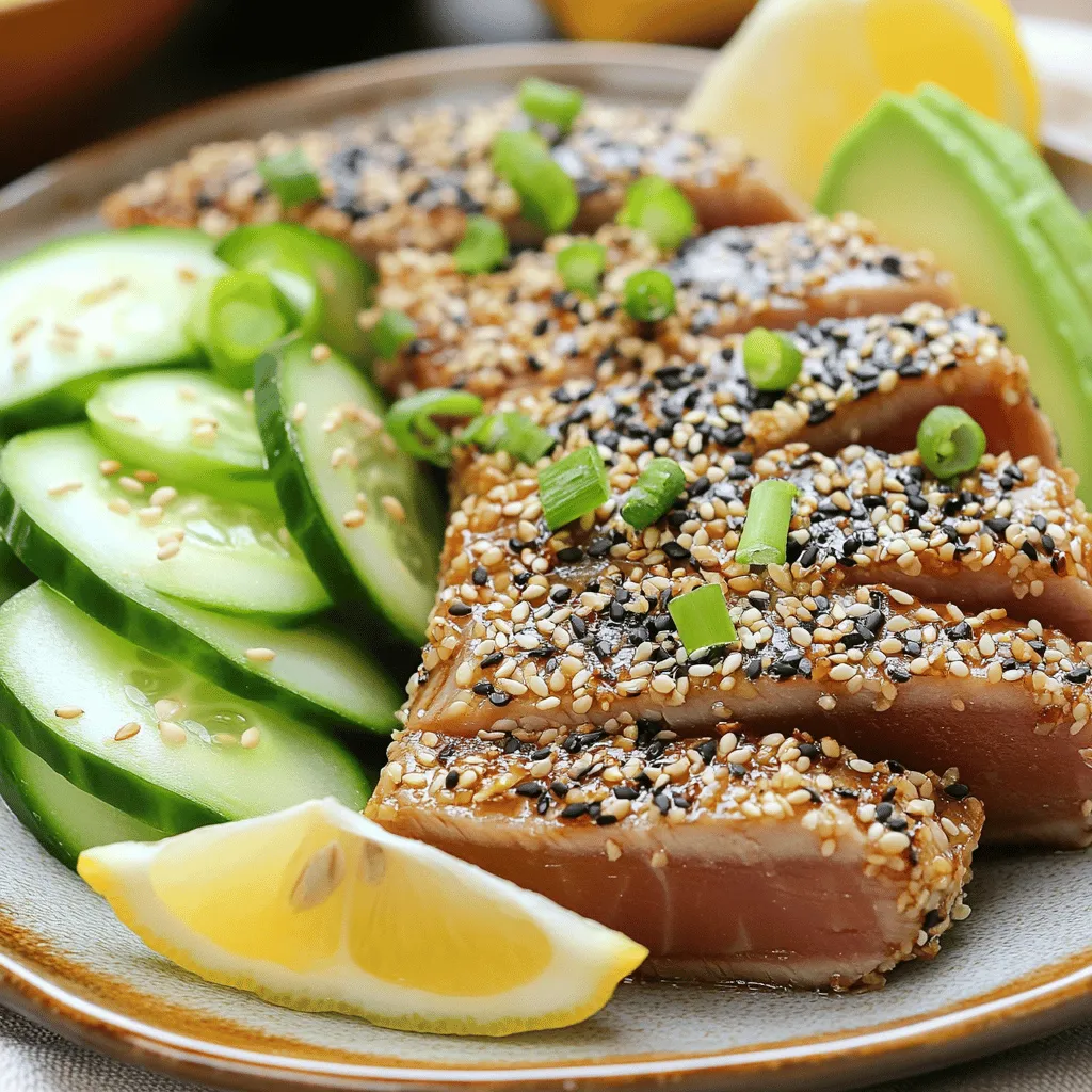 Serve the sliced tuna on a plate with avocado and cucumber slices. Sprinkle with chopped green onions for a fresh touch. Drizzle any remaining soy-ginger mixture over the top. Add lemon wedges on the side for a zesty finish. Enjoy this tasty and healthy delight!