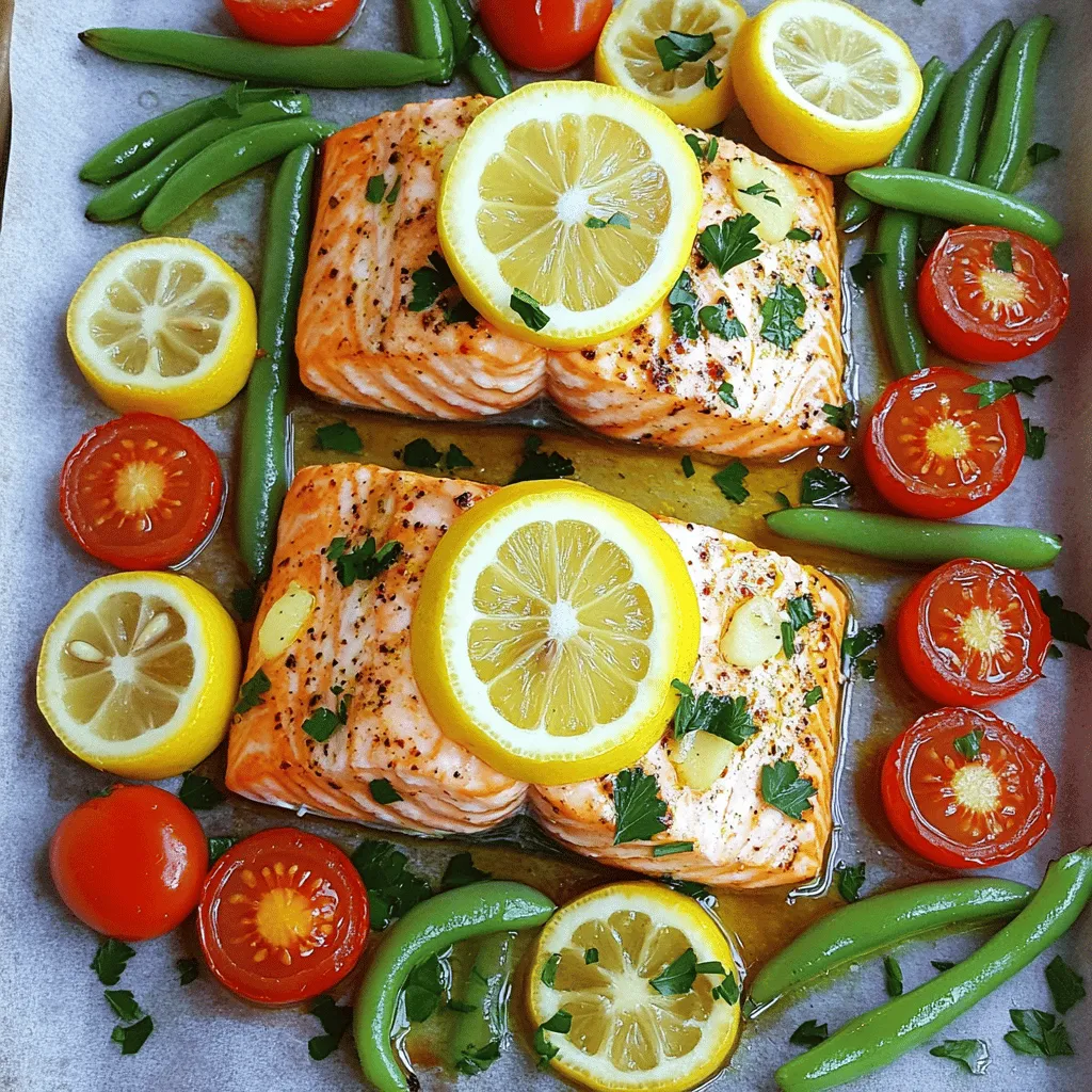 ![This sheet pan lemon garlic salmon recipe brings bright flavors to your dinner table. It combines salmon, fresh veggies, and a simple marinade. The best part? Everything cooks in one pan! - 4 salmon fillets (approximately 6 oz each) - 4 tablespoons extra virgin olive oil - 4 cloves garlic, finely minced - 2 lemons (1 sliced into thin rounds, 1 juiced) - 1 teaspoon dried oregano - 1 teaspoon smoked paprika - Salt and freshly ground black pepper to taste - 1 cup cherry tomatoes, halved - 1 cup fresh green beans, washed and trimmed - Fresh parsley, finely chopped (for garnish) To make this dish, you need a few simple tools: - A large baking sheet - Parchment paper - A small mixing bowl - A whisk or fork - A brush for the marinade - A sharp knife for slicing These tools will help you create a meal that tastes great and looks lovely. You’ll want to have everything ready before you start cooking. To start, I mix the marinade. In a small bowl, I combine 4 tablespoons of olive oil and 4 minced garlic cloves. Then, I squeeze the juice of one lemon into the bowl. I also add 1 teaspoon of oregano and 1 teaspoon of smoked paprika. Finally, I sprinkle in some salt and black pepper. I whisk this mixture until it blends well. This marinade adds a bright flavor to the salmon. Next, I prepare the baking sheet. I line it with parchment paper for easy cleanup. Then, I place 4 salmon fillets on one side of the sheet. I use a brush to coat the top of each fillet with the marinade. On the other side, I add 1 cup of halved cherry tomatoes and 1 cup of trimmed green beans. I drizzle the leftover marinade over the veggies and toss them gently. This helps each piece soak up the flavors. I finish by topping the salmon with lemon slices. Now, it’s time to bake. I preheat my oven to 400°F (200°C). Once it’s hot, I carefully place the baking sheet inside. I bake for about 15 to 18 minutes. The salmon should look opaque and flake easily with a fork. The veggies will be tender but still crisp. After baking, I take the sheet out and let it rest for a few minutes. This resting time helps the flavors come together. I garnish with chopped parsley and serve hot. For the full recipe, check above! The best cooking time for salmon is about 15 to 18 minutes at 400°F (200°C). Salmon is done when it turns opaque and flakes easily with a fork. If your fillets are thicker, you might need an extra few minutes. Always check your salmon to avoid overcooking. When selecting salmon, look for bright, moist fillets. The flesh should be firm and spring back when pressed. Avoid any fish with a strong fishy smell or dull color. Fresh salmon also has clear eyes and shiny skin. Ask your fishmonger for the day’s catch to ensure quality. You can boost the flavor of your lemon garlic salmon by adding fresh herbs. Try dill or thyme for a fresh twist. Basil also works well if you want a sweeter flavor. Simply sprinkle your chosen herbs on the salmon before baking for added aroma and taste. This can elevate your dish to new heights! For the full recipe, check out the entire guide on making this tasty dish. {{image_4}} If you can't find salmon, try other fish. Cod, trout, or tilapia work well. Each fish has a unique flavor, but they all pair nicely with lemon and garlic. You can also use chicken breast for a different twist. Just adjust the cooking time; chicken needs about 25-30 minutes to cook through. For a vegetarian side, swap green beans with broccoli or asparagus. Both add great texture and nutrients. You could also roast bell peppers or zucchini. They soak up the lemon and garlic flavor too! Serve with a side of quinoa or couscous for a heartier meal. To spice things up, add red pepper flakes to the marinade. This will give your dish a warm kick. If you prefer herbs, try fresh basil or thyme instead of oregano. Both add fresh notes that brighten the dish. Mix and match these ideas to create your perfect plate! For the full recipe, check here: [Full Recipe]. To keep your leftover salmon, place it in an airtight container. Make sure to cool it first. Store it in the fridge for up to three days. If you have leftover vegetables, store them in a separate container. They will also stay fresh in the fridge for the same time. When you want to reheat your salmon, the oven is best. Set it to 350°F (175°C). Place the salmon on a baking sheet and cover it with foil. Heat for about 10 minutes. This way, the salmon stays moist. You can also reheat the vegetables in the microwave for about one minute. Stir them halfway to heat evenly. If you want to freeze leftovers, wrap them tightly in plastic wrap or foil. Place them in a freezer-safe bag. You can freeze salmon for up to three months. The vegetables can also be frozen but may lose some crispness. When ready to eat, thaw them overnight in the fridge before reheating. This method keeps the best taste and texture. Enjoy your meal anytime! Cooking salmon in the oven usually takes 15 to 18 minutes. The time may change based on the thickness of the fillet. A good rule is to cook it for about 4 to 6 minutes per half-inch of thickness. When done, the salmon should look opaque and flake easily with a fork. This method keeps the fish juicy and full of flavor. Yes, you can use frozen salmon. Just make sure to thaw it first. The best way to thaw salmon is in the fridge overnight. If you're in a hurry, you can run it under cold water for about an hour. After thawing, pat it dry before marinating. This helps the flavors stick better. Lemon garlic salmon pairs well with many sides. Here are some ideas: - Rice: Fluffy white rice or wild rice complements the dish well. - Quinoa: This grain adds a nice nutty flavor and texture. - Roasted Vegetables: Carrots, broccoli, or zucchini work great. - Salad: A fresh green salad adds crunch and brightness. - Potatoes: Mashed or roasted potatoes are always a hit. For more ideas and the full recipe, check out the complete details in the article! This blog post covere