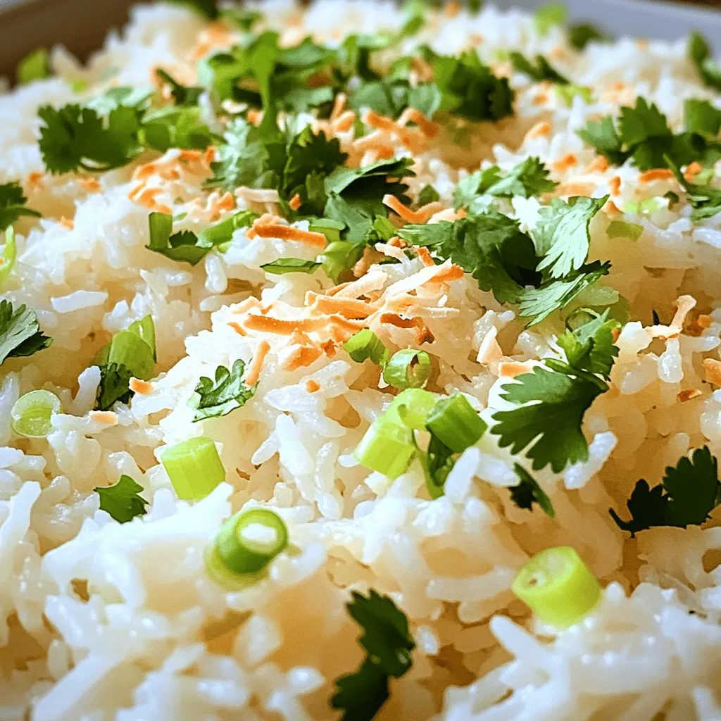 ![- 1 cup jasmine rice - 1 cup coconut milk - 1 cup water - 1 tablespoon sugar - 1/2 teaspoon salt - 1/4 cup shredded coconut (toasted) - Fresh cilantro leaves - Chopped green onions To make simple coconut rice, you need just a few basic ingredients. Start with jasmine rice, which gives a fluffy texture and a nice scent. Coconut milk adds creaminess and a sweet flavor. Water helps cook the rice perfectly. You can enhance the taste with sugar and salt. Sugar brings out the coconut's natural sweetness, while salt balances the flavors. Toasted shredded coconut adds a nice crunch and extra coconut flavor. For garnishing, I love using fresh cilantro leaves or chopped green onions. They not only add color but also brighten the dish. These simple ingredients come together to create a delightful side dish. For the full recipe, check out Tropical Coconut Rice Delight. - Rinse jasmine rice: Start by rinsing your jasmine rice. Use cold water and rinse until the water runs clear. This step removes extra starch and stops the rice from being sticky. - Combine ingredients: In a medium pot, mix the rinsed jasmine rice with coconut milk, water, sugar, and salt. Stir gently to blend everything well. - Bring to boil: Set the pot over medium-high heat. Watch closely as the mixture heats up to a gentle boil. - Simmer and steam: Once boiling, reduce the heat to low. Cover the pot tightly with a lid to trap steam. Let it simmer for about 15 to 18 minutes. The liquid should absorb fully, and the rice should be tender. - Fluff the rice: After cooking, remove the pot from heat. Keep it covered for 5 more minutes. This allows the rice to steam and fluff up nicely. Use a fork to gently fluff the rice. - Add toasted coconut: Fold in the toasted shredded coconut. This adds a nice crunch and tropical flavor. Serve your coconut rice warm. It’s perfect as a side dish or a base for many meals. If you want to impress, try the [Full Recipe] for tropical coconut rice delight. Rinsing rice is key. Rinse your jasmine rice until the water runs clear. This step removes extra starch. It helps keep the rice fluffy. After rinsing, drain the rice well. Managing cooking temperature is also vital. Start by boiling the rice mixture on medium-high heat. Once it boils, lower the heat right away. Cover the pot tightly to trap steam. This method cooks the rice evenly. Using fresh coconut adds a rich taste. Grate fresh coconut and mix it in while cooking. This step boosts the coconut flavor. You can also add more spices. A pinch of cinnamon or cardamom can make a difference. Try adding a splash of lime juice for brightness. It pairs well with coconut. You’ll find that a little goes a long way. Serve coconut rice in fun ways. Hollow out a pineapple and fill it with rice. This makes a great centerpiece. You can also use coconut shells for a tropical look. For garnishing, add toasted coconut on top. Sprinkle fresh cilantro or green onions for color. These small touches make your dish pop. They also show off your culinary skills. For the full recipe, check out Tropical Coconut Rice Delight. {{image_4}} Adding fruit to coconut rice makes it fun and tasty. You can add pineapple for a sweet touch. Cut fresh pineapple into small pieces and mix them in after cooking. The juicy pineapple adds a tropical flair. You can also incorporate mango. Just like pineapple, cut fresh mango into small chunks. Mix them in gently after you fluff the rice. The mango adds a nice sweetness that balances well with the coconut. Both fruits create a colorful and vibrant dish. You can make coconut rice savory too! Instead of using water, try broth. Chicken or vegetable broth adds rich flavor. Just replace the water with broth in the recipe. This change gives the rice depth and pairs well with many savory meals. Another option is to add spices like turmeric. This spice gives a warm color and a slight earthiness. Stir in a teaspoon of turmeric when you mix the ingredients. It’s an easy way to transform your coconut rice into a more complex side dish. If you want vegan options, you are in luck! The main ingredients are already vegan-friendly. Just check that your sugar is vegan. Some sugars are processed with bone char. For gluten-free folks, coconut rice is a safe choice. All the ingredients are naturally gluten-free. Just ensure your broth is also gluten-free if you choose that option. This way, everyone can enjoy this delightful dish. For the full recipe, check here: [Full Recipe]. After you make coconut rice, let it cool down first. Store leftovers in an airtight container. This keeps the rice fresh and tasty. The rice will stay good for about 3 to 5 days in the fridge. To avoid drying out, always seal the container well. You can freeze coconut rice too! Place it in a freezer-safe bag or container. Make sure to remove as much air as possible. This helps keep the texture nice. Coconut rice can last up to 2 months in the freezer. When you want to use it, let it thaw in the fridge overnight. When reheating, you can choose between a microwave or stovetop. For the microwave, heat it in short bursts. Add a splash of water or coconut milk to keep it moist. If you use the stovetop, warm it gently over low heat. Stir it often, and add liquid as needed. This way, your coconut rice stays soft and fluffy. Enjoy your meal! Coconut rice lasts about 3 to 5 days in the fridge. Store it in an airtight container. This keeps it fresh and helps prevent odors from other foods. When you’re ready to eat, just reheat it until hot. Yes, you can make coconut rice with brown rice. Use 1 cup of brown rice and 1 cup of coconut milk with 1 and 1/4 cups of water. Cook it for a bit longer, about 30 to 40 minutes. Brown rice takes longer to soften, so be patient for that perfect texture. Coconut rice pairs well with many dishes. Try it with grilled chicken or fish. It also goes great with shrimp, curries, or stir-fried veggies. You can even serve it with a fresh salad for a light meal. Coconut 