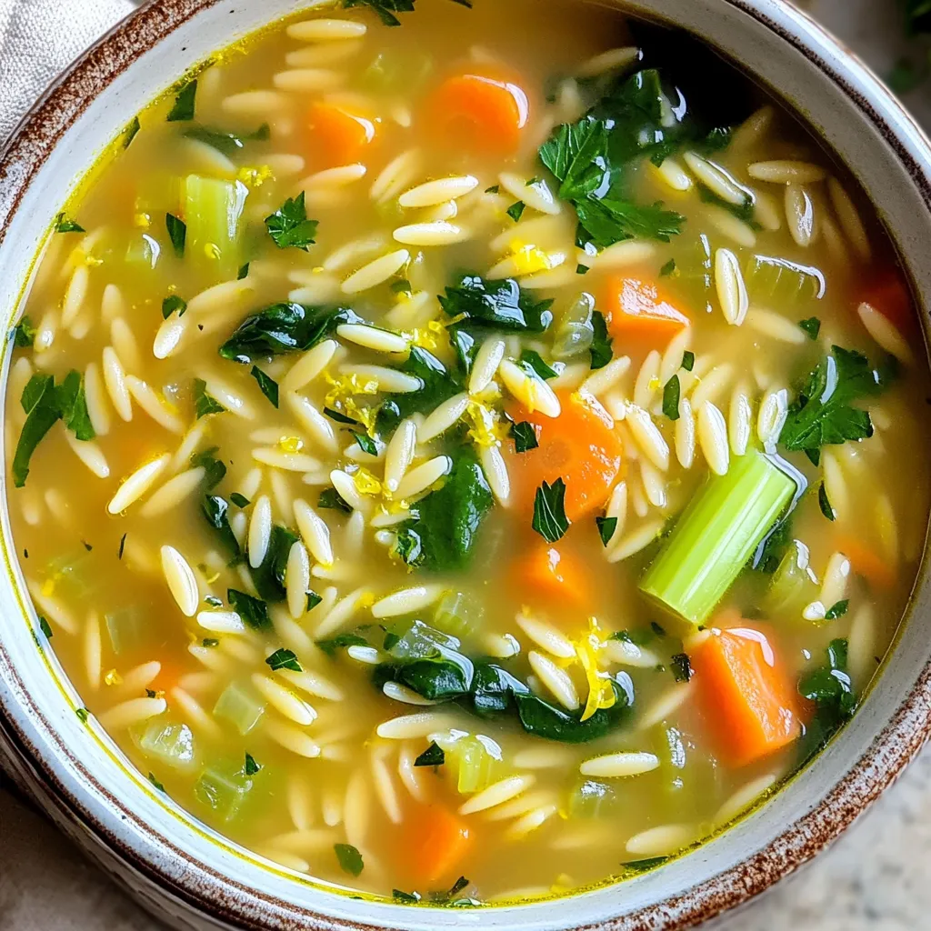 To make Slow Cooker Lemon Garlic Orzo Soup, gather these key items: - 1 cup orzo pasta - 1 tablespoon extra virgin olive oil - 1 medium onion, finely diced - 3 cloves of garlic, minced - 3 medium carrots, peeled and diced - 2 celery stalks, chopped - 6 cups vegetable broth - 1 large lemon (zested and juiced) - 1 teaspoon dried thyme - 1 teaspoon dried oregano - 1 bay leaf - Sea salt and freshly cracked black pepper to taste - 2 cups fresh spinach or kale, roughly chopped - Fresh parsley, finely chopped (for garnish) These ingredients create a rich and hearty soup. The orzo adds a nice texture, while lemon brightens the dish. You can enhance the soup with extras. Here are some ideas: - Protein: Add shredded chicken or cooked beans for a heartier meal. - Vegetables: Toss in zucchini, peas, or bell peppers for more color and nutrition. - Greens: Substitute arugula or chard for a different leafy taste. Feel free to mix and match based on your taste and what you have on hand. The right seasonings bring this soup to life. Use these for the best flavor: - Fresh herbs: Add basil or dill for a fresh twist. - Spices: A pinch of red pepper flakes adds heat. - Citrus: A splash of lime juice can also brighten the flavors. These seasonings can make your soup unique. Adjust them based on your mood and cravings. Start by heating the olive oil in a skillet over medium heat. When the oil is hot, add the finely diced onion. Sauté the onion for about 3 to 4 minutes. You want it soft and clear. Next, add the minced garlic to the skillet. Cook for 1 to 2 minutes until it smells good but not burnt. Then, transfer this mix to your slow cooker. In the slow cooker, add the diced carrots and chopped celery. Pour in the vegetable broth, then add the lemon zest and lemon juice. Sprinkle in the dried thyme and oregano. Toss in the bay leaf, and add salt and pepper. Mix it all up well. Cover the slow cooker with its lid. Set it to low for 6 to 8 hours or high for 3 to 4 hours. This slow cooking brings out the flavors. When the time is up, take out the bay leaf. Stir in the orzo pasta and the chopped spinach or kale. Let it cook for another 30 minutes on high. This time allows the orzo to get soft and soak in the flavor. Before you serve, taste the soup. Adjust the salt and pepper if needed. Serve the soup hot, and add fresh parsley on top for a nice look and taste. To boost the flavor of your soup, use fresh herbs. Fresh parsley adds brightness. Fresh spinach or kale brings earthiness. Sauté your onion and garlic before adding them to the slow cooker. This step adds depth and warmth to the soup. Use homemade vegetable broth for richer taste. If you use store-bought, look for low-sodium options. Fresh lemon juice and zest brighten each bite. Adding more lemon juice at the end can really lift the flavors. One common mistake is adding orzo too early. If you add it too soon, it may become mushy. Make sure to add it during the last 30 minutes of cooking. Another mistake is not tasting before serving. Always check the seasoning. You may need more salt or pepper to balance the flavors. Be careful with the garlic; burnt garlic can taste bitter, ruining your soup. For a complete meal, serve the soup with crusty bread. The bread is perfect for dipping. You can also pair it with a fresh salad. A simple green salad with lemon vinaigrette works well. If you want more protein, add cooked chicken or chickpeas. Top each bowl with extra lemon zest and parsley for color. This adds a nice touch and makes the soup look appealing. {{image_4}} If you have food allergies or preferences, you can swap ingredients easily. For a gluten-free option, use gluten-free orzo or rice. If you're vegan, replace the vegetable broth with a homemade stock using water and veggies. You can skip the cheese garnish or use a dairy-free version if desired. The broth you choose can change the soup's taste. Vegetable broth is great, but chicken broth adds depth. You can also try mushroom broth for a richer flavor. Each option brings a unique taste to your soup, so feel free to experiment. Boost the soup's nutrition with simple add-ins. Try adding beans like cannellini or chickpeas for protein. You can also mix in diced zucchini or bell peppers for added veggies. A handful of frozen peas can add sweetness and color. Each option makes the soup heartier and more filling. After you enjoy your soup, let it cool. Pour any leftovers into a clean, airtight container. Store the soup in the fridge for up to three days. Make sure to keep it covered. This helps keep the soup fresh and tasty. If you want to save the soup for later, freezing is a great option. Allow the soup to cool completely before freezing. Use freezer-safe containers or bags. Leave some space at the top, as the soup will expand when frozen. You can keep it in the freezer for up to three months. When you're ready to eat your frozen soup, move it to the fridge to thaw overnight. If you are short on time, you can reheat it straight from the freezer. Use a pot on low heat or the microwave. Stir often to heat it evenly. Add a splash of broth or water if it seems too thick. Enjoy it warm and comforting! Yes, you can make this soup on the stove. Start by sautéing the onion and garlic in a pot. Then, add the other veggies and broth. Bring it to a boil. Add the orzo last and cook until it's tender. This method takes about 30 minutes. For a pressure cooker, set it to high for 10 minutes. For an instant pot, use the soup setting for about 15 minutes. If using a regular pot, simmer on low for about 30 minutes. Always check the orzo for doneness. You can use any small pasta. Try ditalini or rice for a gluten-free option. Quinoa is another great choice. Just adjust cooking times based on the pasta or grain you pick. This blog covered the key steps to make a great soup from ingredients to serving. We discussed main ingredients, optional add-ins, and seasonings that amp up flavor. I shared easy cooking steps and tips to