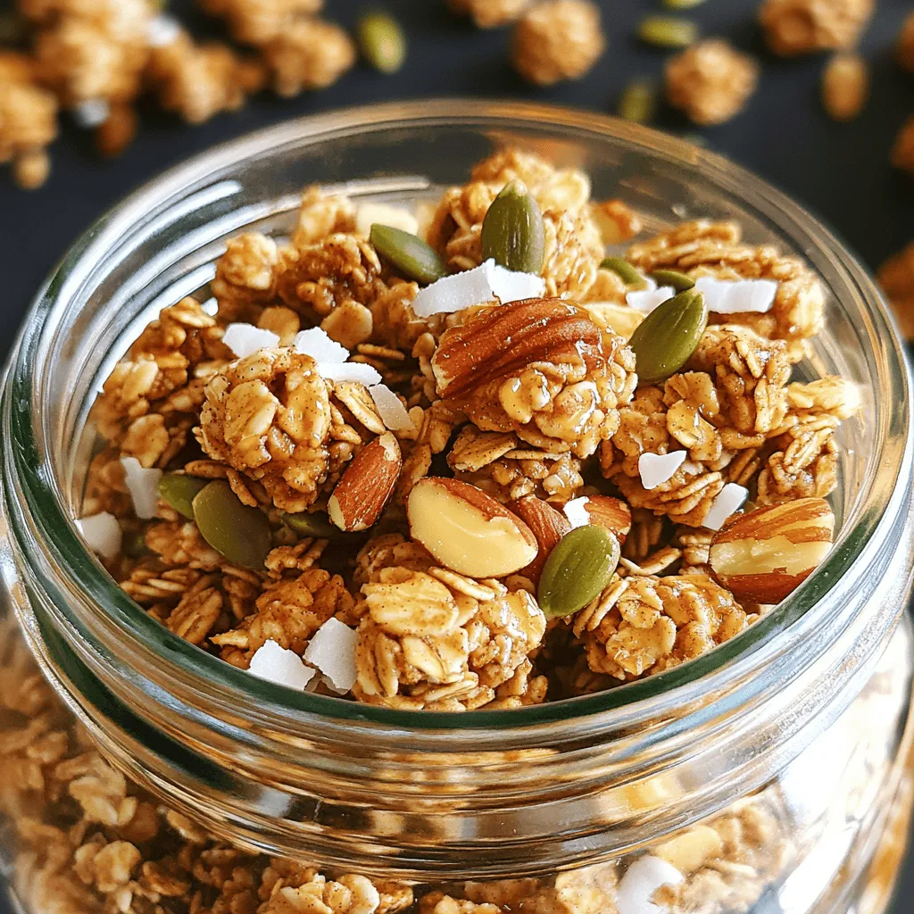- 3 cups rolled oats - 1 cup nuts (almonds, walnuts, or pecans), roughly chopped - 1/2 cup pumpkin seeds - 1/2 cup unsweetened coconut flakes - 1/3 cup pure maple syrup - 1/4 cup coconut oil, melted - 1 teaspoon pure vanilla extract - 1 teaspoon ground cinnamon - 1/2 teaspoon sea salt - 1/2 cup dried fruit (raisins, cranberries, or apricots), optional To make Slow Cooker Maple Cinnamon Granola Clusters, gather these ingredients. The rolled oats form the base. They provide fiber and a chewy texture. You can use any nuts you like. Almonds, walnuts, or pecans add crunch and healthy fats. Pumpkin seeds bring a nice crunch and extra nutrients. Unsweetened coconut flakes add a hint of sweetness and tropical flavor. Pure maple syrup serves as the sweetener. It gives a rich, natural taste. Melted coconut oil helps bind the mixture and adds healthy fat. Vanilla extract enhances the flavor. Ground cinnamon adds warmth and spice. A pinch of sea salt balances the sweetness. If you want, you can add dried fruit for extra flavor. Raisins, cranberries, or apricots work well. These ingredients combine to make a delicious and healthy snack. You’ll love how easy this recipe is! In a large bowl, combine 3 cups of rolled oats, 1 cup of roughly chopped nuts, and 1/2 cup of pumpkin seeds. You can use almonds, walnuts, or pecans—whichever you like best! Next, add 1/2 cup of unsweetened coconut flakes, 1 teaspoon of ground cinnamon, and 1/2 teaspoon of sea salt. Stir everything well until it is evenly mixed. This blend will be the base of your granola clusters. In another bowl, whisk together 1/3 cup of pure maple syrup, 1/4 cup of melted coconut oil, and 1 teaspoon of pure vanilla extract. Keep whisking until the mixture is smooth and slightly frothy. This sweet and fragrant blend will help bind all your dry ingredients together. Lightly grease the inside of your slow cooker with a bit of coconut oil or cooking spray. Then, pour the wet mixture over the dry ingredients. Use a spatula to fold everything together until all the oats and nuts are coated. Spread the mixture evenly in the slow cooker. Cover it with the lid and set the heat to low. Cook for about 2 to 2.5 hours, stirring every 30 minutes. This way, the granola cooks evenly and turns golden brown. Once the cooking time is up, turn off the slow cooker and let the granola cool for 30 minutes with the lid off. This cooling time is key! It helps the granola clump into tasty clusters. If you want to add dried fruit, wait until the granola is completely cool before you mix it in. Finally, transfer your granola clusters to an airtight container and store them for up to two weeks. Enjoy your delicious and crunchy treat! To make your granola clusters just right, stir the mixture every 30 minutes while it cooks. This helps the granola cook evenly and develop a nice golden color. If you like your clusters extra crunchy, you can adjust the cooking time. Try cooking for up to 3 hours instead of 2.5 hours. Just keep an eye on it to avoid burning. When serving, use a clear glass jar or a decorative bowl. This makes the clusters look inviting and fun. You can sprinkle extra coconut flakes on top for a finishing touch. Drizzle a bit of maple syrup over the top to enhance the flavor. For a yummy breakfast, pair it with yogurt or milk. This adds creaminess to the crunchy granola. Each ingredient offers great health benefits. Rolled oats are full of fiber, which helps digestion. Nuts provide healthy fats and protein, keeping you full longer. Pumpkin seeds are rich in magnesium. Coconut flakes add healthy fats and a bit of sweetness. Using pure maple syrup instead of refined sugar gives natural sweetness and minerals. Adding dried fruit can give extra vitamins and flavor. {{image_4}} You can boost the taste of your granola with spices and extracts. Try adding: - Nutmeg for warmth. - Ginger for a zesty kick. - Almond extract for a sweet touch. For sweetness, consider using: - Honey or agave syrup instead of maple syrup. These changes let you customize the flavor to your liking. If you need nut-free options, use seeds instead. Sunflower seeds or pumpkin seeds work great. For gluten-free alternatives, choose certified gluten-free oats. This way, everyone can enjoy your granola. You can switch up your granola based on the season. In autumn, add: - Chopped apples and a sprinkle of pumpkin spice. For summer, mix in: - Dried mango or pineapple for a tropical twist. These seasonal touches make your granola feel fresh and fun all year long! To keep your granola clusters fresh, use an airtight container. Glass jars work great. They help keep the granola crunchy and tasty. Make sure the lid seals tightly. If you use plastic, choose BPA-free options. This helps avoid any bad chemicals. For best freshness, store the granola in a cool, dry place. Avoid areas with heat or moisture, like near the stove. Always scoop the granola with a clean, dry spoon. This helps keep it safe from bacteria. Granola clusters last up to two weeks at room temperature. After that, they may lose crunch and flavor. If you want to store them longer, freezing is a great option. Place the clusters in a freezer-safe bag. Remove as much air as you can before sealing. They can last up to three months in the freezer. To enjoy frozen granola, let it thaw in the fridge. Or, you can enjoy it straight from the freezer for a crunchy snack. Just remember, the texture may change a bit after thawing. Yes, you can make this granola nut-free. Simply replace the nuts with more seeds. Use extra pumpkin seeds or sunflower seeds. You can also add more coconut flakes for texture. This way, you still get a tasty crunch without nuts. You can use different sweeteners. Honey is a great choice. Agave syrup works too. If you want a low-calorie option, try stevia or monk fruit sweetener. Just remember, the liquid amount may change, so adjust as needed. You can add many types of dried fruits. Raisins, cranberries, and apricots are grea