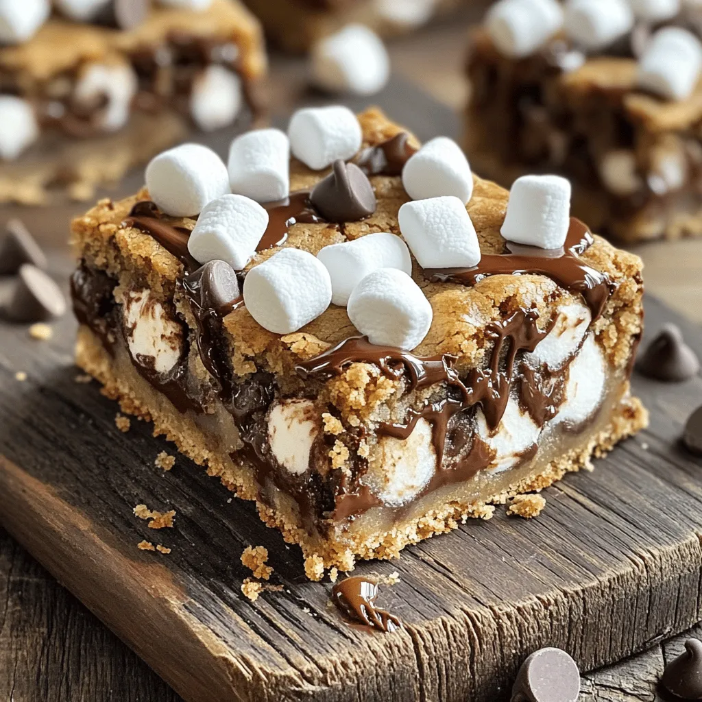 - 2 cups all-purpose flour - 1 teaspoon baking soda - ½ teaspoon salt - 1 cup unsalted butter, softened - 1 cup brown sugar, firmly packed - ½ cup granulated sugar - 2 large eggs, at room temperature - 2 teaspoons pure vanilla extract - 1 cup chocolate chips (milk or dark) - 1 cup mini marshmallows - 1 cup graham cracker crumbs - ½ cup additional chocolate chips for topping - Extra mini marshmallows for topping To make S'mores Chocolate Chip Cookie Bars, I love picking the right ingredients. The all-purpose flour gives the bars their structure. Unsalted butter adds richness and helps create a soft texture. Brown sugar and granulated sugar work together to sweeten the dough. Eggs and vanilla extract blend into the mix for a delicious flavor. Chocolate chips are the star of the show, while mini marshmallows and graham cracker crumbs give that classic s'mores taste. - Types of chocolate chips (milk vs. dark) - Variations in marshmallow types - Substitute options for dietary restrictions Feel free to switch up the chocolate chips! Milk chocolate offers a sweet flavor, while dark chocolate gives a rich taste. You can use flavored marshmallows for a twist. If you have dietary needs, try gluten-free flour or dairy-free butter. Making these bars your own is part of the fun! For the full recipe, check out the detailed instructions above. First, preheat your oven to 350°F (175°C). This step is key. A hot oven helps the bars bake evenly. Next, prepare a 9x13-inch baking pan. You can grease it lightly or use parchment paper. Parchment makes it easy to lift the bars out later. In a medium bowl, mix the dry ingredients. Combine 2 cups of flour, 1 teaspoon of baking soda, and ½ teaspoon of salt. Whisk them well. This step ensures that the baking soda and salt spread evenly. An even mix leads to consistent baking and flavor. In a large bowl, cream 1 cup of softened butter, 1 cup of brown sugar, and ½ cup of granulated sugar. Beat this mixture until it is light and fluffy. This should take about 3-4 minutes. A fluffy mixture traps air, helping the bars rise. Now, add 2 large eggs, one at a time, to the butter-sugar mix. Mix well after each egg. Then stir in 2 teaspoons of pure vanilla extract. Next, slowly add the dry mix to the wet mixture. Stir until just combined. Overmixing can make the bars tough, and we want them soft! Pour half of the cookie dough into the prepared pan. Spread it evenly across the bottom. Then, sprinkle 1 cup of chocolate chips and 1 cup of mini marshmallows over this layer. This creates a tasty s'mores filling. Use the remaining dough to drop spoonfuls over the filling. Press down gently to seal it. Bake in the preheated oven for 20-25 minutes. Check for doneness by looking for golden brown edges. The center should feel set but slightly soft. Once done, let the bars cool in the pan for about 10-15 minutes. After that, transfer them to a wire rack to cool completely. You can find the full recipe for S'mores Chocolate Chip Cookie Bars in the main article. To achieve the perfect texture in your S'mores chocolate chip cookie bars, focus on two key aspects: chewiness and crunchiness. If you want chewy bars, use less flour. This makes the dough moist and soft. A bit of extra butter helps too. For crunchier bars, add more flour and bake a little longer. This gives a firmer bite that complements the gooey chocolate and marshmallows inside. Try different baking times to find your ideal texture. Presentation matters! To enhance the look of your cookie bars, serve them on a rustic wooden board. This brings a cozy campfire vibe. For extra flair, sprinkle more mini marshmallows and chocolate chips on top. A quick drizzle of chocolate sauce adds a touch of elegance. You can even add a few graham cracker crumbs for a nice crunch. These small touches will make your dessert stand out. Baking can be tricky. Here are some common mistakes to watch out for. First, don’t skip greasing or lining your baking pan. This prevents sticking and makes removing the bars easier. Second, avoid overmixing the dough. This can lead to tough bars. Mix just until combined for a tender texture. Lastly, keep an eye on the baking time. Overbaking can dry out your bars. They should be golden around the edges and slightly soft in the middle. {{image_4}} You can change the flavors of your S'mores Chocolate Chip Cookie Bars in fun ways. For a richer taste, use dark chocolate chips instead of milk chocolate. You can even mix in flavored extracts like almond or coconut. This twist makes the bars unique and delightful. Get creative and add nuts or fruit to the mix. Chopped walnuts or pecans give a nice crunch. For a fruity twist, try dried cranberries or cherries. These options add texture and flavor to your bars, making them stand out. You can easily adapt this recipe for different diets. For a gluten-free version, swap all-purpose flour for a gluten-free blend. If you want to make them vegan, replace the eggs with flax eggs and use dairy-free chocolate chips. These changes let everyone enjoy this treat! For the full recipe, check the details above. Store your S'mores Chocolate Chip Cookie Bars in an airtight container. Use a glass or plastic container with a tight lid. These bars stay fresh for about a week at room temperature. If you want them to last longer, keep them in the fridge. They will remain good for up to two weeks when chilled. Freezing these bars is easy! First, let them cool completely. Then, wrap each bar tightly in plastic wrap. Place the wrapped bars in a freezer-safe bag or container. They can stay frozen for three months. When you're ready to enjoy them, thaw in the fridge overnight. Reheat in the microwave for a few seconds to bring back the gooey texture. Leftover bars can be fun! Try crumbling them over ice cream for a tasty sundae. You can also mix pieces into yogurt for a sweet treat. Another idea is to use them in a s'mores-inspired trifle. Layer crumbled bars with whipped cream and chocolat