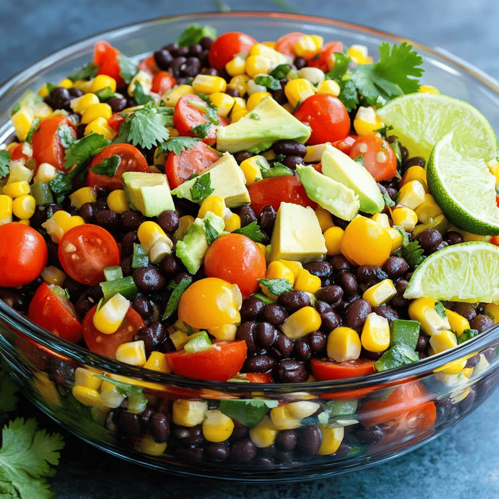 - 2 cups canned black beans, rinsed and drained - 1 cup corn kernels (fresh or thawed frozen) - 1 red bell pepper, diced - 1 small red onion, finely chopped - 1 ripe avocado, diced - 1 cup cherry tomatoes, halved - 1/4 cup fresh cilantro, chopped - 3 tablespoons freshly squeezed lime juice - 2 tablespoons extra virgin olive oil - 1 teaspoon ground cumin - 1 teaspoon chili powder - Salt and freshly ground black pepper For a vibrant Southwest Black Bean Salad, gather these fresh ingredients. The black beans add protein and fiber, making this dish filling. Corn adds a sweet crunch. The red bell pepper brings a pop of color and flavor. Chopped red onion gives a nice bite. Creamy avocado makes each bite smooth. Cherry tomatoes add freshness and juiciness. Lastly, cilantro adds a burst of herbaceous flavor. Now, let’s talk about the dressing. Fresh lime juice provides a zesty kick that brightens the salad. Extra virgin olive oil gives richness and a healthy fat source. Ground cumin and chili powder bring warmth and depth. Don’t forget to season with salt and freshly ground black pepper to taste. Make sure you check out the Full Recipe for exact measurements and detailed steps. Enjoy the freshness of this salad! - Start with a large mixing bowl. Add the rinsed black beans and corn. Stir them gently to mix. - Next, add the diced red bell pepper, chopped red onion, and halved cherry tomatoes. Mix lightly. - Carefully fold in the diced avocado and chopped cilantro. Take care not to mash the avocado. - In a small bowl, whisk together the lime juice, olive oil, ground cumin, and chili powder. Mix until smooth. - Drizzle the dressing over the salad ingredients. Toss everything gently to coat well. - Season the salad with salt and freshly ground black pepper to taste. Adjust the flavors as needed. - Cover the salad and refrigerate for at least 30 minutes. This allows the flavors to meld beautifully. You can find the full recipe above to guide you through the steps! To make your Southwest Black Bean Salad shine, consider these simple steps. - Recommended garnishes: Fresh cilantro and lime wedges add zest. You can also sprinkle some queso fresco for a creamy touch. - Importance of resting time: Let the salad chill in the fridge for at least 30 minutes. This resting time helps the flavors blend well. You will taste the difference! Pair your salad with grilled chicken or shrimp for a tasty meal. It also goes well with tortilla chips for a fun snack. For presentation, use a clear glass bowl to show off the colorful ingredients. A vibrant salad invites everyone to dig in. Add some extra cilantro on top for a fresh look. {{image_4}} You can easily change some ingredients to fit your taste. Adding different beans or legumes can change the flavor. For example, try pinto beans or chickpeas for a new twist. You can also add other vegetables. Sliced jalapeños give heat, while cucumbers add crunch. Be creative! Making this salad vegan-friendly is simple. All the main ingredients are already plant-based. Just ensure your dressing uses vegan oil. If you need gluten-free options, this salad is naturally gluten-free. Check any additional ingredients like dressings or toppings to keep it safe. Enjoy this dish without worry! To store leftovers, place the salad in an airtight container. This keeps it fresh for up to three days. If you want to enjoy the salad later, avoid adding the dressing until you're ready to eat. This helps the ingredients stay crisp. Store the dressing separately in a small jar. When you're ready to eat, just pour it over the salad and mix it well. You can freeze this salad, but it changes the texture. If you want to freeze it, skip the avocado, tomatoes, and cilantro. These ingredients do not freeze well. Instead, pack the black beans, corn, and peppers in a freezer-safe bag. When you want to eat it, thaw it overnight in the fridge. Then, add the fresh ingredients and dressing. This way, you keep that tasty, fresh flavor. - Prep time: 15 minutes - Total time: 45 minutes Yes, you can make this salad ahead of time. I recommend preparing it a few hours before serving. This will let the flavors blend well. Just cover it and keep it in the fridge. Absolutely! You can change the salad to fit your tastes. Here are some ideas: - Swap black beans for pinto or kidney beans. - Add jalapeños for some heat. - Toss in diced cucumbers for crunch. - Replace the avocado with diced mango for a sweet twist. Feel free to mix and match ingredients to find your perfect flavor! For the full recipe, check out the Zesty Southwest Black Bean Salad. This blog post covered a tasty Southwest Black Bean Salad. You learned about the fresh ingredients, how to prepare the salad and dressing, plus tips for flavor and serving. Make it your own with ingredient swaps or dietary changes. Store leftovers properly to keep it fresh. Now it’s time to enjoy this colorful dish at your next meal. I hope you get creative and have fun making it!