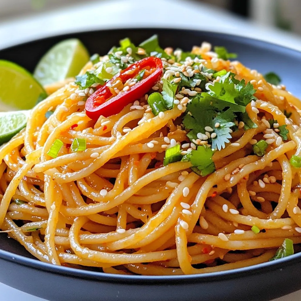 Transfer the dressed noodles to serving plates, artfully garnishing with fresh cilantro leaves on top for a pop of color and freshness. Serve with lime wedges on each plate, allowing your guests to squeeze a bit of lime juice over their portion for an added zing of flavor.