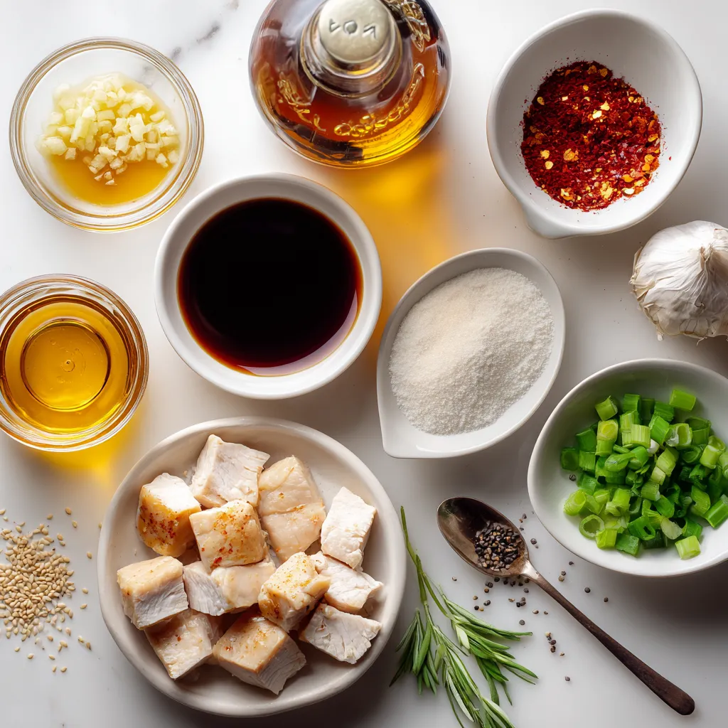 The main ingredient is chicken. I use boneless, skinless chicken breasts cut into bite-sized pieces. This makes them easy to eat and quick to cook. The other key component is the sauce, which combines honey, garlic, soy sauce, and red pepper flakes. This blend gives the dish its sweet and spicy kick.