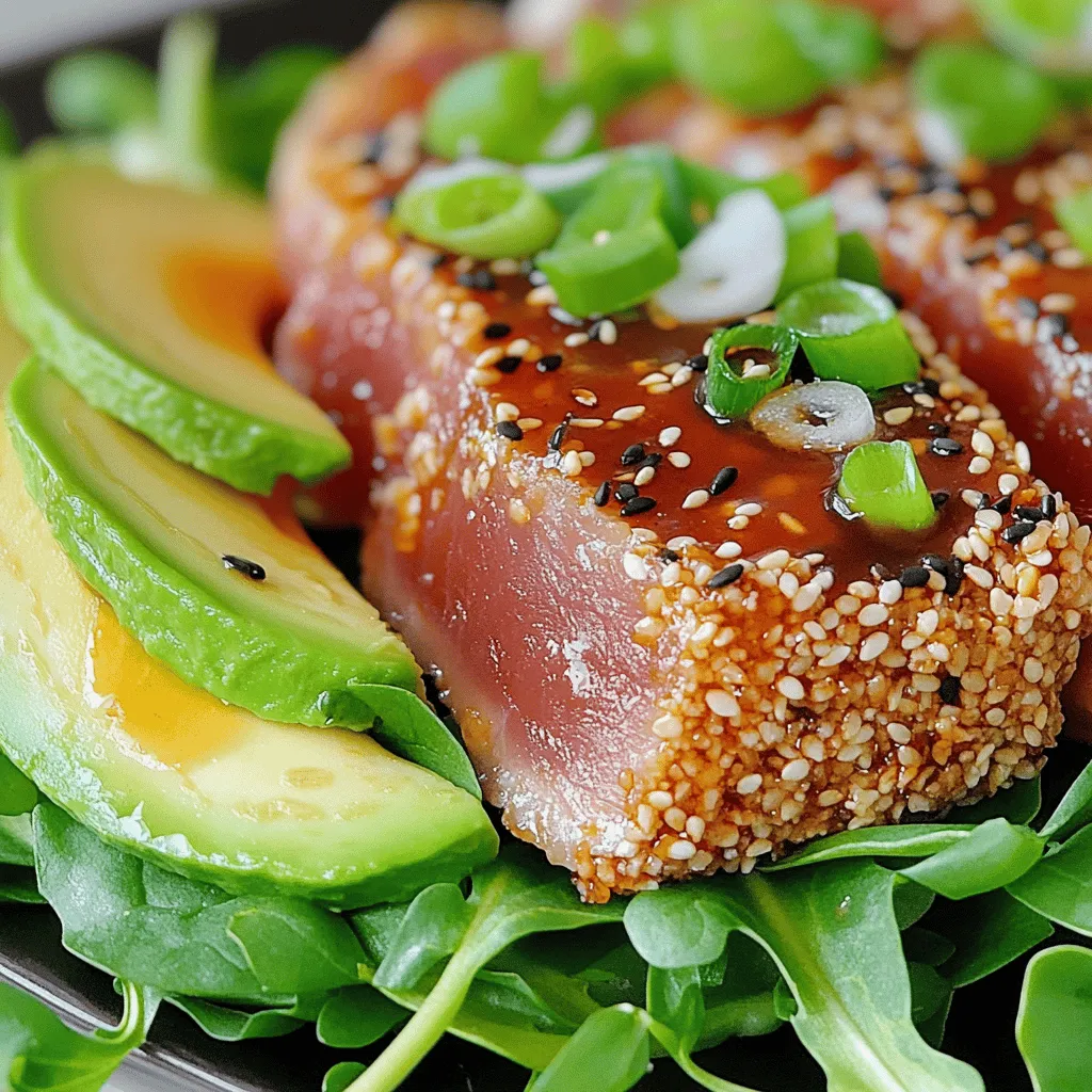 - 2 Ahi tuna steaks (approximately 6 oz each) - 1/4 cup mixed sesame seeds (black and white) - 1 tablespoon soy sauce - 1 tablespoon sriracha sauce - 1 tablespoon extra virgin olive oil - 1 teaspoon freshly grated ginger - 1 clove garlic, minced - Sea salt and freshly cracked black pepper to taste - 2 green onions, thinly sliced (for garnish) - 1 ripe avocado, thinly sliced (for serving) - 2 cups fresh mixed greens (for serving) - Additional herbs for garnish (cilantro, mint) - Avocado dressing or vinaigrette - Rich in Omega-3 fatty acids - High protein content - Low in calories Ahi tuna is a star in this dish. It’s not just tasty; it's also healthy. Ahi tuna gives you omega-3 fats, which are good for your heart. Each steak is packed with protein, which helps you feel full. Plus, it's low in calories, making it a great choice. The sesame seeds add a nice crunch. They also bring healthy fats and nutrients. Using both black and white seeds makes the dish look pretty too. The soy sauce and sriracha give a spicy and savory kick. Fresh ginger and garlic add depth to the flavor. Don’t forget the avocado! It’s creamy and balances the dish. Mixed greens add freshness and color. You can use any greens you like, such as spinach or arugula. For a special touch, you can add herbs like cilantro or mint. A drizzle of vinaigrette or avocado dressing can enhance the flavors even more. This dish is not just quick; it's also colorful and full of flavor. - Combine marinade ingredients in a bowl. - Marinate Ahi tuna steaks for 15 minutes. Start by mixing the soy sauce, sriracha, olive oil, ginger, garlic, sea salt, and black pepper in a small bowl. Whisk until smooth. This mixture adds a spicy kick and depth to the tuna. After mixing, place your Ahi tuna steaks in a shallow dish. Pour the marinade over them, making sure they are well coated. Let them soak up the flavors for about 15 minutes. - Press tuna steaks into sesame seeds. - Sear tuna steaks in a skillet for 1-2 minutes per side. - Rest and slice the tuna against the grain. Once the tuna has marinated, take it out and press each steak into the mixed sesame seeds. This creates a nice crust. Next, heat a non-stick skillet over medium-high heat. Drizzle a bit of olive oil into the pan. Carefully add the sesame-crusted tuna steaks. Cook them for about 1 to 2 minutes on each side. This gives a nice sear, while keeping the inside rare. After cooking, let the tuna rest for about a minute. Then, slice it thinly against the grain to keep it tender. - Arrange mixed greens and avocado on plates. - Garnish with green onions. For a beautiful plate, start by placing a handful of fresh mixed greens on each plate. Next, add thin slices of ripe avocado beside the greens. Finally, fan out the sliced Ahi tuna on top. To finish, sprinkle thinly sliced green onions over the dish. This adds color and a burst of flavor. Enjoy your spicy sesame crusted Ahi tuna! For the perfect sear on your Ahi tuna, the cooking time is key. Sear each side for 1-2 minutes for a rare finish. If you prefer it more cooked, add 30 seconds to each side. Keep a close eye while cooking. Overcooking can dry out the tuna. The goal is a warm center with a nice crust. To prevent overcooking, make sure your skillet is hot before adding the tuna. This helps create a quick sear, locking in moisture. Use a non-stick skillet to ensure a smooth flip. Trust me, a little patience goes a long way here! Marinating Ahi tuna is easy. Combine soy sauce, sriracha, olive oil, ginger, and garlic. Let the tuna soak for 15 minutes. This time allows the flavors to seep in without overpowering the fish. If you want to switch things up, try different marinades. You can substitute soy sauce with tamari for a gluten-free option. Add some lime juice for a zesty kick, or swap sriracha for a sweeter sauce like teriyaki. A beautiful plate makes food more appealing. For an elegant look, layer your Ahi tuna in a fan shape on a large white dish. This lets the colors pop. Next, add avocado slices on the side. The green from the avocado pairs well with the pink tuna. For an extra touch, drizzle any leftover marinade over the mixed greens. This adds flavor and makes the dish visually appealing. Remember, we eat with our eyes first! {{image_4}} You can make the Spicy Sesame Crusted Ahi Tuna even more exciting. One way is to add extra chili flakes to the sesame crust. This gives your tuna an extra kick. If you prefer sweetness, try a sweet sesame variant. Just add a hint of honey to the marinade. This balances the heat and adds a nice flavor. Serving Ahi tuna with different greens can change the meal. You can use arugula for a peppery taste or spinach for a mild flavor. Pairing the tuna with jasmine rice is also a great idea. The soft rice soaks up the juices, making every bite delicious. For those who need gluten-free options, use tamari instead of soy sauce. This keeps all the flavor without the gluten. If you want a vegan alternative, try using tofu instead of tuna. Press the tofu to remove water and follow the same steps for marinating and searing. This way, everyone can enjoy a tasty meal! To keep your spicy sesame crusted Ahi tuna fresh, store it in the fridge. Use an airtight container for best results. Place a piece of parchment paper between the tuna and the lid to absorb moisture. This method helps maintain flavor and texture. You can safely consume leftovers for up to two days. After that, the quality may decline. Always check for any off smells or changes in texture before eating. When reheating Ahi tuna, aim to keep it moist. The best way is to use the stovetop. Heat a non-stick pan over low heat. Add a drop of oil and place the tuna in the pan. Heat for just a minute on each side. This method helps preserve the texture. Avoid using the microwave, as it can dry out the tuna. If you must use it, cover the tuna with a damp paper towel to keep moisture in. Yes, you can freeze raw Ahi tuna. Wrap each steak tightly in pla