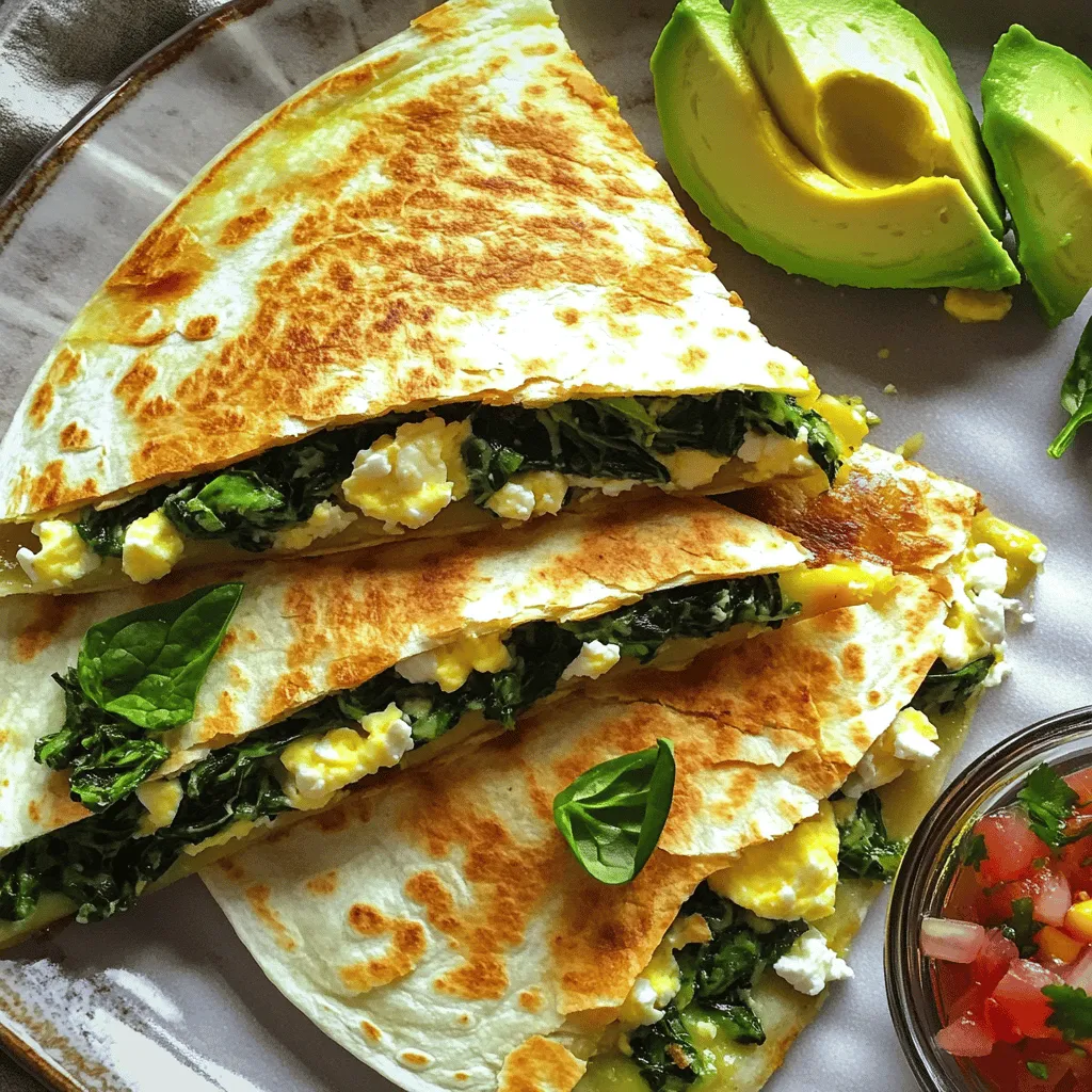 To make the Spinach Feta Breakfast Quesadilla, gather these simple ingredients: - 4 large flour tortillas - 2 cups fresh spinach, roughly chopped - 1 cup feta cheese, crumbled - 4 large eggs - 1/4 cup milk - 1 small onion, finely diced - 1 clove garlic, minced - 1 tablespoon olive oil - Salt and pepper to taste - Optional: Sliced avocado, salsa, or hot sauce for serving The measurements are key to make this dish work. Use large tortillas to hold all the filling. Fresh spinach is best, as it wilts perfectly. Crumbled feta brings a tangy taste that blends well with eggs. The eggs and milk create a fluffy texture. Use a small onion and a single clove of garlic for just the right amount of flavor. Olive oil keeps everything from sticking and adds richness. Adjust salt and pepper to your liking. Feel free to get creative! You can add sliced avocado for creaminess. Fresh salsa can give a zesty kick. Hot sauce adds heat if you like it spicy. These extras can make your quesadilla even tastier. You can also try different herbs or spices, like oregano or chili powder, to add more flavor. Don’t hesitate to experiment and find your perfect blend! To make the Spinach Feta Breakfast Quesadilla, start by sautéing the onion. Heat olive oil in a large skillet over medium heat. Once it's hot, add the diced onion. Cook it for about 3-4 minutes until it looks soft and clear. Then, stir in the minced garlic and chopped spinach. Cook this mix for 2-3 minutes until the spinach wilts. Season it with salt and pepper. Then, take the skillet off the heat and set it aside. Next, prepare the egg mixture. Crack the eggs into a bowl and add the milk. Whisk them together until they look light and frothy. Pour this mix into the skillet with the spinach. Cook over low heat, stirring gently. This should take about 3-4 minutes. You want the eggs to be soft and creamy. Now, it's time to assemble the quesadillas. Lay out two tortillas on a flat surface. Spoon the egg and spinach mix on one half of each tortilla. Sprinkle the crumbled feta cheese on top. Then, fold the tortillas over to create a half-moon shape. For cooking, clean the skillet and return it to medium heat. Place the folded quesadillas in the skillet. Cook each side for 3-4 minutes until they are golden brown and crispy. You might need to cook them in batches if your skillet is small. Finally, remove the quesadillas from the pan. Let them cool for a minute before slicing them into wedges. - Sauté the Aromatics: Use medium heat to avoid burning the onions. - Incorporate the Spinach: Make sure to stir often so nothing sticks to the pan. - Prepare the Egg Mixture: Use fresh eggs for the best flavor. - Cook the Eggs: Stir gently to keep the eggs soft and creamy. - Assemble the Quesadillas: Use enough filling but don’t overstuff to avoid spills. - Cook the Quesadillas: Press down slightly for even cooking. - Serve and Enjoy: Let cool slightly to avoid burns while eating. - Prep Time: About 10 minutes to chop and measure your ingredients. - Cooking Time: Approximately 15 minutes for cooking and assembling. - Total Time: You’ll need around 25 minutes from start to finish. - Servings: This recipe makes 4 quesadillas, enough for two people. For more details, you can check the Full Recipe. To get the best texture for your quesadilla, focus on the heat. Use medium heat to cook them. This gives the outside a nice crunch while keeping the inside soft. Make sure your tortillas are fresh. If they are stale, they won’t crisp up well. You can also try warming them slightly before filling. This makes them more flexible and easier to fold. Adding a few extras can make your quesadilla shine. Consider mixing spices into the egg mixture. A pinch of paprika or cumin can add depth. You can also try fresh herbs like cilantro or parsley for a burst of flavor. If you want a kick, add some chopped jalapeños or a dash of hot sauce. Remember, you can always serve it with salsa or avocado for extra taste. Many home cooks struggle with quesadilla filling. Don’t overfill your tortillas. This can lead to messy quesadillas that fall apart. Aim for a balance of ingredients without overstuffing. Also, avoid cooking on high heat. This can burn the outside while leaving the inside cold. Lastly, let your quesadillas rest for a minute after cooking. This helps the cheese set, making them easier to slice. For the full recipe, check the instructions above. {{image_4}} If you want to keep this dish vegetarian, you have many options. You can add mushrooms for a savory bite. Bell peppers add sweetness and color. Zucchini brings moisture and texture. Also, try adding a mix of herbs like basil or cilantro for fresh flavors. To add protein, consider chicken or turkey. Cook the meat first, then add it to the quesadilla. You can also use black beans or chickpeas for a plant-based protein. These options make the meal more filling while keeping it tasty and healthy. You can change the flavor profile easily. Add spices like cumin or paprika to the egg mixture. For a spicy kick, toss in diced jalapeños. If you like it cheesy, mix in mozzarella or cheddar with the feta. These tweaks let you make each quesadilla unique. For the full recipe, check out Spinach Feta Breakfast Quesadilla. You can keep your leftover quesadillas in the fridge. Place them in a tight container. They will stay fresh for up to three days. If you want to keep them longer, freezing is a good option. To reheat, use a skillet over medium heat. Cook each quesadilla for about 3-4 minutes on each side. This method keeps them crispy. You can also use the microwave, but they might get soft. Heat them on a plate for about 30-60 seconds. To freeze, let the quesadillas cool completely. Wrap each one in plastic wrap. Then, place them in a freezer bag. They can stay in the freezer for up to a month. When you are ready to eat, thaw them overnight in the fridge before reheating. You will love how fresh they taste! For the full recipe, check out 