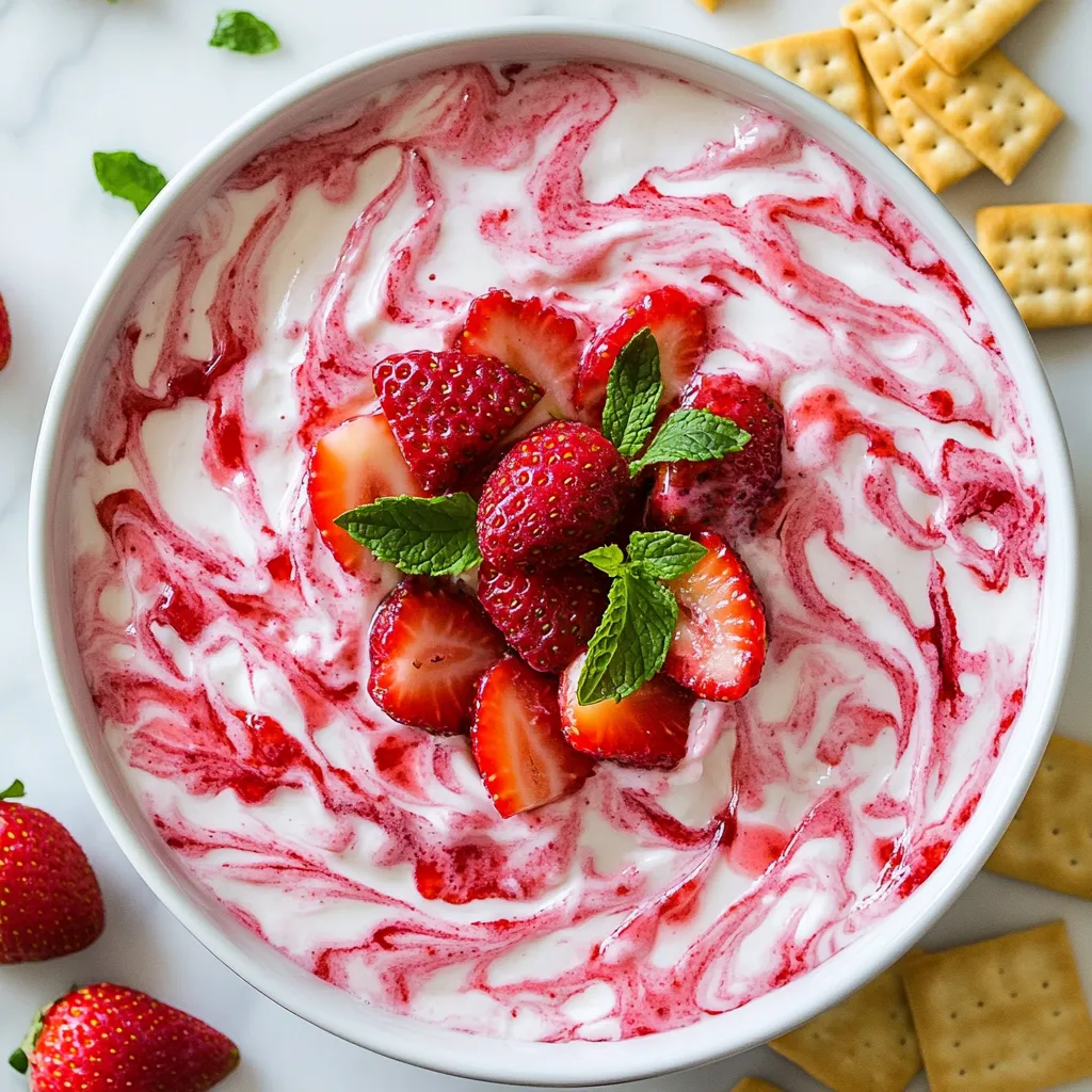 - 1 cup cream cheese, softened to room temperature - 1/2 cup powdered sugar, sifted - 1 teaspoon pure vanilla extract - 1/4 cup sour cream - 1 1/2 cups fresh strawberries, hulled and finely chopped - 1/4 cup strawberry jam - Fresh mint leaves for garnish (optional) To create this strawberry cheesecake dip, you need a few simple ingredients. First, the cream cheese gives the dip its rich base. Make sure it is soft. This helps it mix well. Next, powdered sugar adds sweetness. You can sift it to avoid lumps. Vanilla extract gives a warm, sweet taste. Sour cream adds creaminess and a slight tang. The fresh strawberries bring bright flavor and texture. It’s best to chop them finely. Strawberry jam enhances the fruity notes and adds sweetness. For garnishing, fresh mint leaves add color and a nice smell. You can use graham crackers or vanilla wafer cookies for dipping. They pair perfectly with the dip’s creamy texture. Enjoy making this easy and tasty treat! {{ingredient_image_2}} 1. Mixing cream cheese and powdered sugar Start with a medium bowl. Add 1 cup of softened cream cheese and 1/2 cup of sifted powdered sugar. Use an electric mixer on medium speed. Beat until the mix is smooth and creamy. Make sure there are no lumps. This step forms the base of your dip. 2. Incorporating vanilla extract and sour cream Next, add 1 teaspoon of pure vanilla extract and 1/4 cup of sour cream to the bowl. Lower the mixer speed. Mix until you see a velvety texture. This adds a rich flavor and creaminess to your dip. 3. Folding in strawberries and jam Now, take 1 1/2 cups of finely chopped fresh strawberries and 1/4 cup of strawberry jam. Gently fold them into the mixture using a spatula. Be careful not to overmix. You want to see swirls of red and pink. The fresh strawberries should stay chunky for a nice bite. 4. Adjusting sweetness to taste After mixing, taste your dip. If you want it sweeter, you can add more powdered sugar or jam. Mix it in gently. This step helps you make the dip just right for your taste. 5. Transferring dip to a serving bowl Finally, scoop the dip into a charming serving bowl. For a special touch, you can garnish with whole strawberries and fresh mint leaves. This makes your dip look even more inviting. Now your Strawberry Cheesecake Dip is ready! Serve it with graham crackers or vanilla wafer cookies for dipping. Enjoy this simple and creamy treat! - Best practices for softening cream cheese: To soften cream cheese, take it out of the fridge. Let it sit for about 30 minutes. You can also cut it into small cubes. This helps it soften faster. If you’re in a hurry, use a microwave. Heat it for about 10 seconds. Check it to avoid melting. - How to achieve the perfect swirl with strawberries: When adding strawberries, fold gently. Use a spatula to mix in the chopped strawberries and jam. Stir until you see a nice blend of colors. Avoid overmixing so the strawberry pieces stay chunky. This gives your dip a beautiful look. - Serving suggestions for dips and garnishes: Serve your dip in a fun bowl. Use a colorful plate to catch the eye. Add whole strawberries on top for flair. Fresh mint leaves make it look fancy too. For dippers, graham crackers or vanilla wafers work well. You can even use sliced fruit for a healthy twist. Pro Tips Use Room Temperature Ingredients: Make sure your cream cheese is softened to room temperature for a smooth and creamy dip. This prevents lumps and ensures a velvety texture. Choose Fresh Strawberries: Opt for ripe, fresh strawberries for the best flavor. Look for berries that are bright red and fragrant for a sweet and juicy addition to your dip. Adjust Sweetness to Taste: Feel free to tweak the sweetness by adding more powdered sugar or strawberry jam based on your personal preference. A taste test is key! Chill Before Serving: For maximum flavor, let the dip chill in the refrigerator for about 30 minutes before serving. This allows the flavors to meld beautifully. {{image_4}} You can change the flavor of this dip easily. Try using different fruits. Blueberries or raspberries can give a new taste. Simply chop them up and mix them in. Each fruit adds a fun twist. Adding citrus zest is another great way to boost flavor. Lemon or lime zest can brighten the dip. Just a little bit can make a big difference. The zest adds a fresh kick that pairs well with the sweetness. If you need a dairy-free or vegan option, you can still enjoy this dip. Use vegan cream cheese and dairy-free sour cream. These swaps will keep the creamy texture without the dairy. You can still use fresh fruits and jams to keep the flavor rich. Enjoy your treat while staying true to your dietary needs! To keep your Strawberry Cheesecake Dip fresh, store it in the fridge. Use an airtight container to seal in flavor and moisture. This dip stays good for about three days when refrigerated. If you want to freeze it, you can. Just place the dip in a freezer-safe container. Make sure to leave some space at the top, as it may expand when frozen. The dip can be stored in the freezer for up to a month. When you're ready to eat it again, let it thaw in the fridge overnight. After thawing, stir it well before serving. This dip tastes best fresh, so try to enjoy it soon after making it! Yes, you can make this dip ahead of time. It stays fresh in the fridge for up to two days. Just cover it well with plastic wrap. This makes it easy for parties or gatherings. When you're ready to serve, just give it a quick stir. You can use many things for dipping. Try pretzels for a salty crunch. Fresh fruit like apple slices or banana chunks work well too. You can even use cookies like shortbread. Each option adds a unique touch to the dip. To make the dip less sweet, you can add more cream cheese or sour cream. This will balance the sugar. You can also lower the amount of powdered sugar or strawberry jam. Always taste as you go. Adjust it until it fits your taste. This blog post walked you through making a tasty Stra