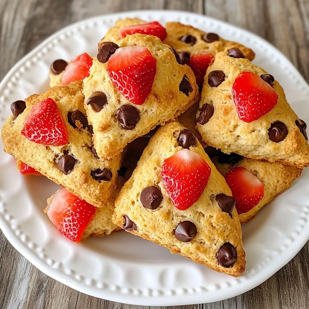 Delicious scones filled with fresh strawberries and semi-sweet chocolate chips, perfect for breakfast or a sweet treat.