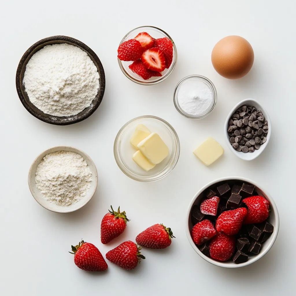 To make these Strawberry Chocolate Chip Scones, gather all the ingredients first. You will need two cups of all-purpose flour. This is the base for your scones. Add a quarter cup of granulated sugar to sweeten them just right. Baking powder helps the scones rise, so use one tablespoon. A little salt, only half a teaspoon, will balance the flavors.